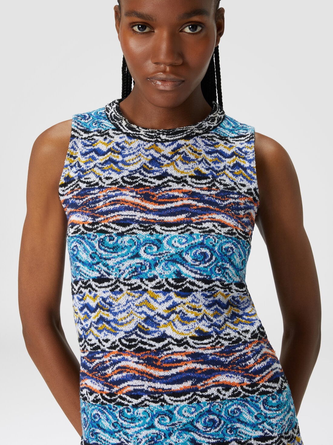 The season's novelty pattern, the jacquard motif of the waves, animates the wool and cotton knit surface of the sleeveless crewneck dress, with a clean and linear cut. A perfect garment for original and unmistakable day-to-night looks.