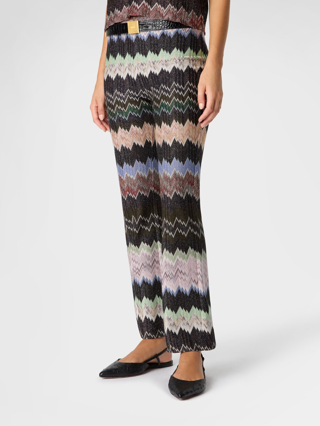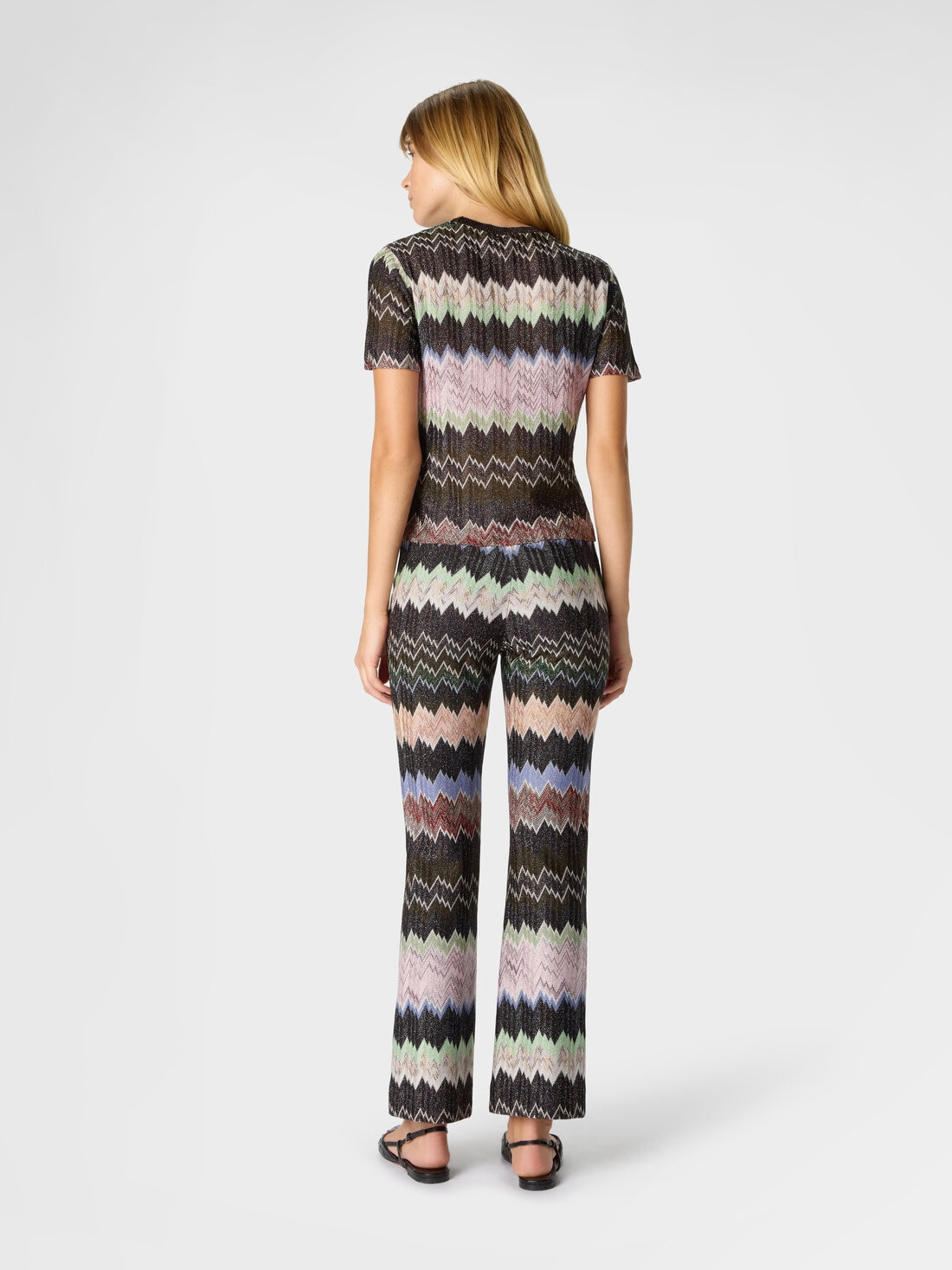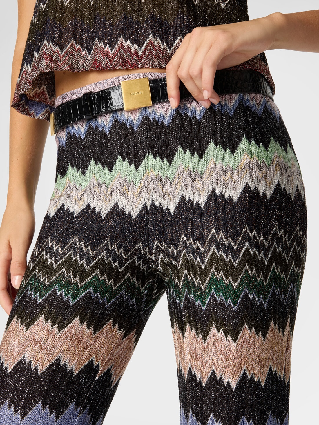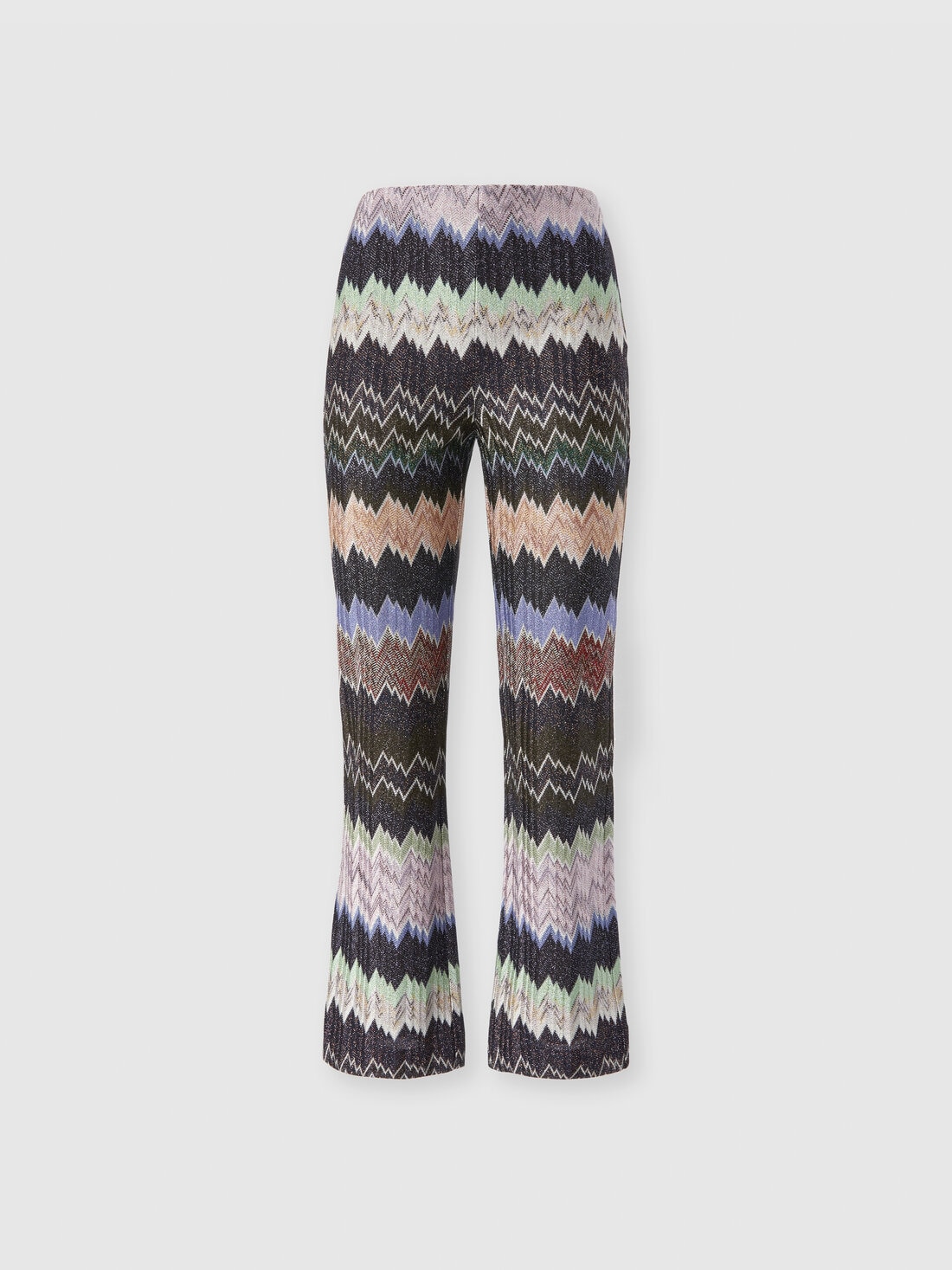 Modern and sophisticated elegance defines these cropped flared women’s trousers in viscose lamé, featuring an elasticated waistband and raschel workmanship with a snake motif. A piece that harmoniously interprets style, comfort, and refinement in true Missoni spirit.