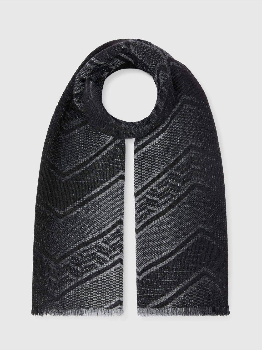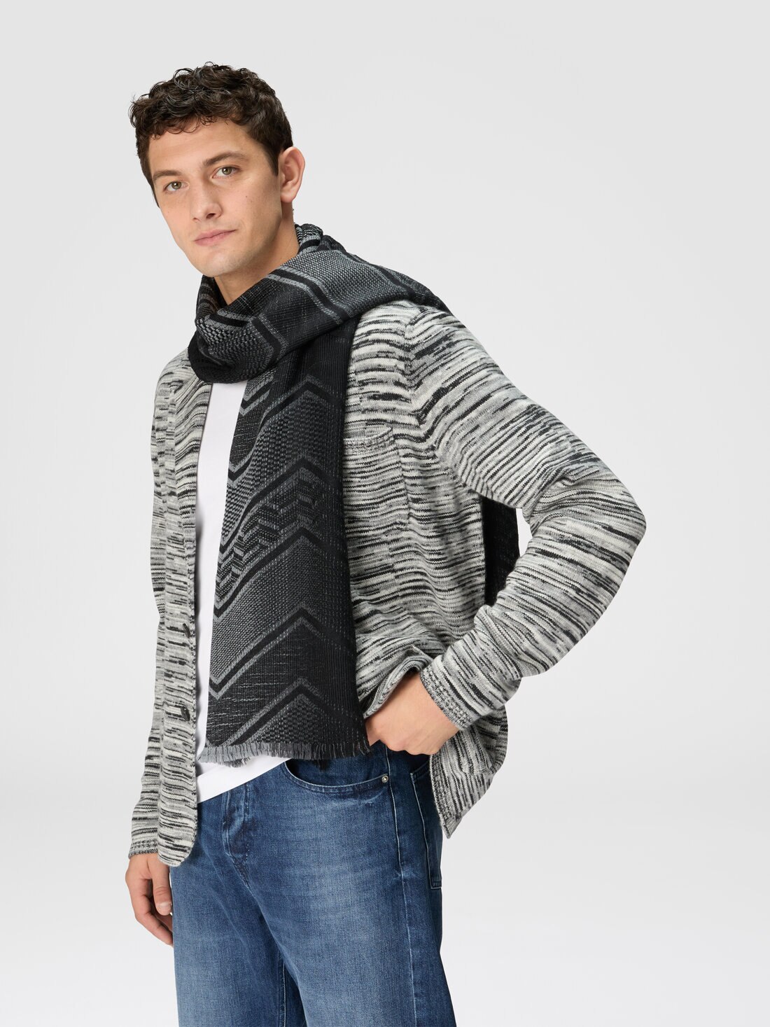 A refined complement to the look, even for the most formal: here is the men's wool stole by Missoni. Animated by the geometric pattern, it is finished with a frayed edge.