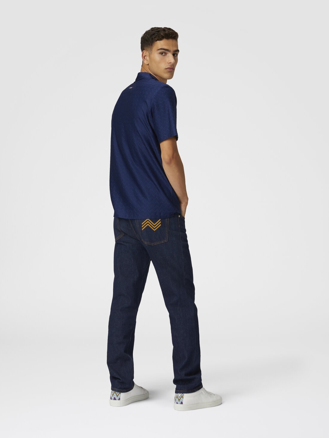 The sophisticated texture of this cotton jersey polo shirt is enhanced by the tone-on-tone zigzag jacquard workmanship. A regular fit that captures the essence of Missoni's design, where the simplicity of the silhouette meets the richness of the textile in a harmonious balance.