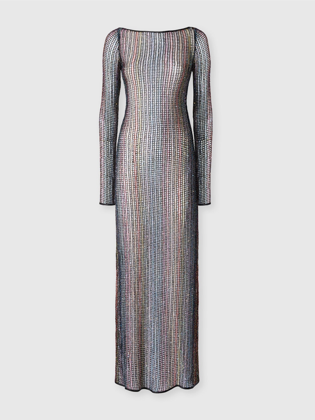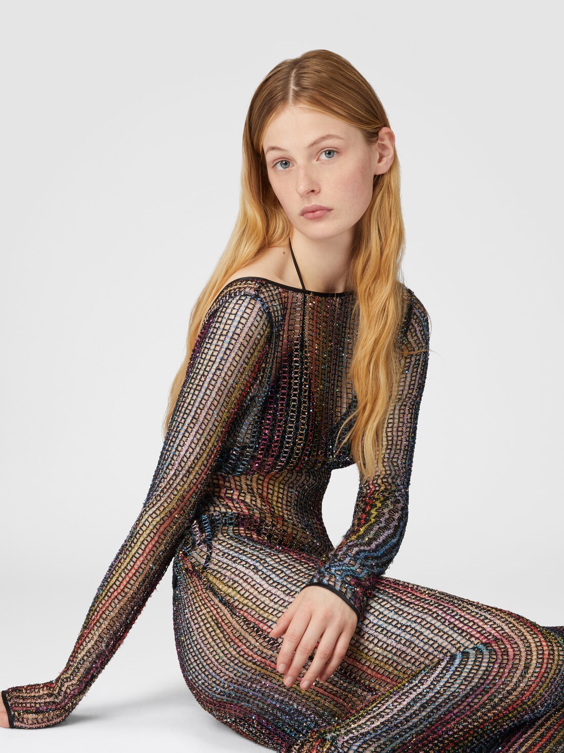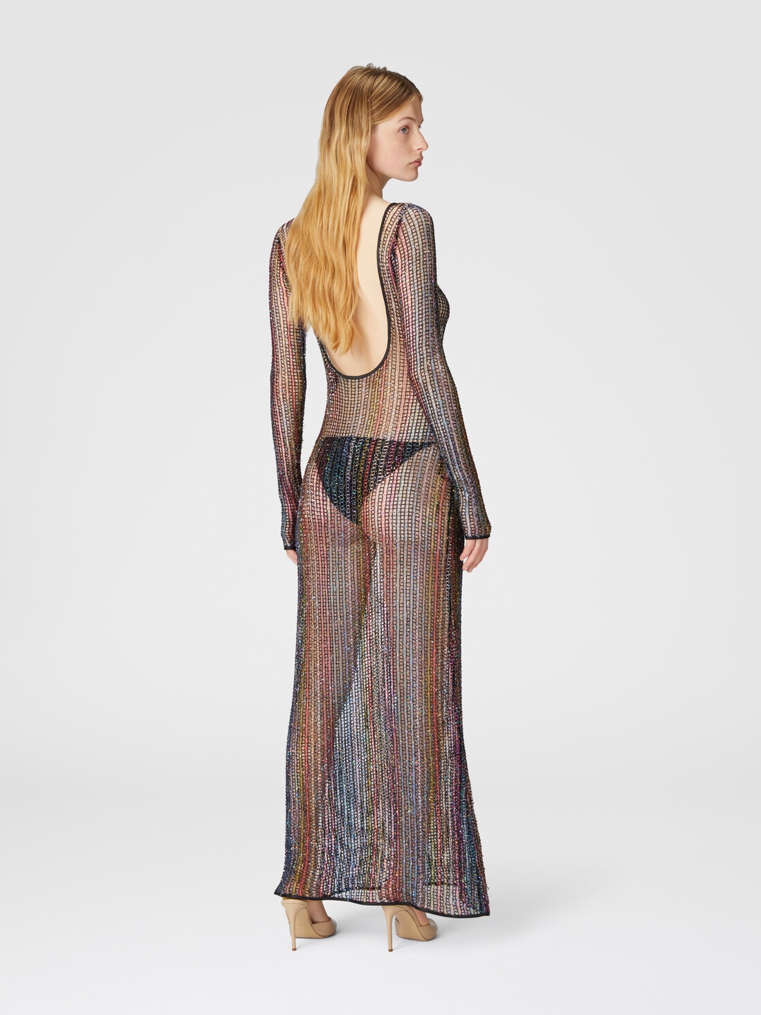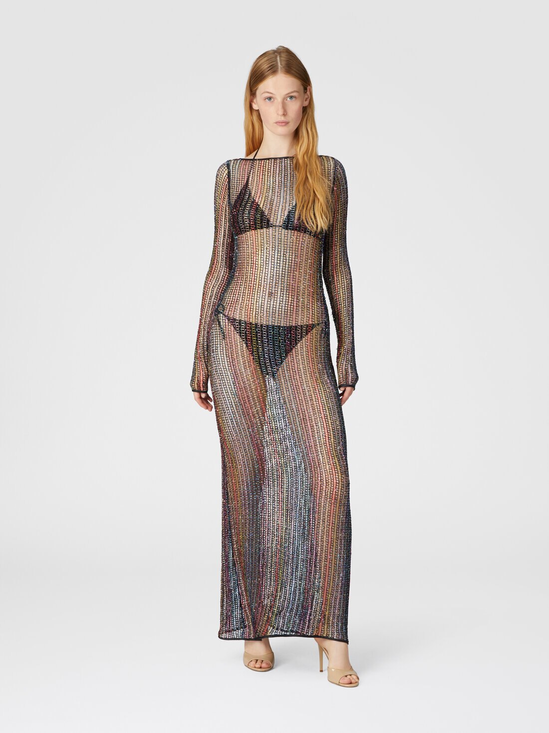 A piece that plays with transparency: the long cover-up in mesh wraps the body with a seductive see-through effect. The open back, long sleeves, and sequins add a sophisticated and glamorous touch.