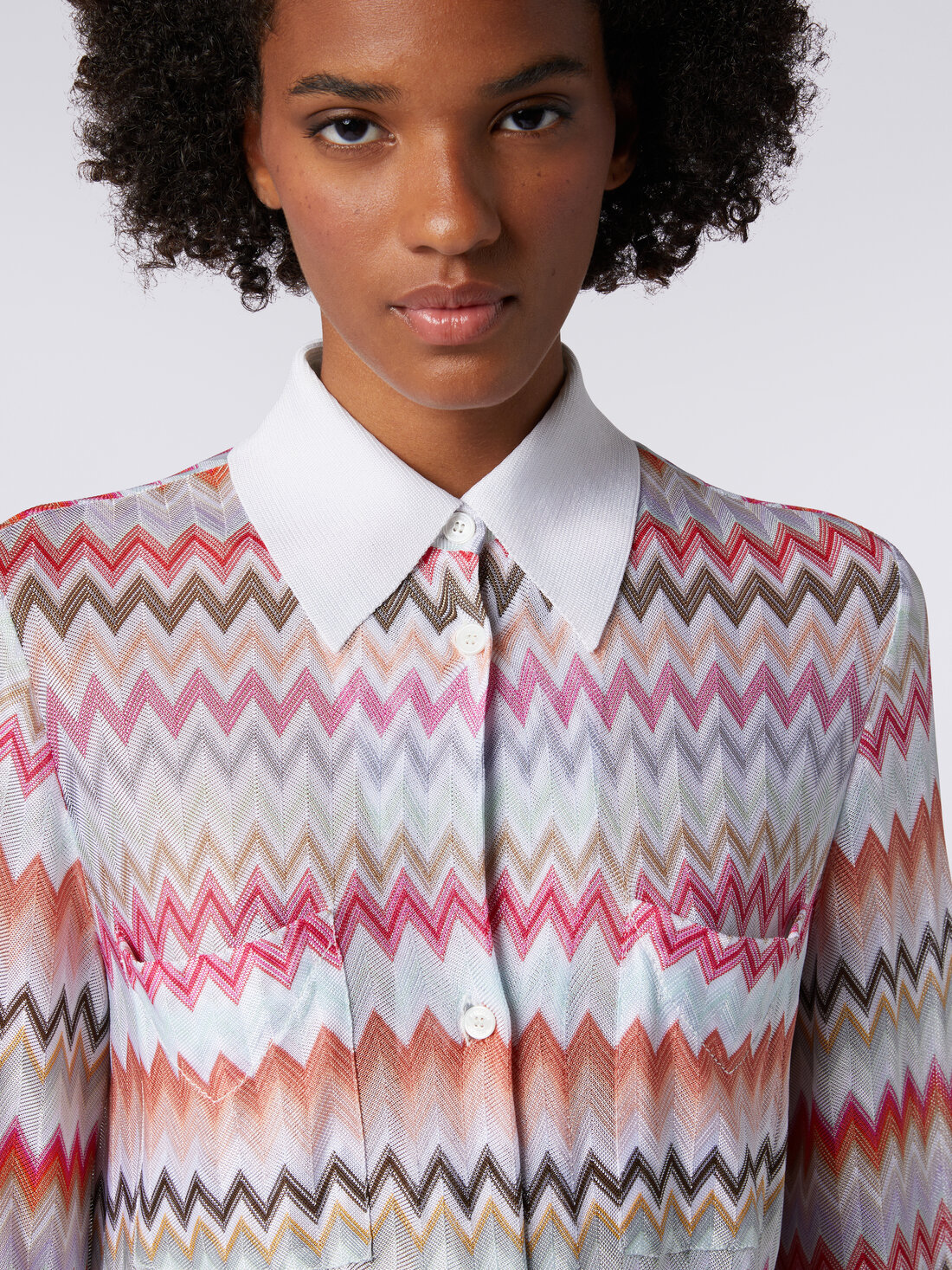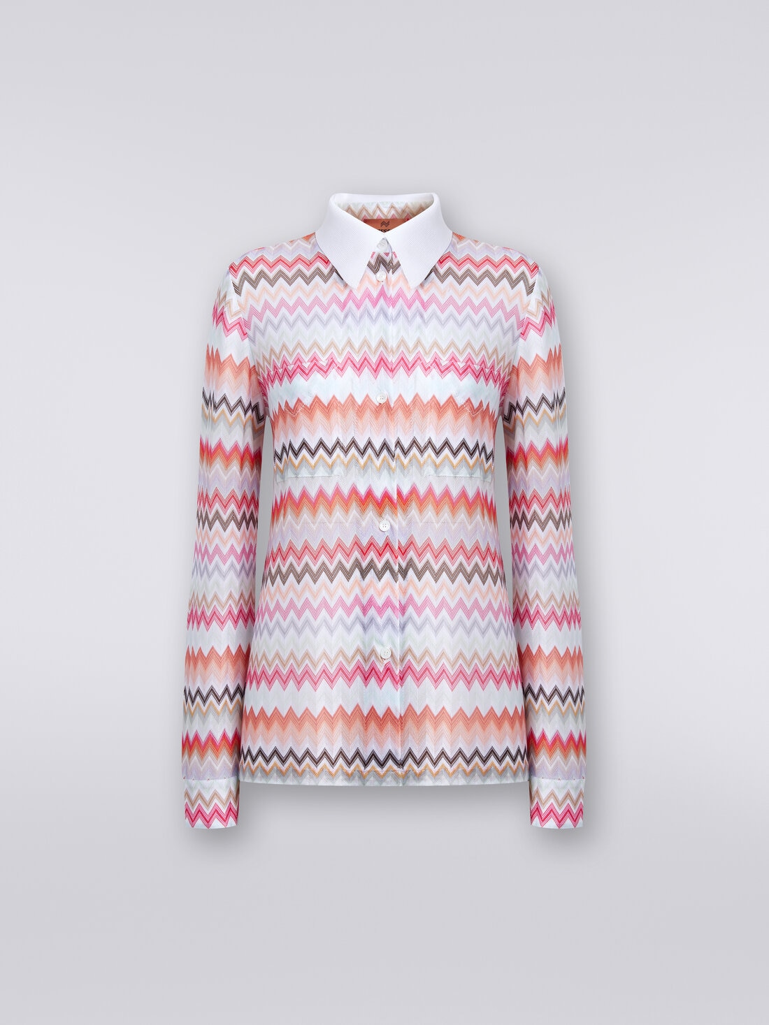 Taking a classic garment, such as the women’s long-sleeved shirt, and making a completely new version of it: that’s what Missoni does with this viscose and cotton blend piece. Animated by the zigzag pattern and distinguished by the contrasting collar and the application of two pockets on the front, it will add a touch of elegance to any outfit.