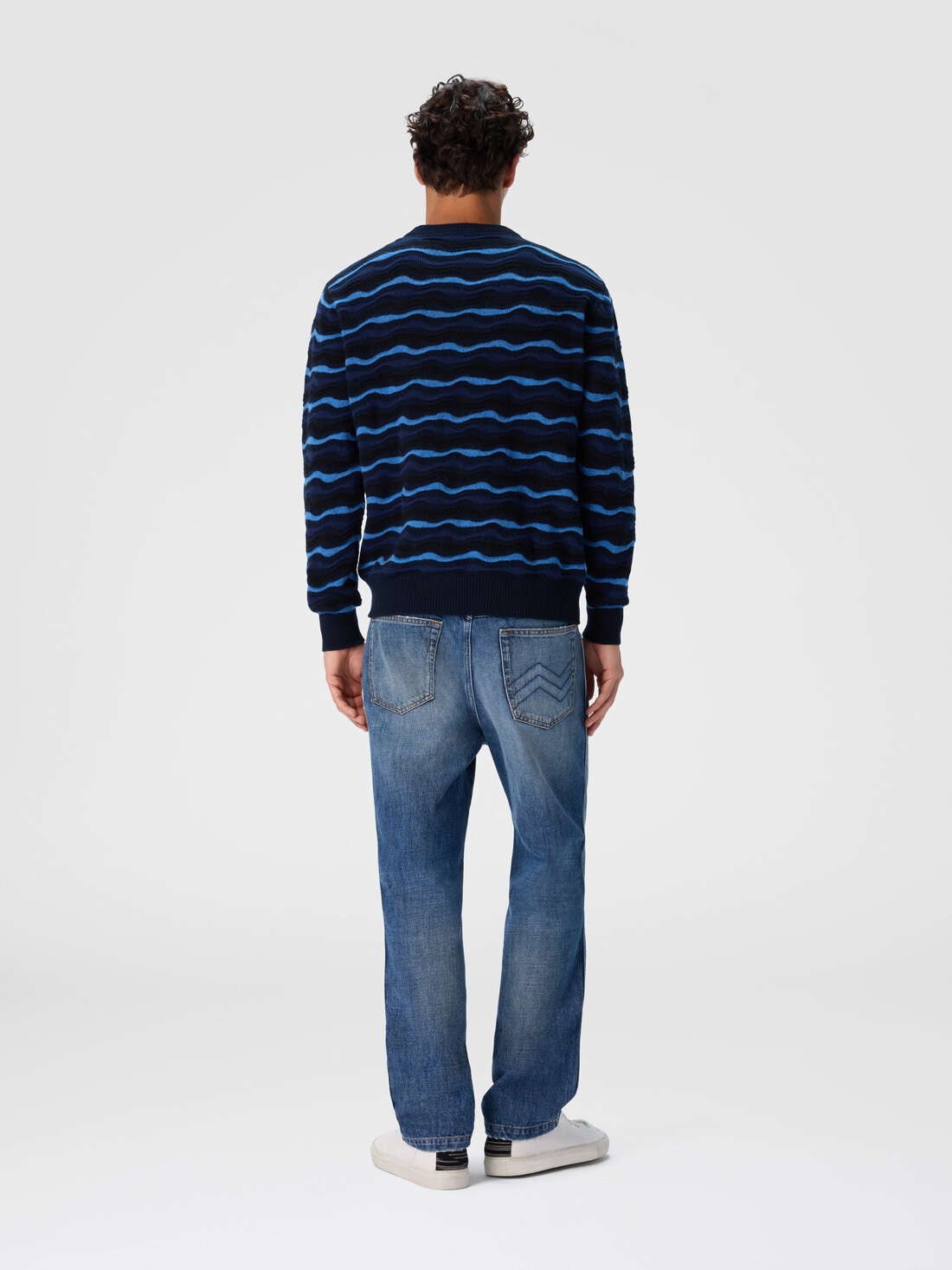 This men’s crew-neck sweater in 100% wool is enhanced by refined wave-stitch workmanship, giving the garment a dynamic visual effect and a richly textured surface. Soft and enveloping, it’s ideal for those looking for an elegant yet comfortable design.