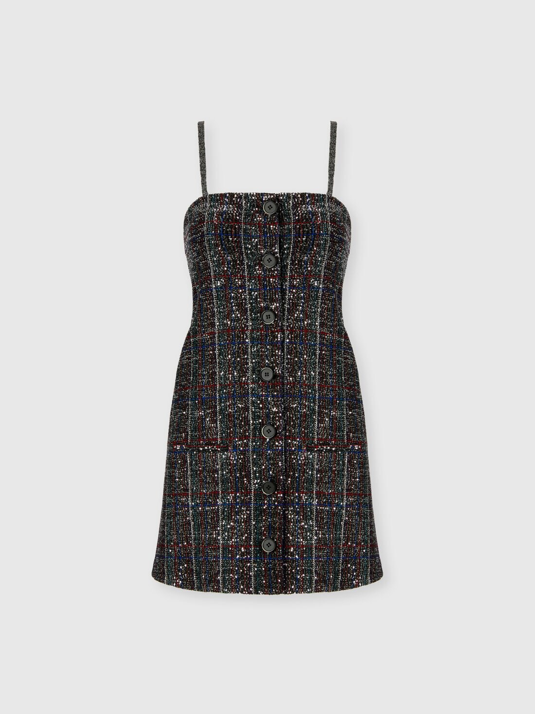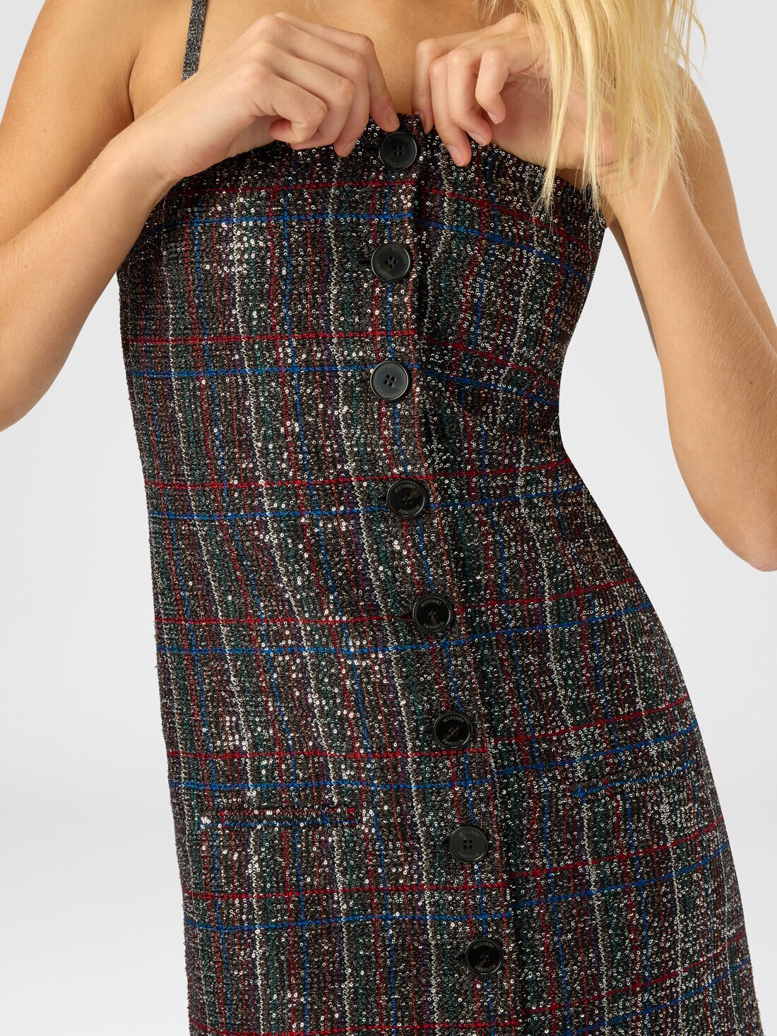 This women’s mini dress with front buttons blends contemporary spirit with sophisticated craftsmanship. Made on a Caperdoni loom, it features an elegant check pattern enriched with lamé threads and sequins, delivering a precious brightness and rich texture. Its short, structured design and radiant details make it perfect for special occasions where elegance and personality merge with style.