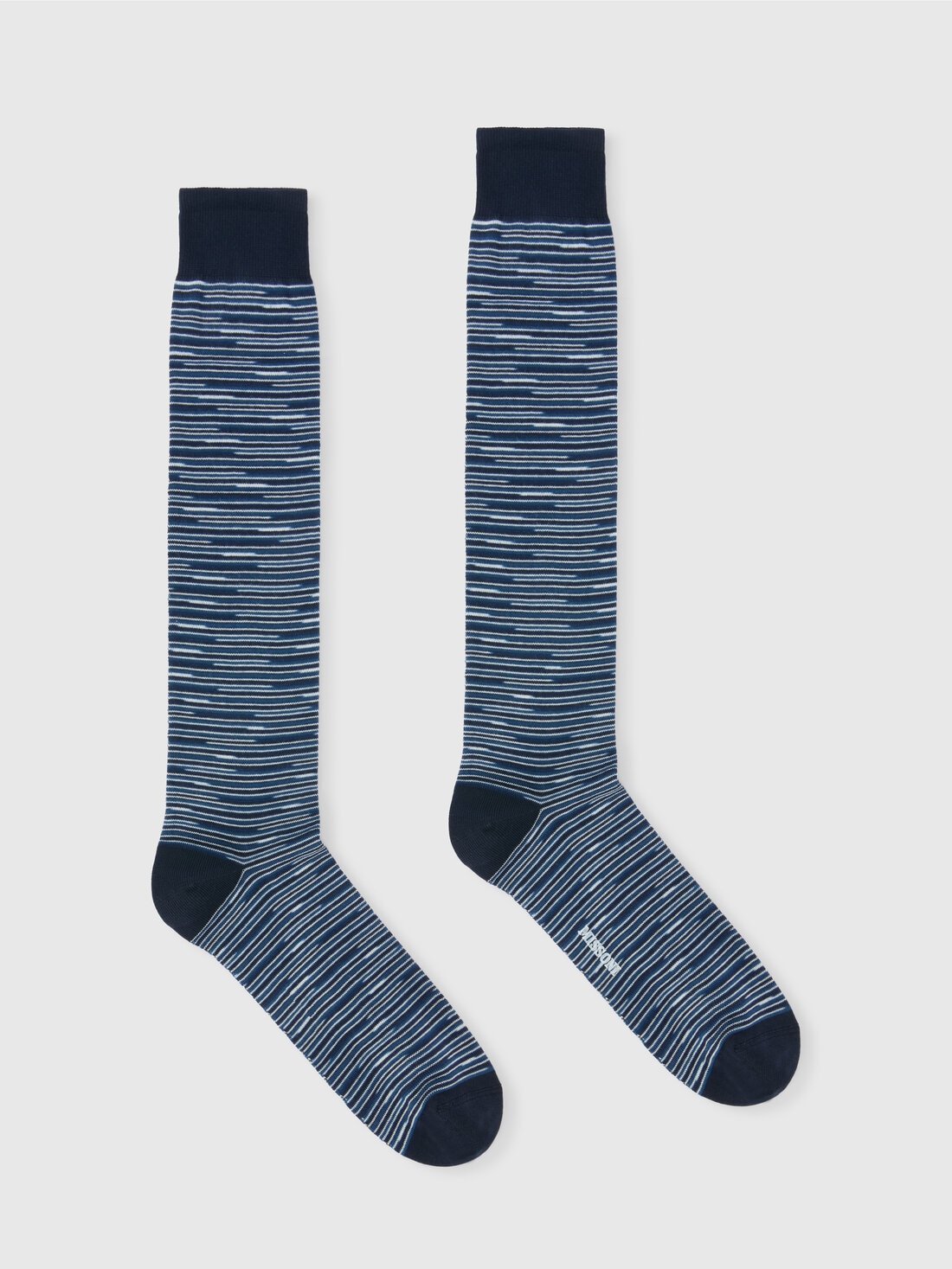 Perfect for dressing even the extremities in pure Missoni style, the long socks in cotton blend are characterized by the slub pattern. Finished with contrasting gussets and edge, they have a logo print on the sole.
