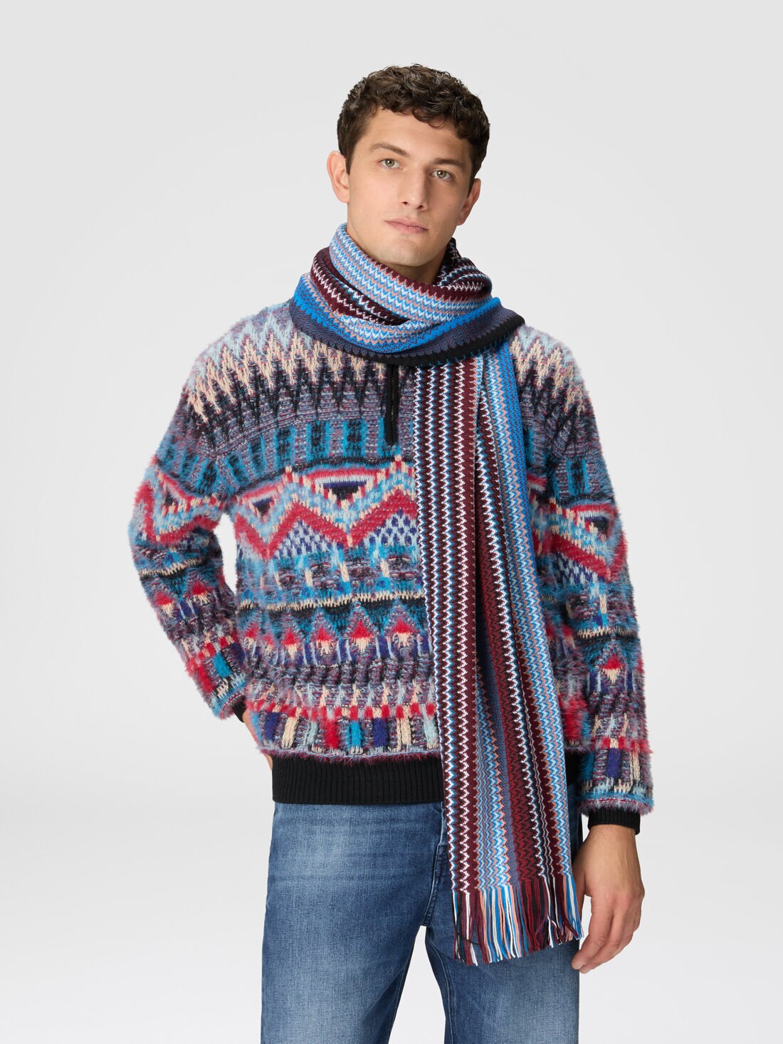 A wool blend sweater, on which micro zigzags chase each other regularly, for this men's shawl. The long fringes on the hem complete the accessory.