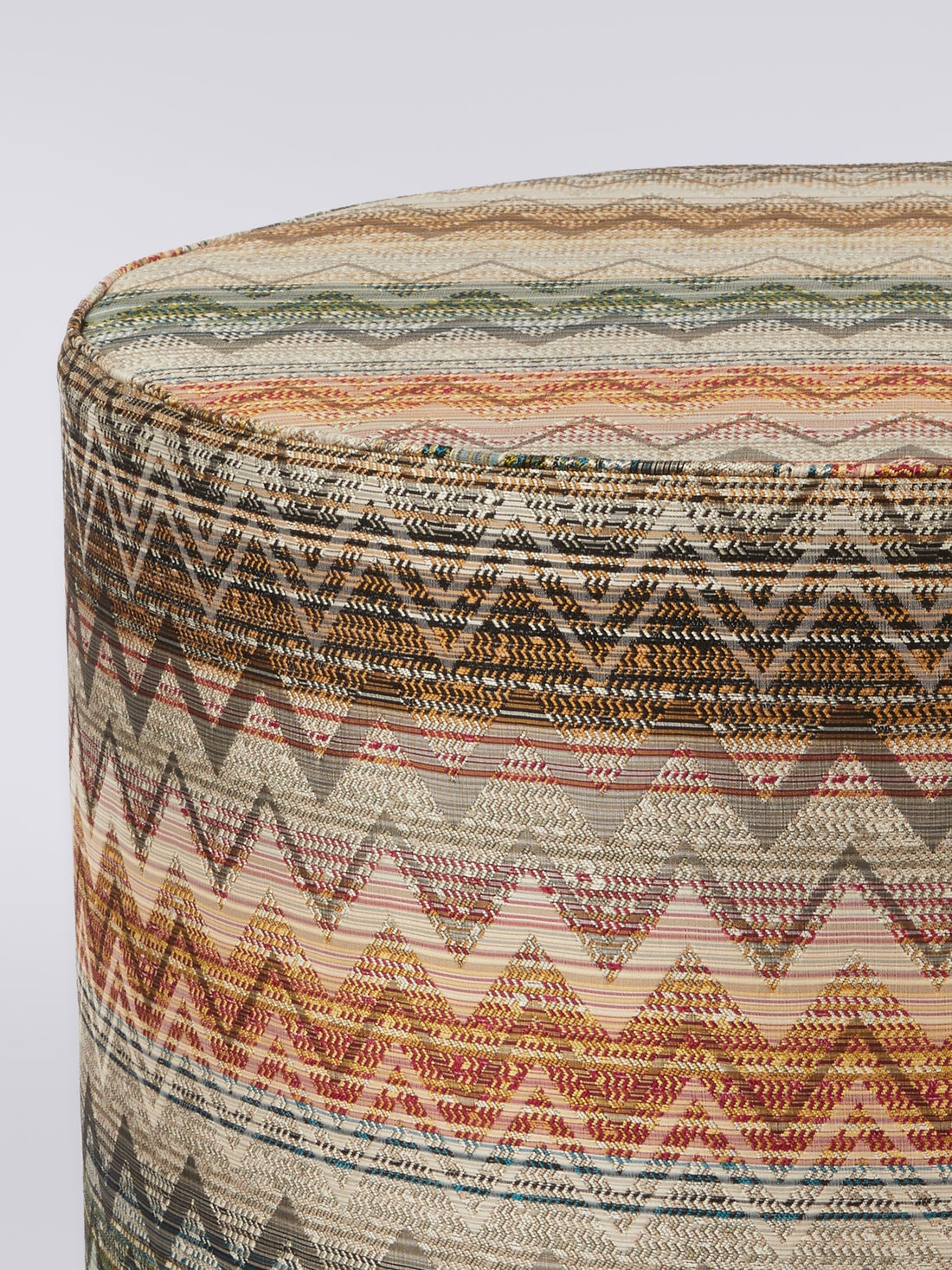 The 40x30 cm cylindrical Yate pouffe features tone-on-tone piping and a mix of decorative patterns, from horizontal chevron to vertical zigzag to stripes. Discreet, refined and eclectic, it will embellish any room of your home with personality.