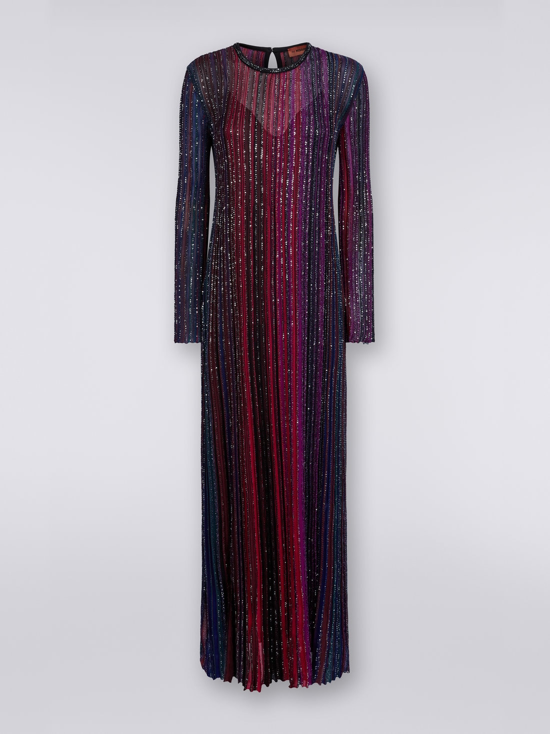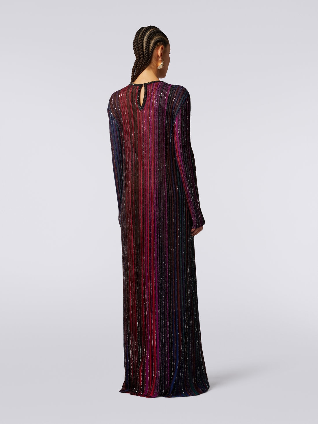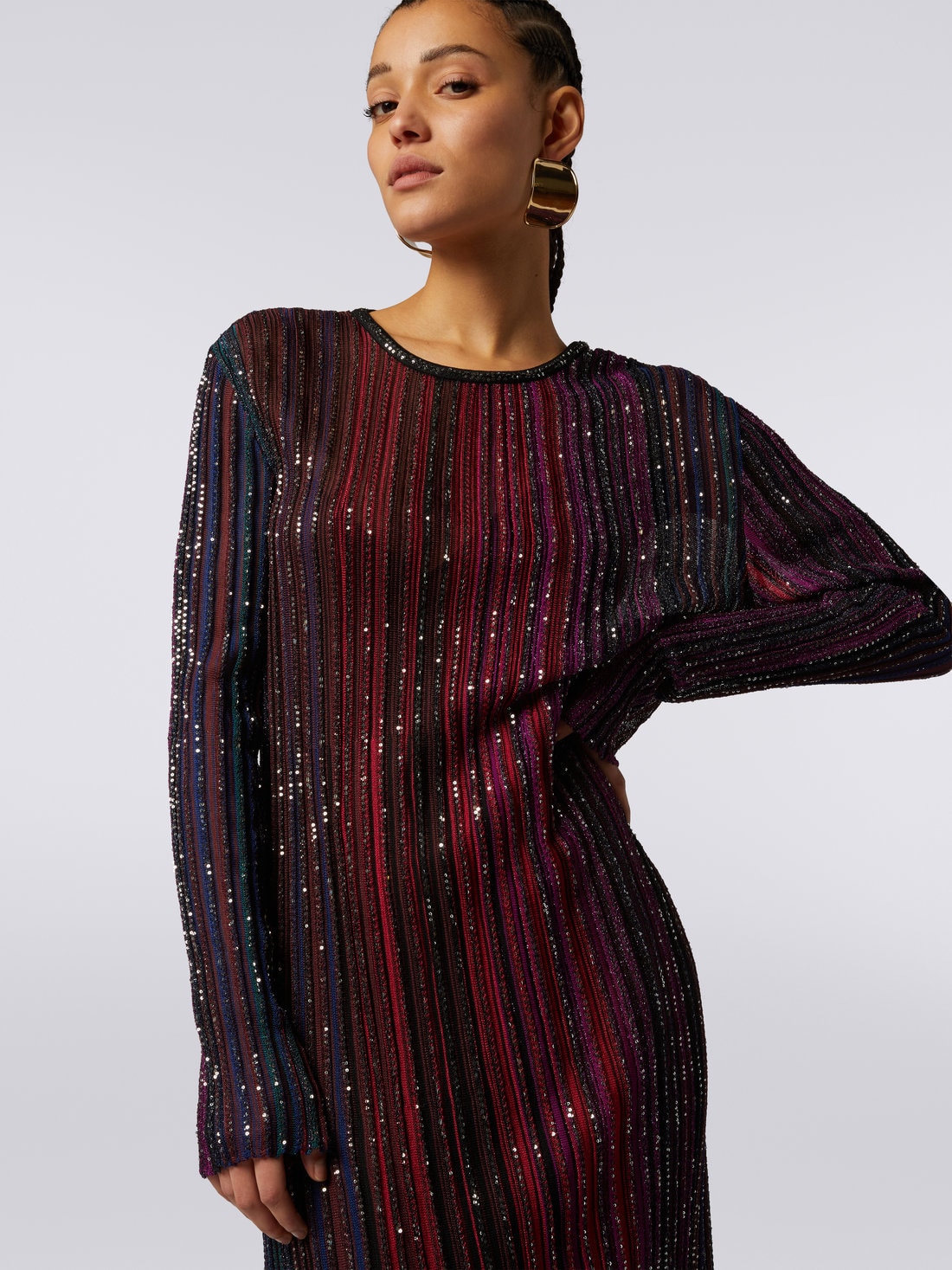 With unprecedented elegance, this Missoni women’s long dress impresses at first glance. Featuring vertical stripes inlaid with sequins, its viscose blend knit sits discreetly on the silhouette.