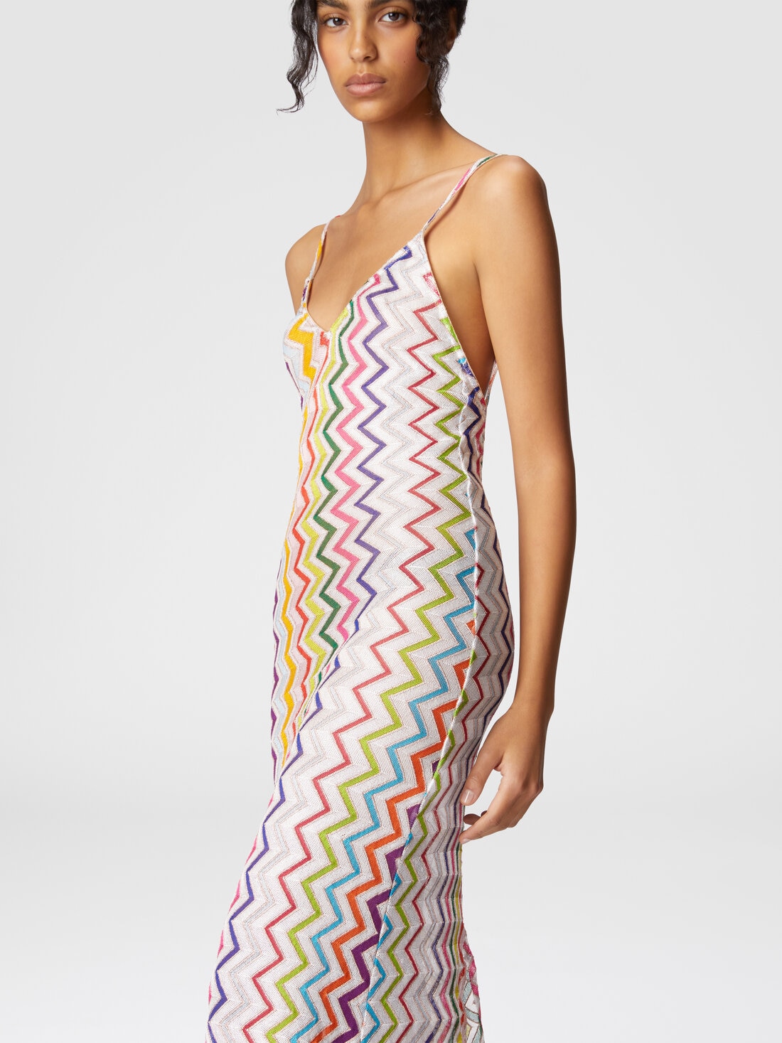 Minimal elegance defines the long cover-up in tube dress style, with thin straps and a deep back neckline. The back slit adds fluid movement and a touch of sensuality to the design.
