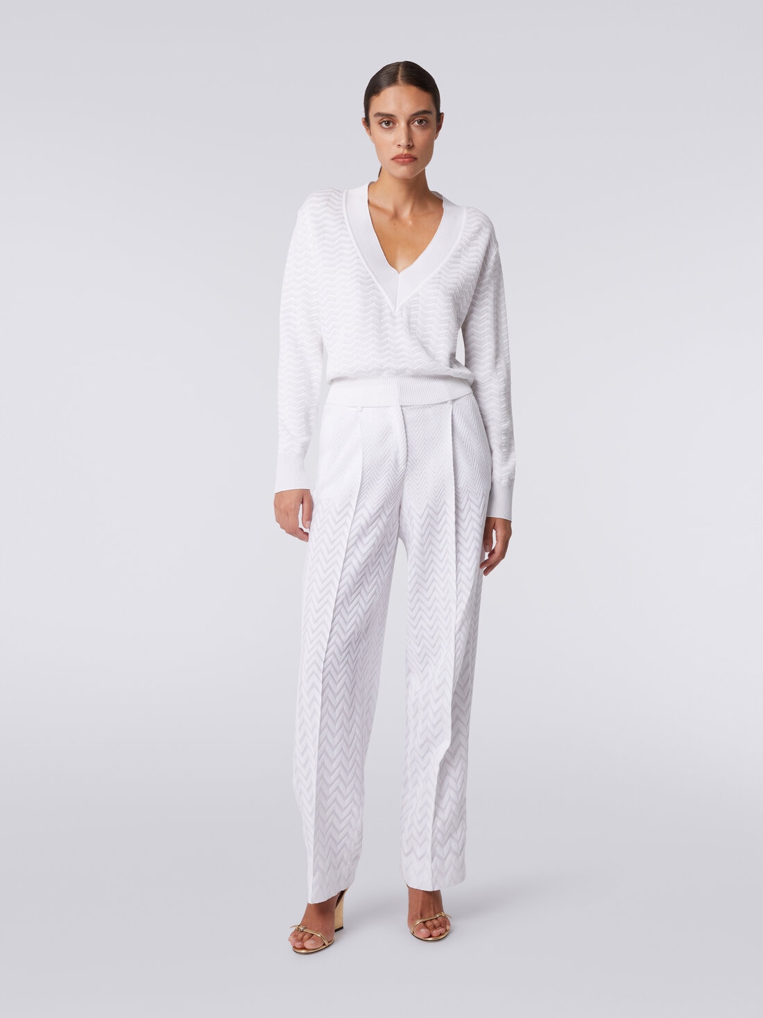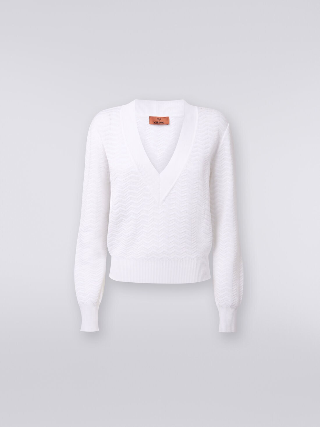 A succession of chevrons characterises the women’s V-neck pullover. The piece, made of cotton and viscose knit, is finished with plain ribbed trim. The result is a garment with a chic allure, but also perfectly at ease when paired with denim, for a simple and refined daily look.