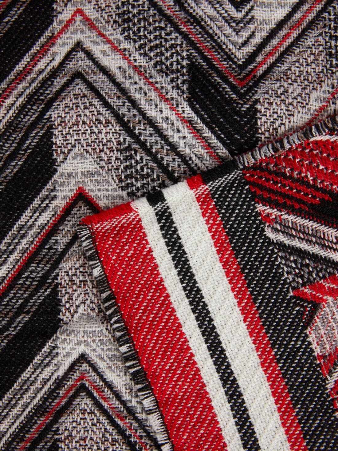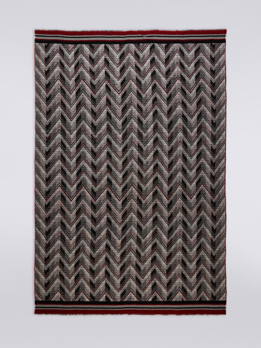 Missoni's 130x190 cm Basilio plaid blanket, a very warm accessory for the bed and for relaxation, is crafted entirely from wool. This elegant and comfortable bed linen version features chevrons with different backgrounds traversed by vertical stripes and striped trim with fringed bottoms.