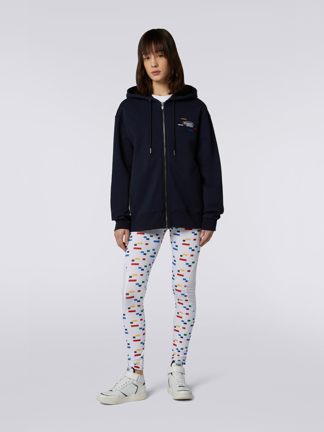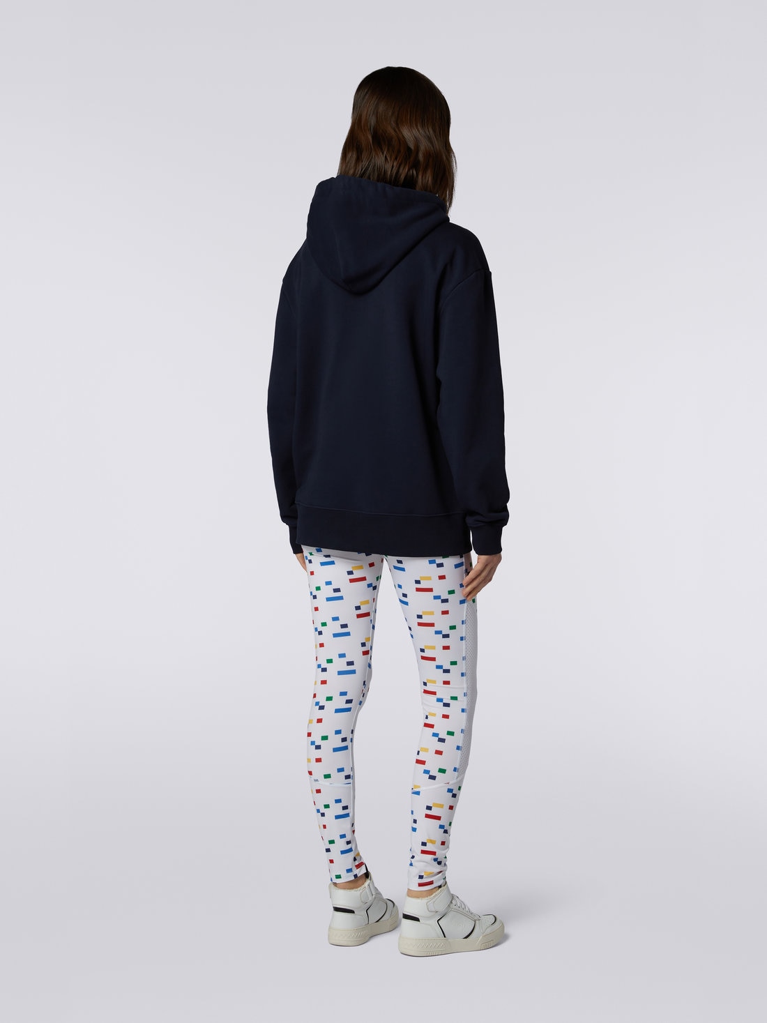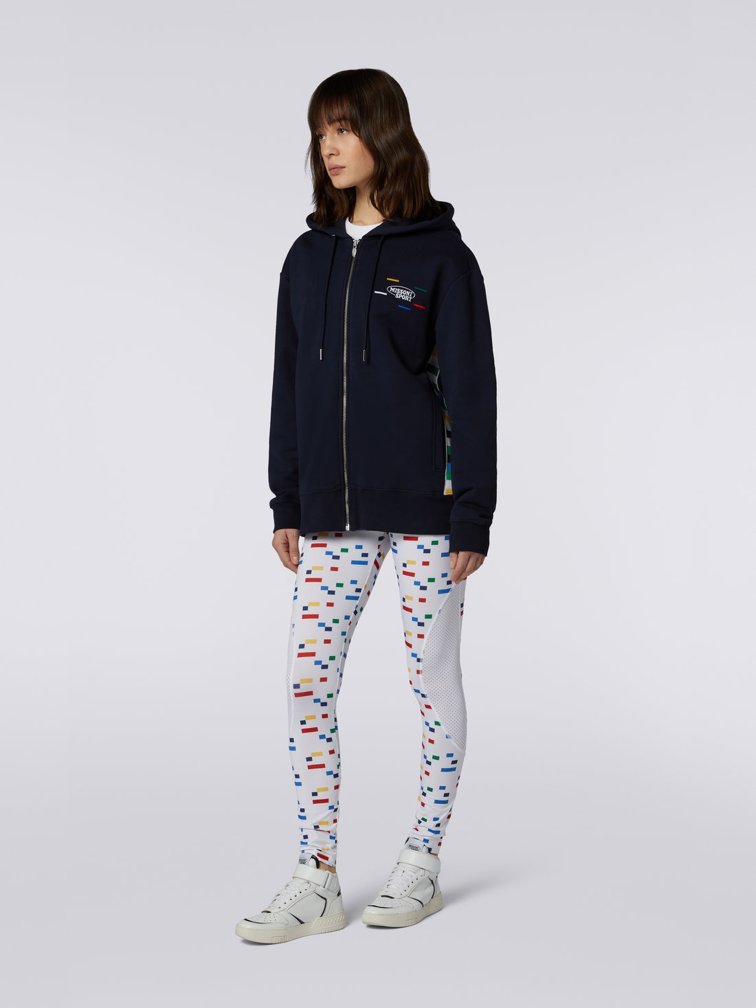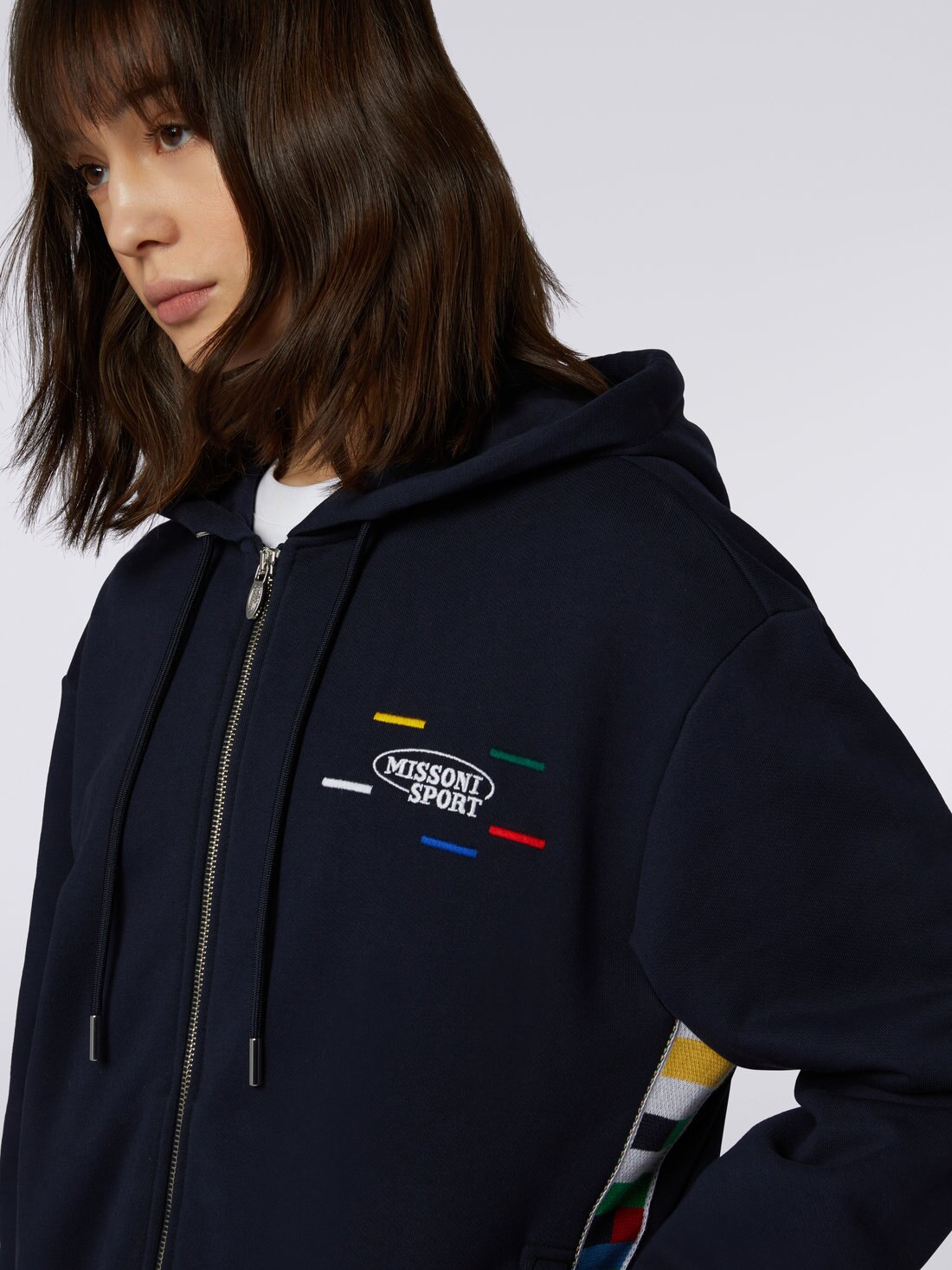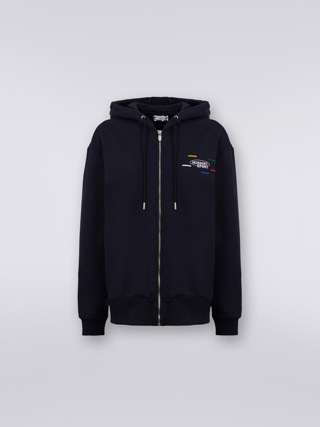 A contemporary reinterpretation of an emblem from the 1990s, the Missoni Sport Legacy logo is presented as a multicoloured band on the women’s plush cardigan. The piece made of jersey, with a hood and drawstring and side pockets, is also customised with a contrasting embroidered signature.