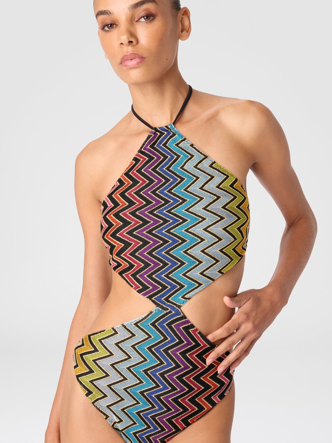 The one-piece swimsuit stands out with its Raschel craftsmanship and the iconic zigzag motif of Missoni. The diamond-shaped silhouette and neck tie add elegance and modernity, enhanced by touches of lamé
