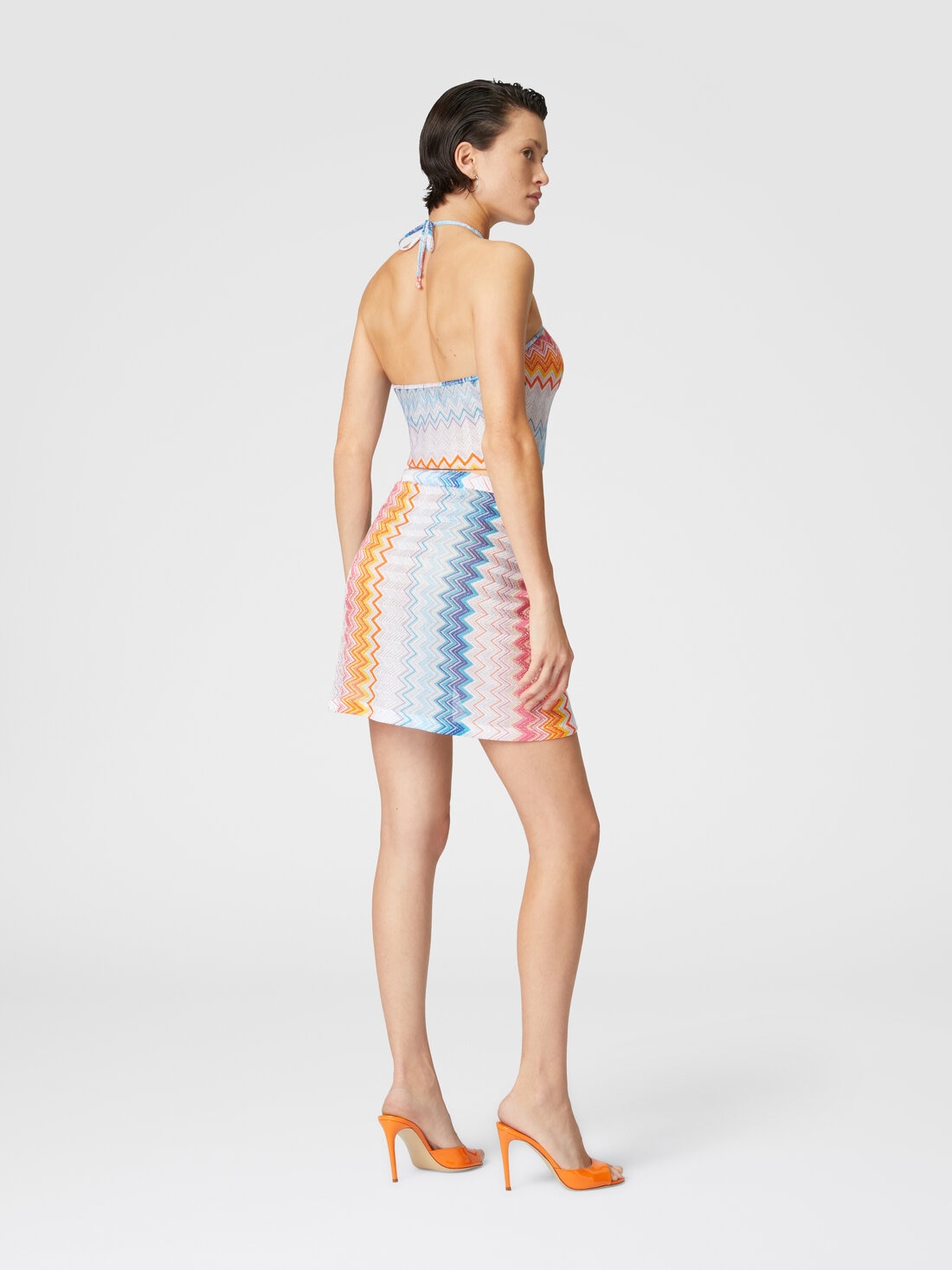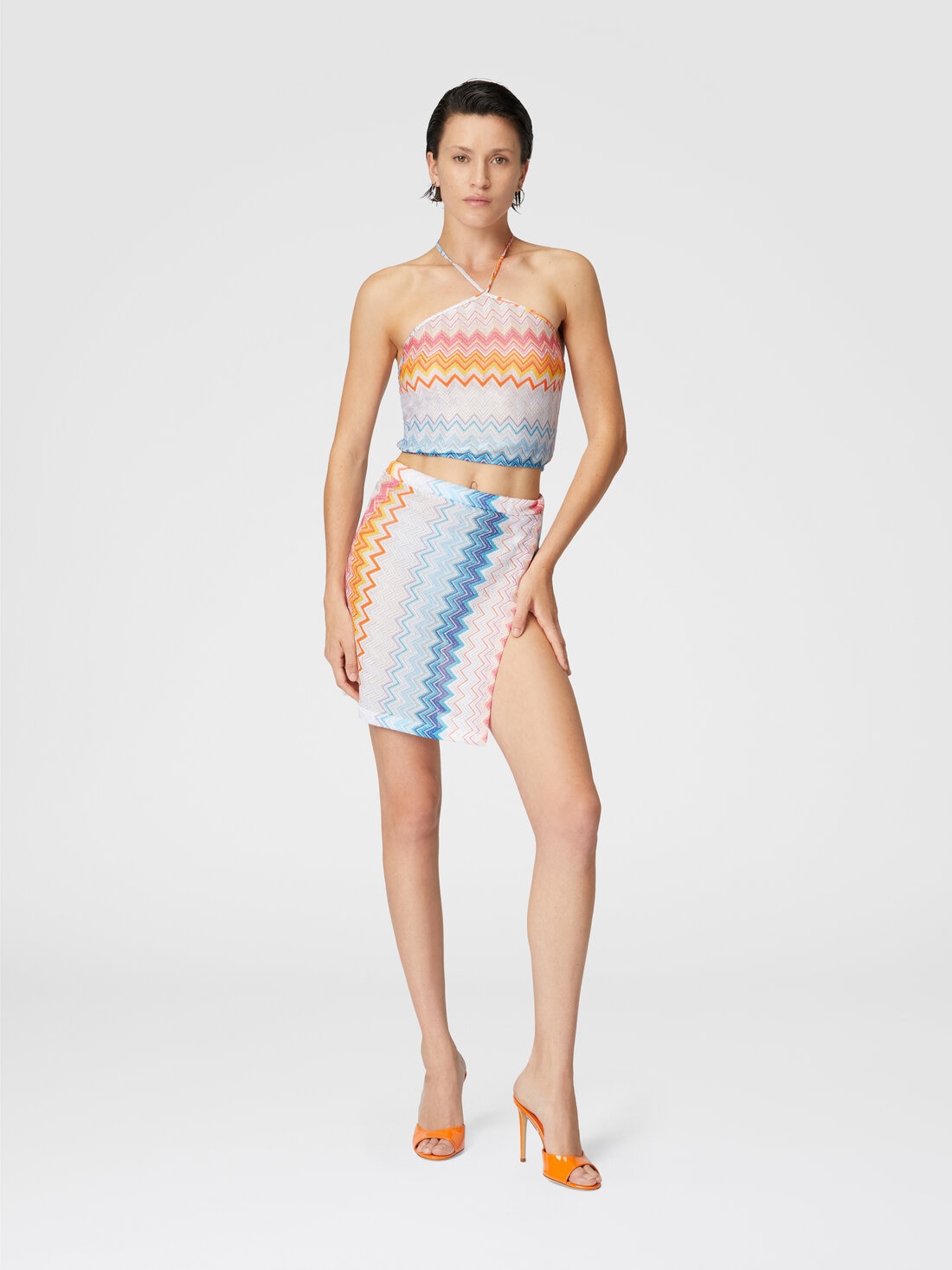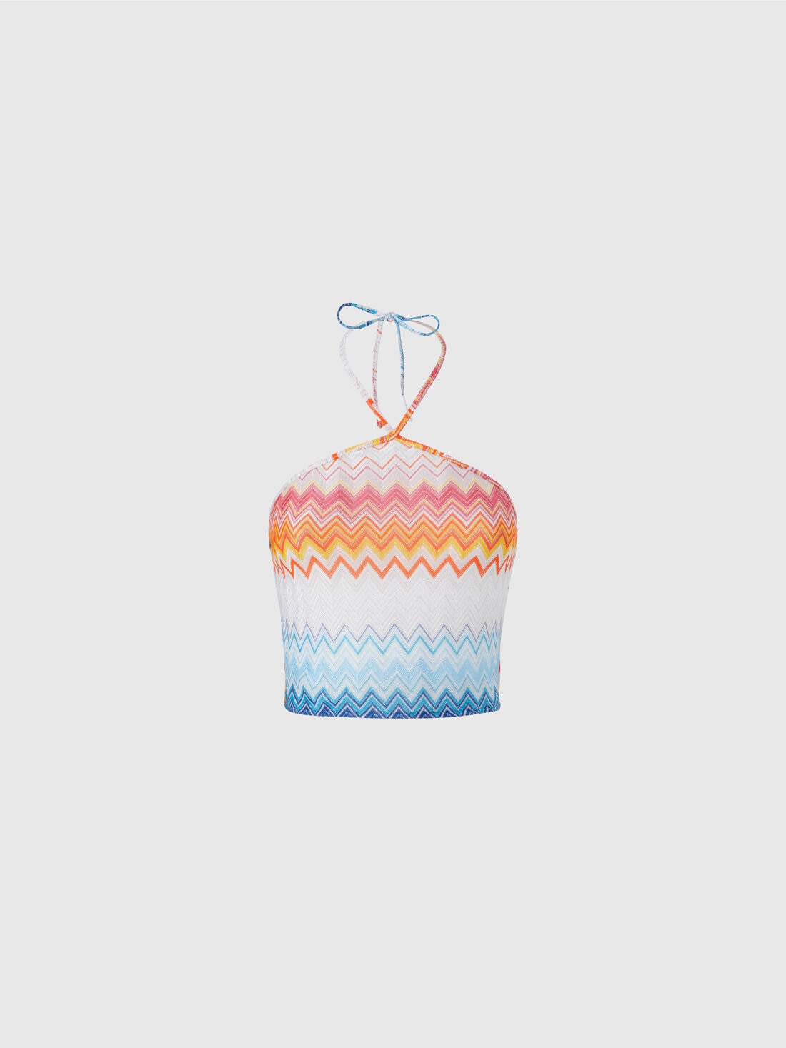 The viscose-blend top with a gradient zigzag pattern enhances femininity with its halter neckline, which elegantly enhances the shoulders. The light and bright fabric, thanks to the lamé reflections, creates a refined play of colors and light, giving the garment a perfect balance between dynamism and sophistication, in pure Missoni style.