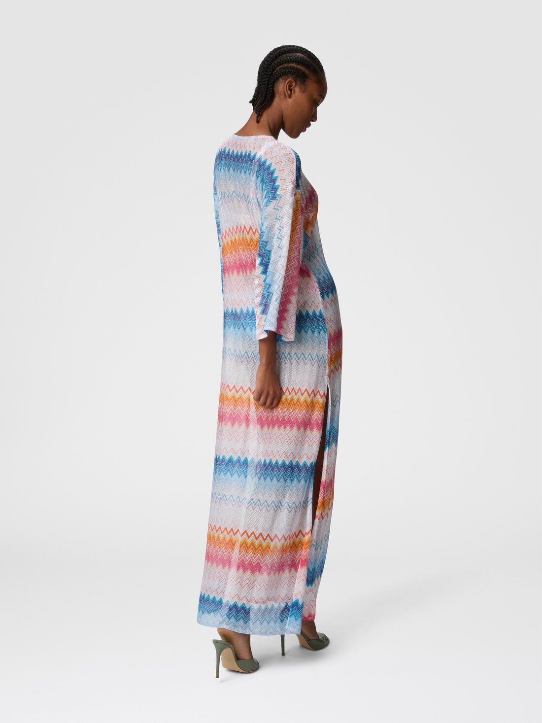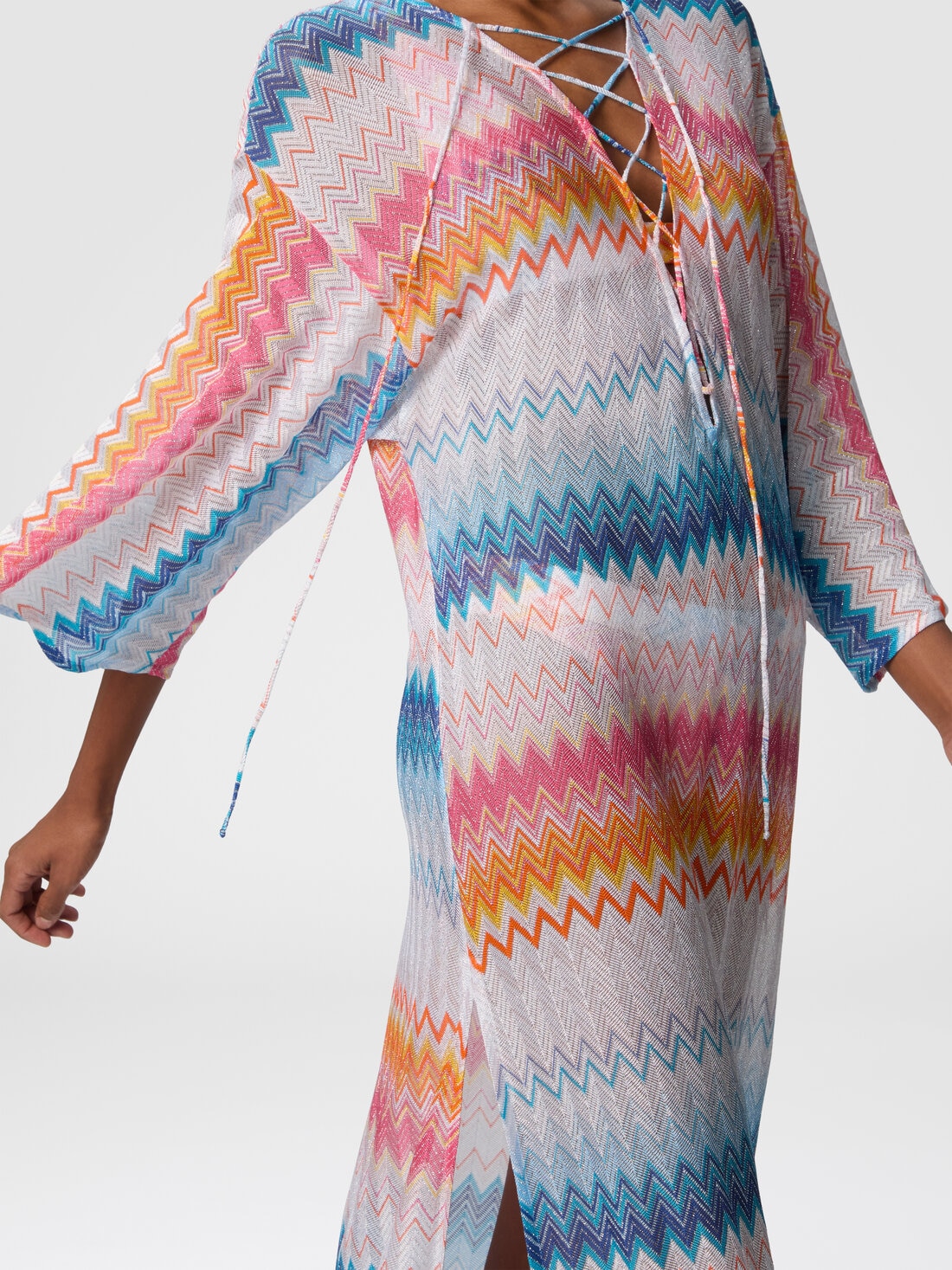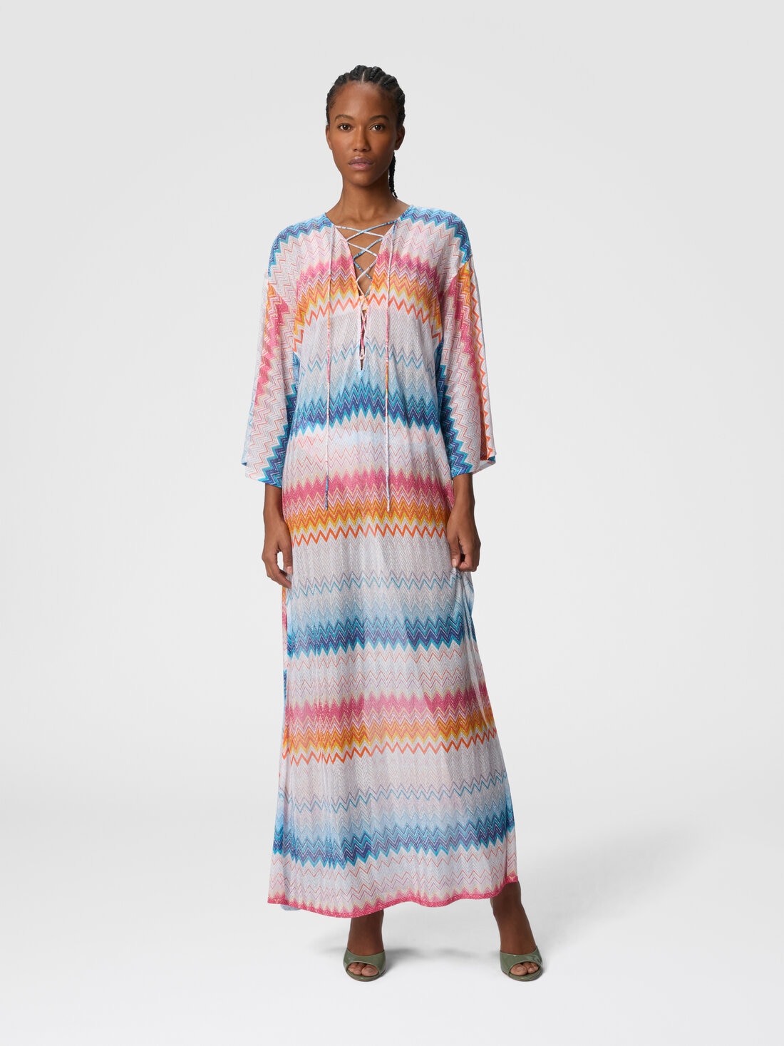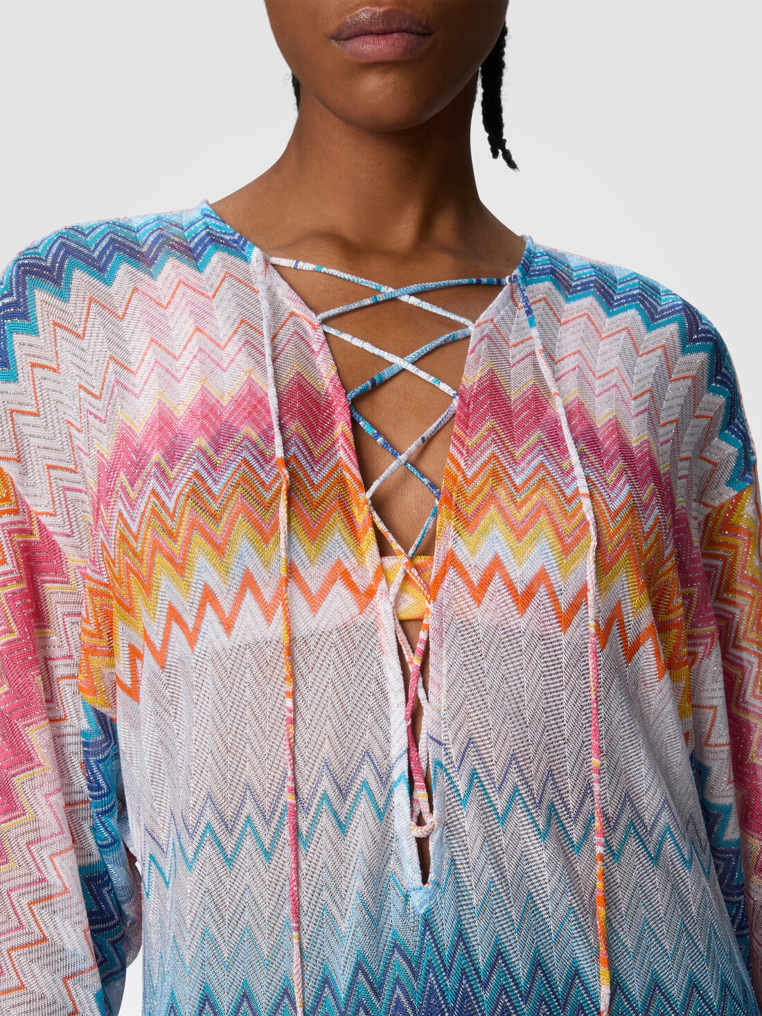 From Missoni's exotic heritage, the long cover-up caftan in viscose blend embodies the timeless elegance of the maison. The zigzag pattern intertwines with the metallic reflections of the lamé, creating a harmony of light and color. The plunging V-neckline, embellished with laces that add movement and dynamism, enhances the silhouette with a touch of sophisticated sensuality.