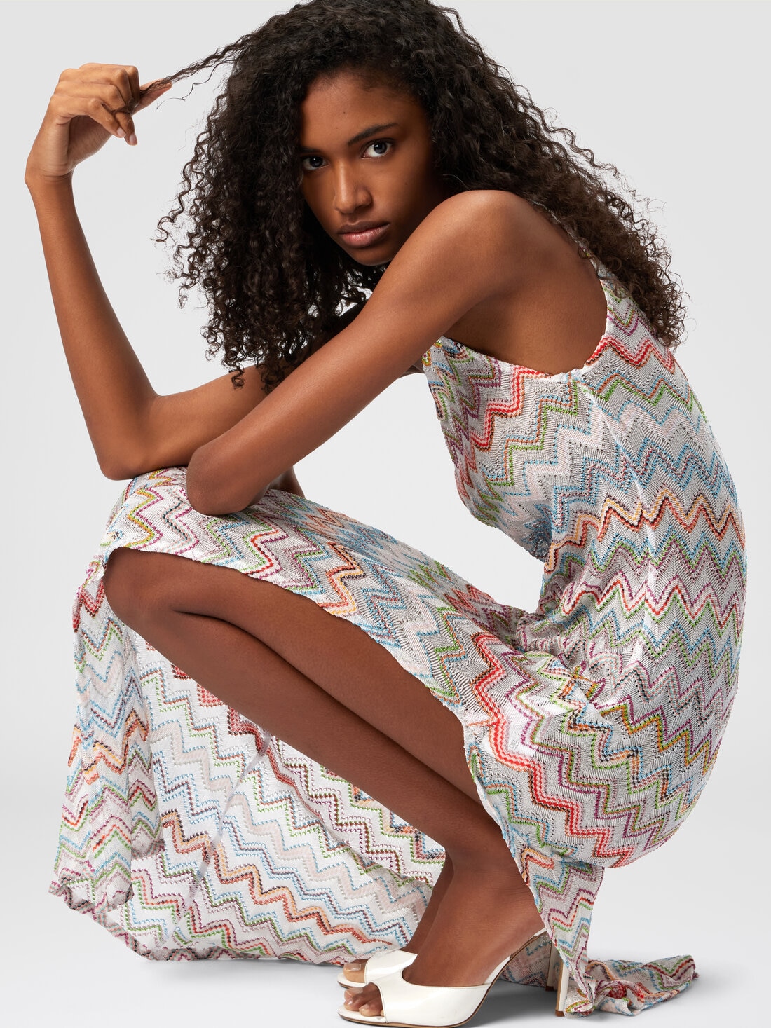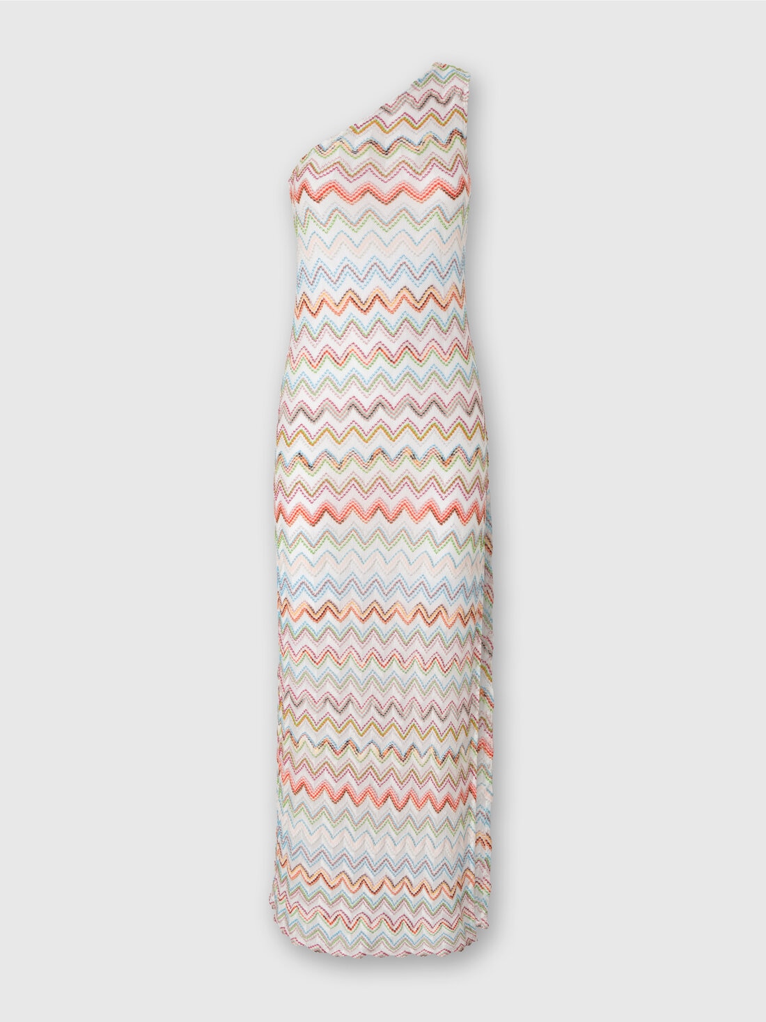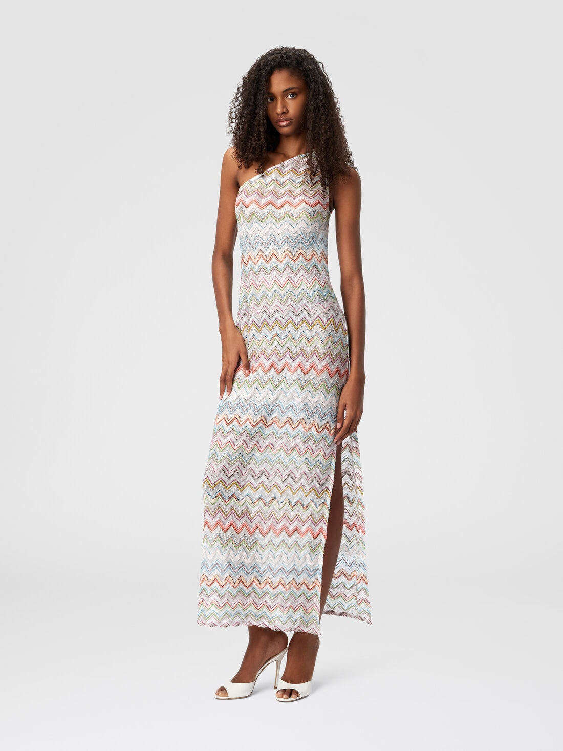 The long dress presented by the Missoni maison in a one-shoulder version with a 3D zigzag motif, is a synthesis of contemporary elegance. The lamé illuminated fabric wraps the silhouette with sophisticated fluidity, while the asymmetrical off-the-shoulder design adds a touch of bold sophistication.