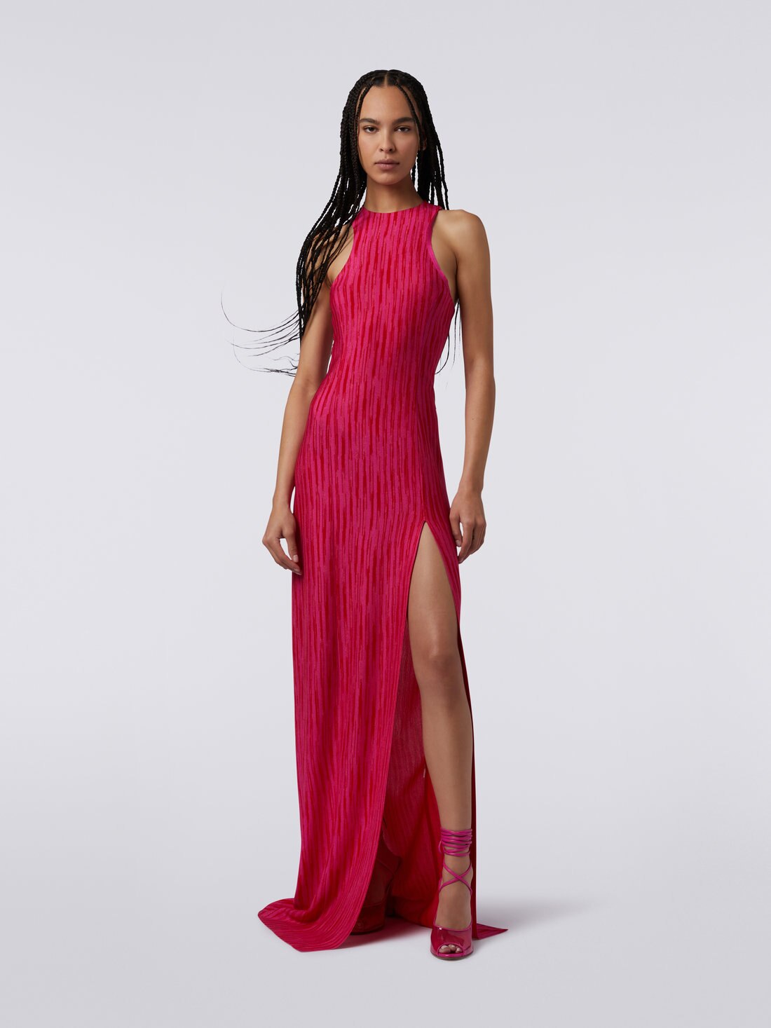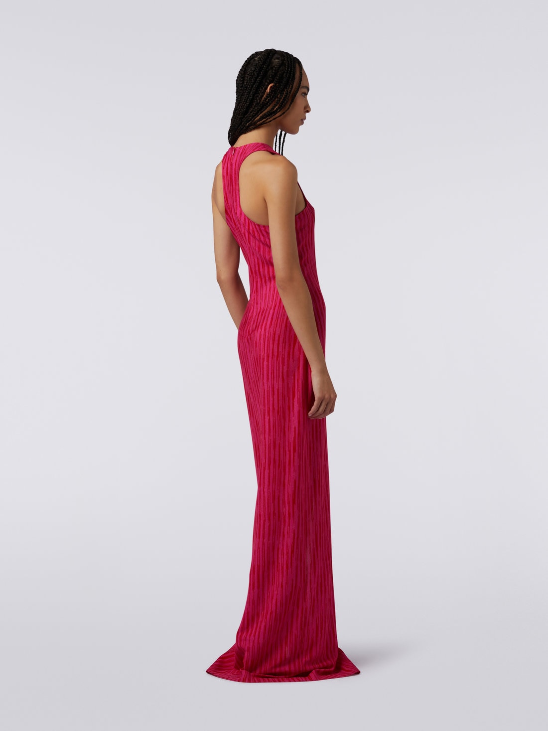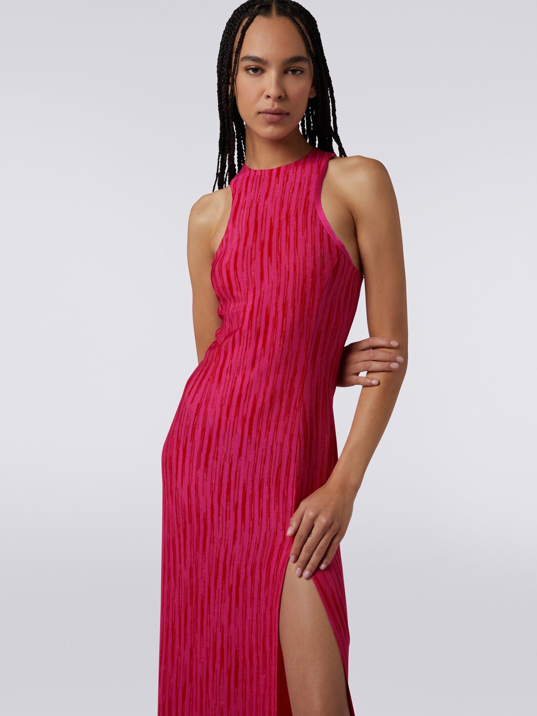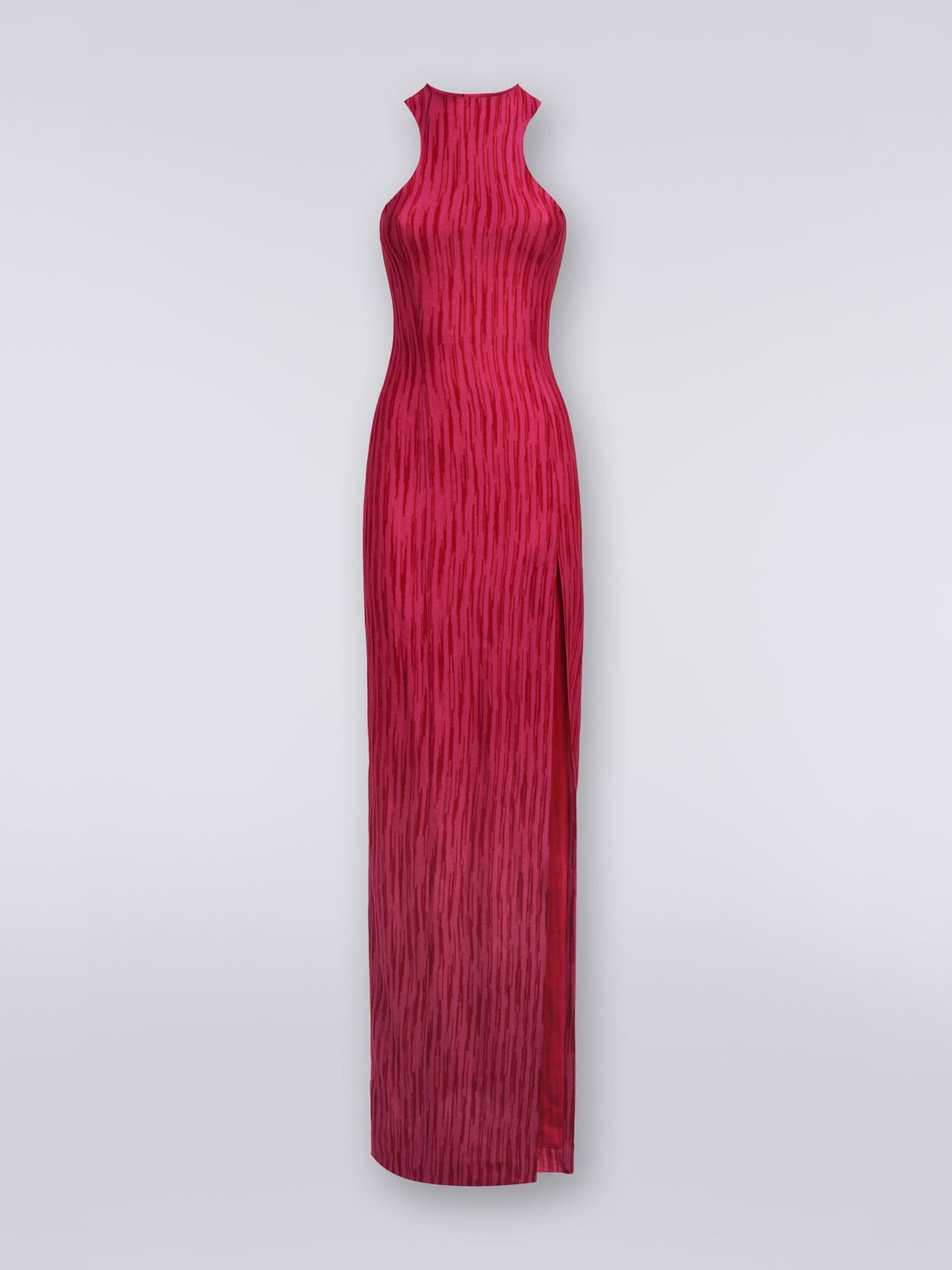 Made extremely sensual by the deep front slit, the women’s long dress combines stylistic features linked to sportswear, such as the Olympic neckline, and features typical of the Missoni touch. The sleeveless piece is made of lightweight raschel knit viscose and a vertical slub pattern.