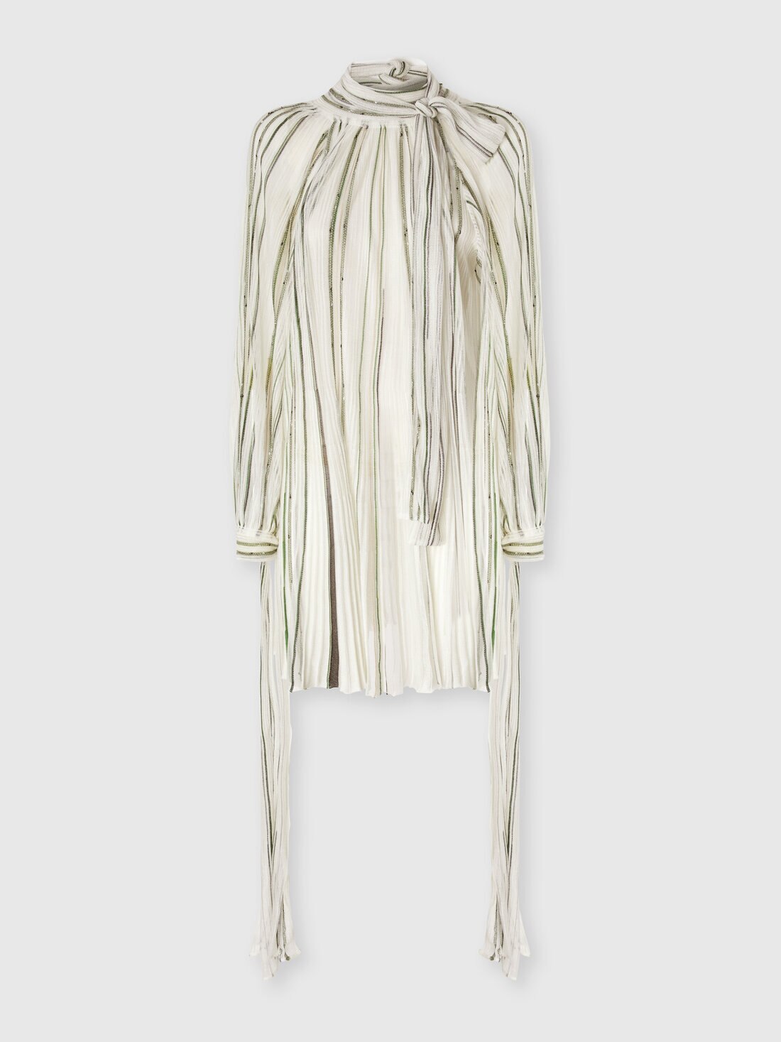 Long-sleeve mini dress for women, made from striped knit that plays with transparency. The viscose-wool blend yarn is enriched with lamé threads and sequins, offering a discreet and sophisticated shimmer. The sash belt adds a touch of elegance, while the graphic construction of the knit sculpts the silhouette with lightness. A visually impactful dress that blends modernity with refinement—perfect for evening.