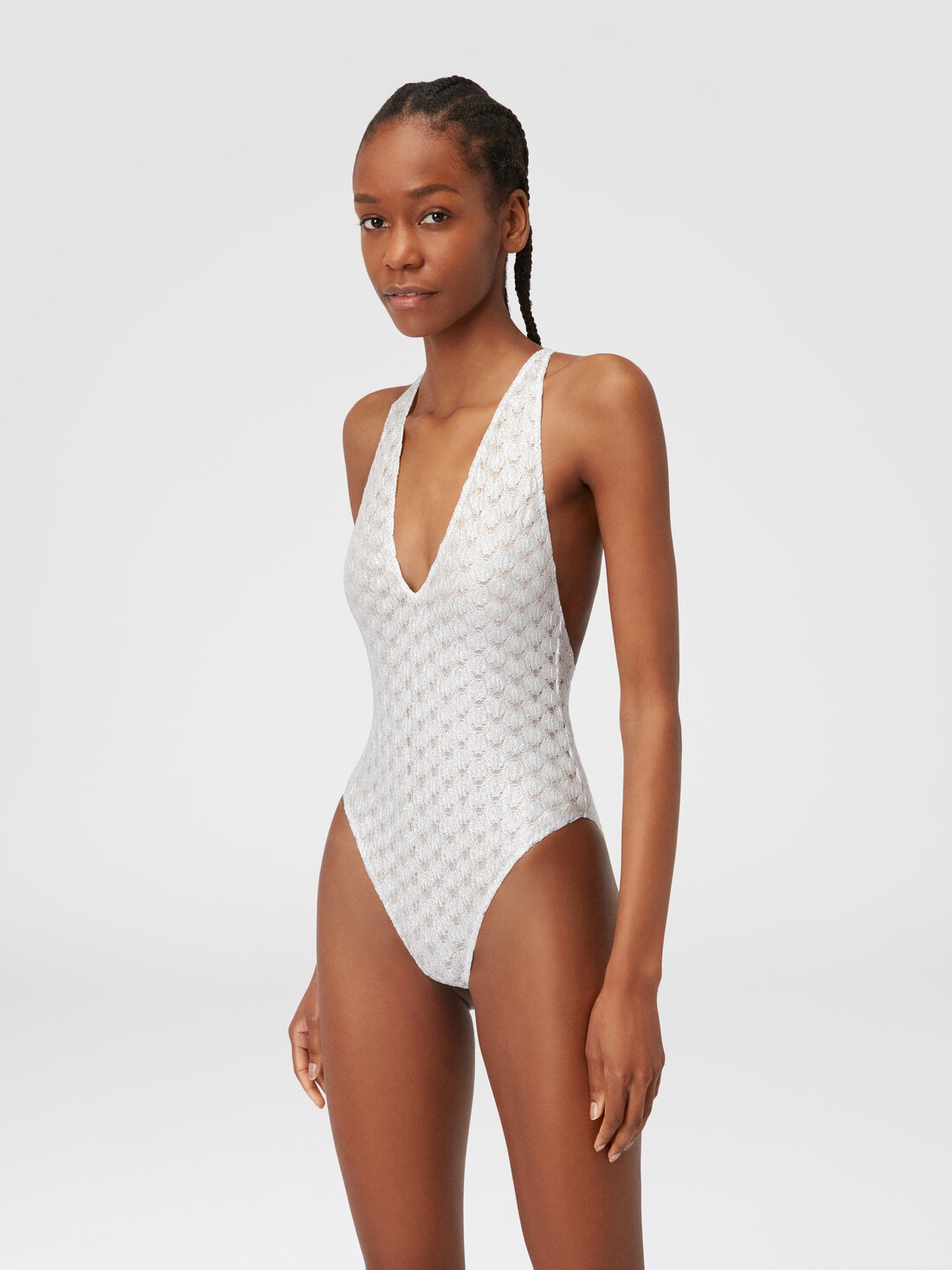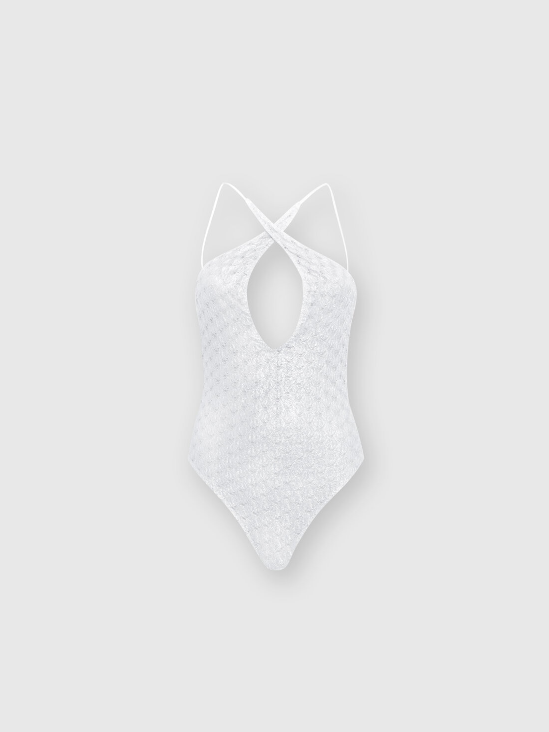 Swimsuit-size refinement for the pure viscose lace-effect piece with a glossy finish and lining in neutral tone. Embellished with a crossover neckline on the chest, with thin straps framing the back, this women’s one-piece embodies the most luxurious spirit of beachwear Missoni-style.