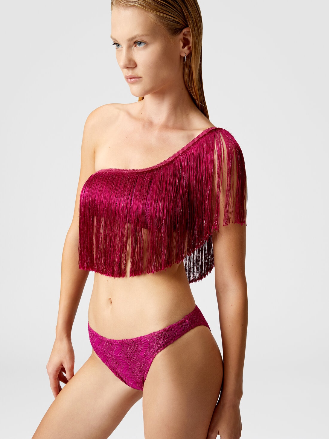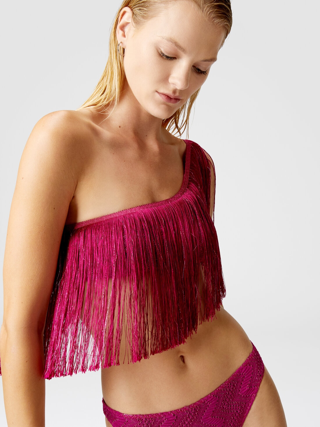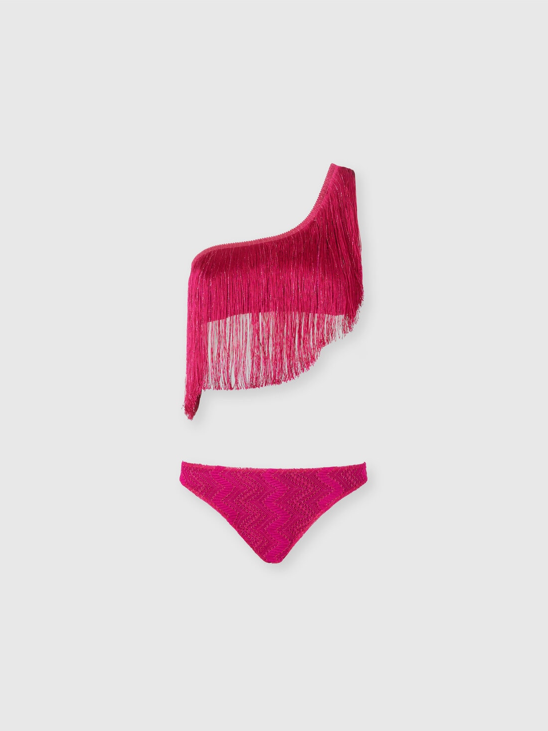The one-shoulder lamé viscose bikini by Missoni stands out for its asymmetrical design and the sheen of the fabric thanks to the lamé. Fringes on the briefs add a touch of movement and sensuality, while the iconic chevron motif enhances the style with elegance and dynamism.