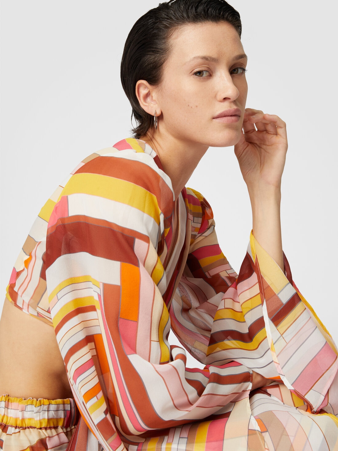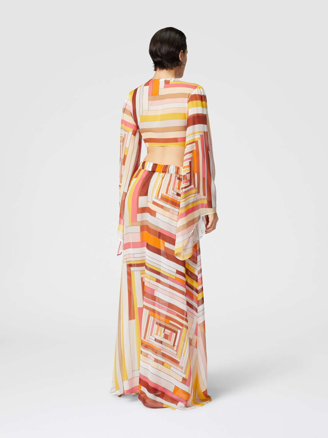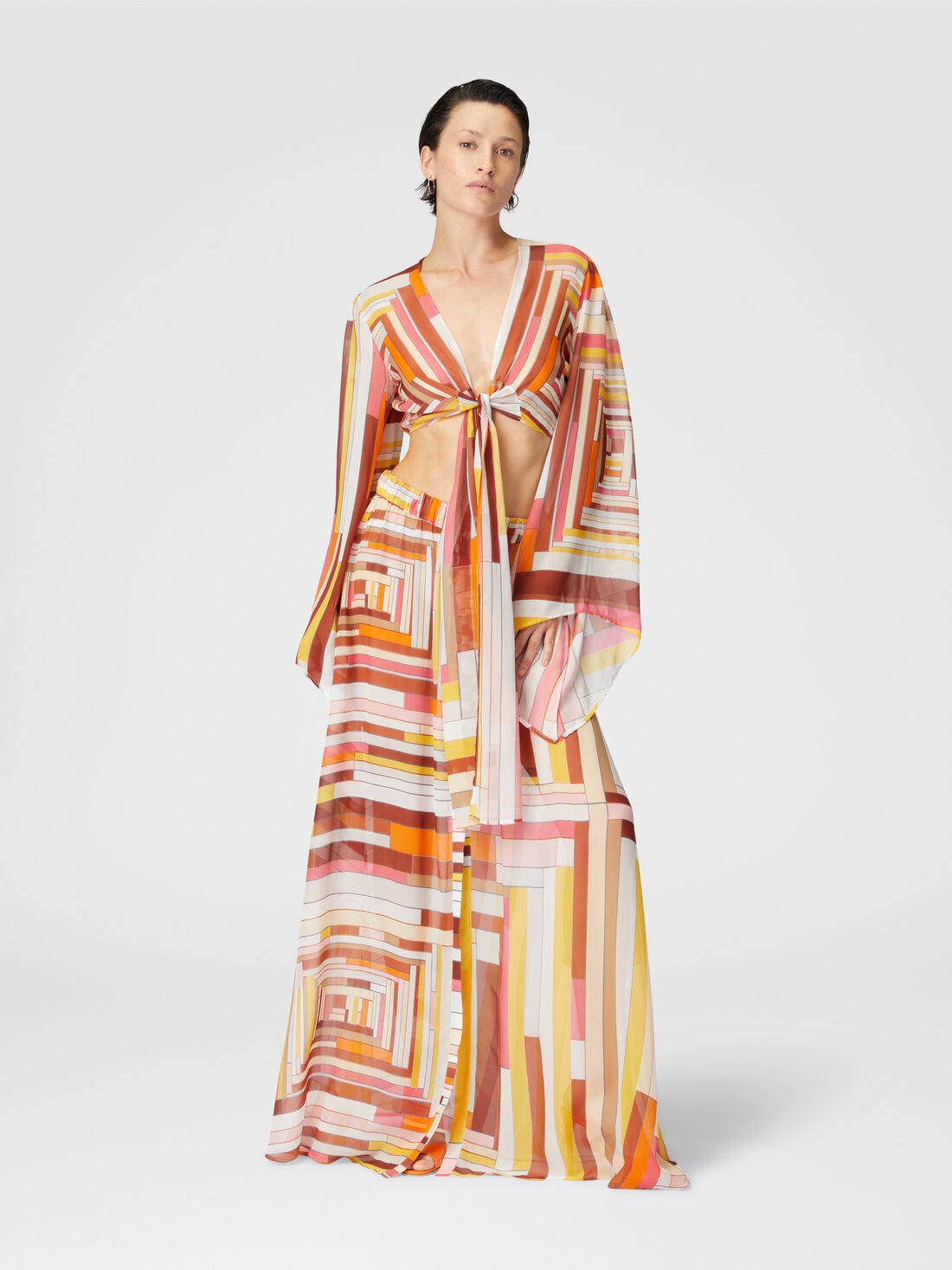 Playing on bold lines and bold asymmetries, the printed silk crop top embodies a contemporary design that enhances the contrast between geometry and softness. The front lacing creates a visual tension that balances the fluidity of the fabric, while the asymmetrical cut transforms every perspective, giving the garment a unique character. A perfect encounter between form and movement, in which the harmony of colors is expressed with elegant ease.
