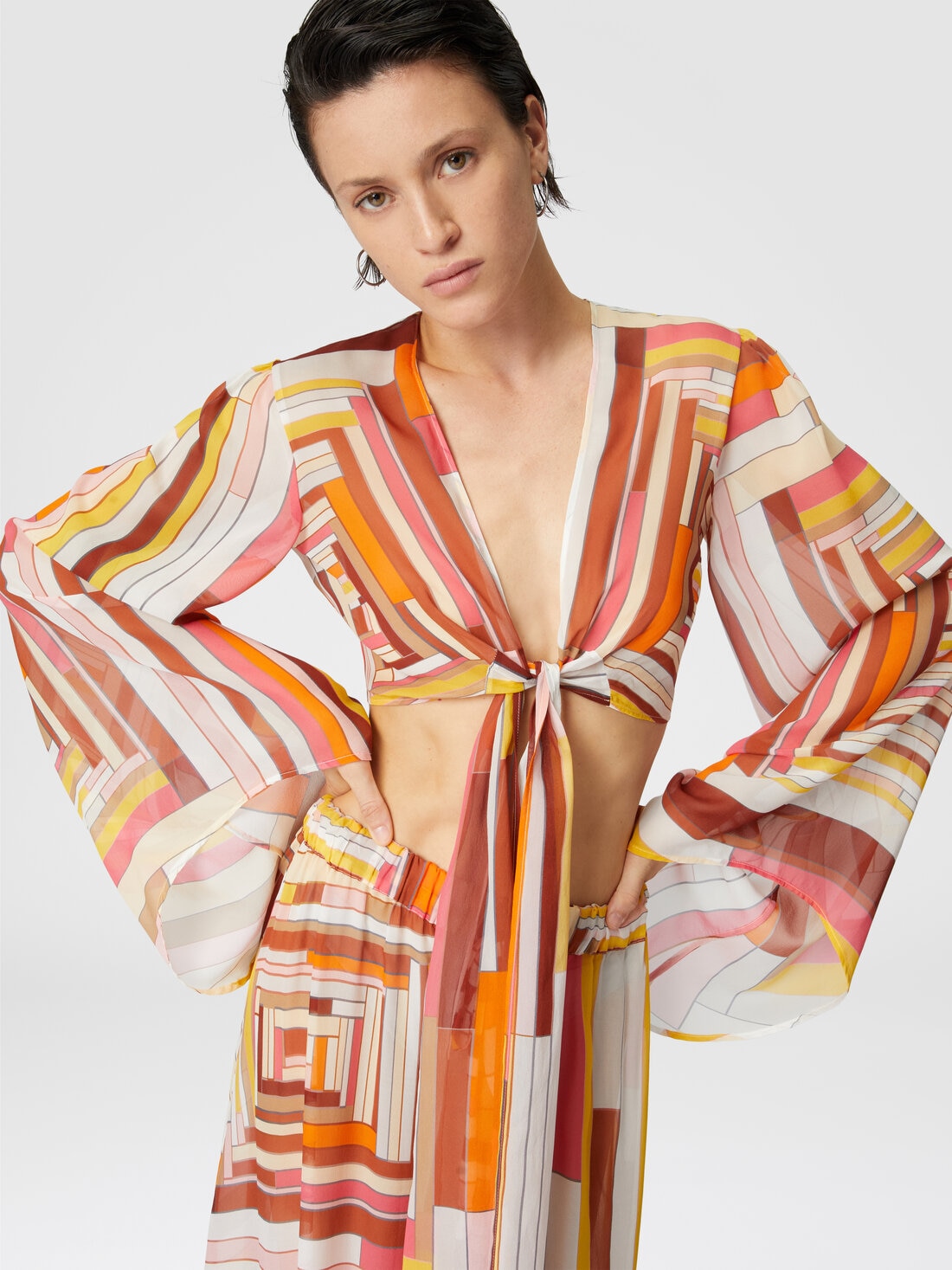 Printed silk crop top with wide sleeves and front knot