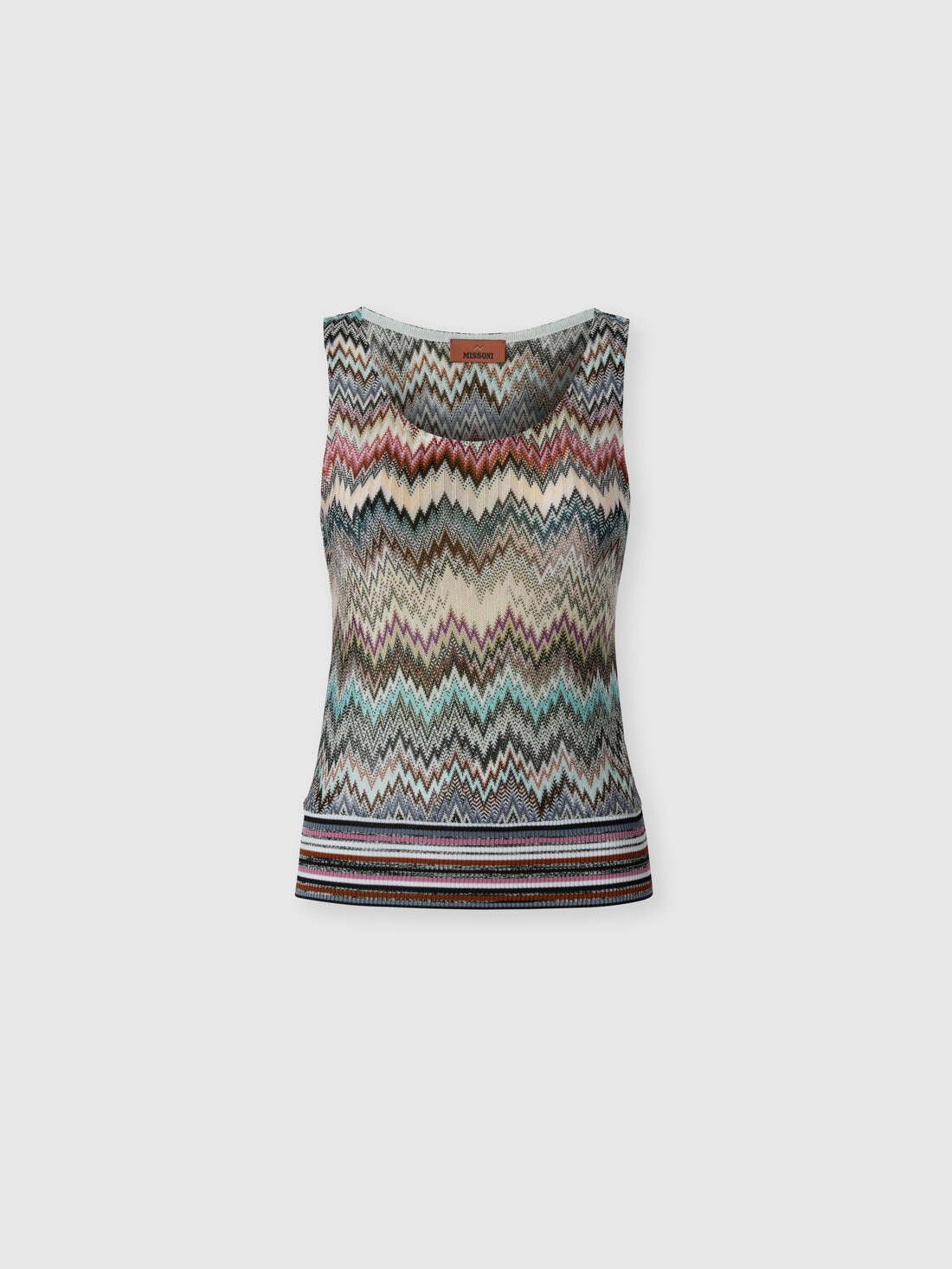 A rounded neckline defines this sleeveless women's top. Made of viscose zigzag knit, the piece features a ribbed striped knit hemline.