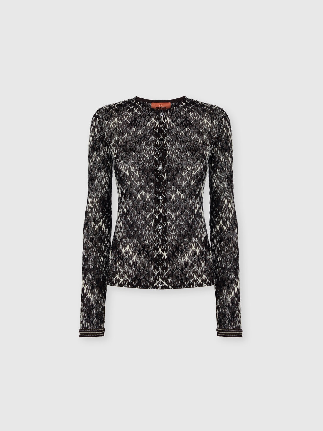 Crew-neck slim cardigan for women with refined charm, enriched by raschel lace in slubbed ribbed pattern that gives the garment a unique and dynamic texture. Made of wool and viscose blend, this cardigan expresses elegance and originality, perfect for a distinctive and sophisticated look.