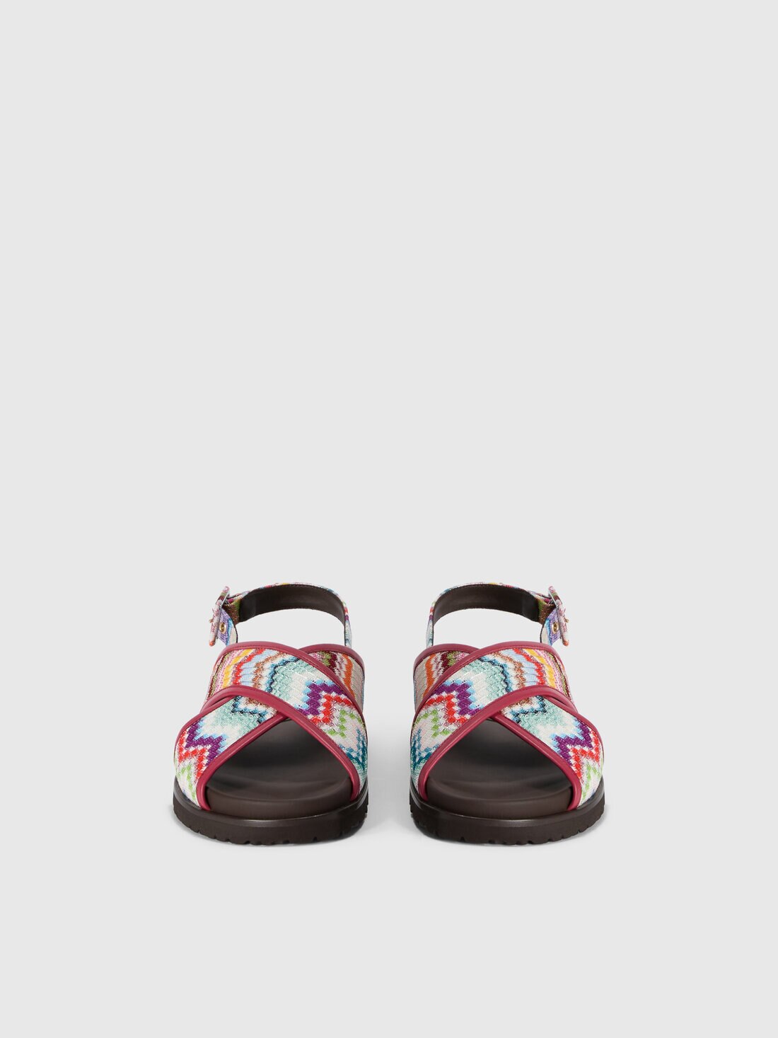 Flat sole and criss-cross straps in fabric trimmed with leather define these sandals. Animated by a pixel-inspired signature motif illuminated by metallic reflections, this summer style is completed with a comfortable adjustable heel strap.