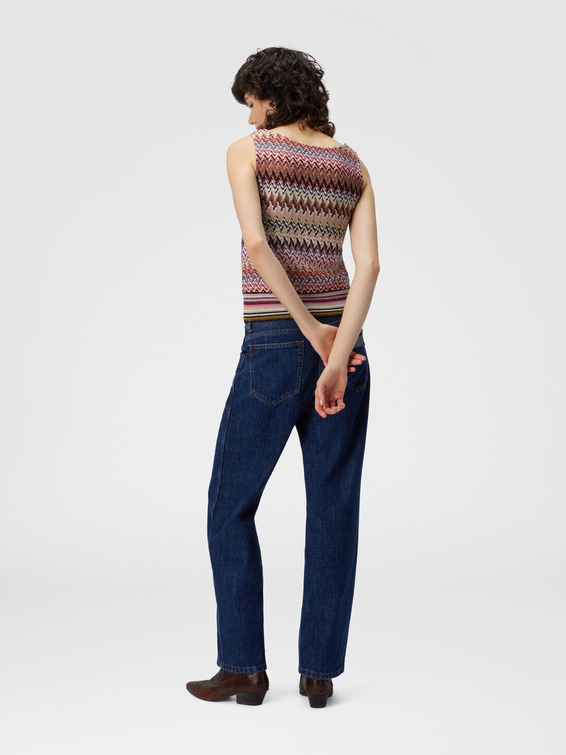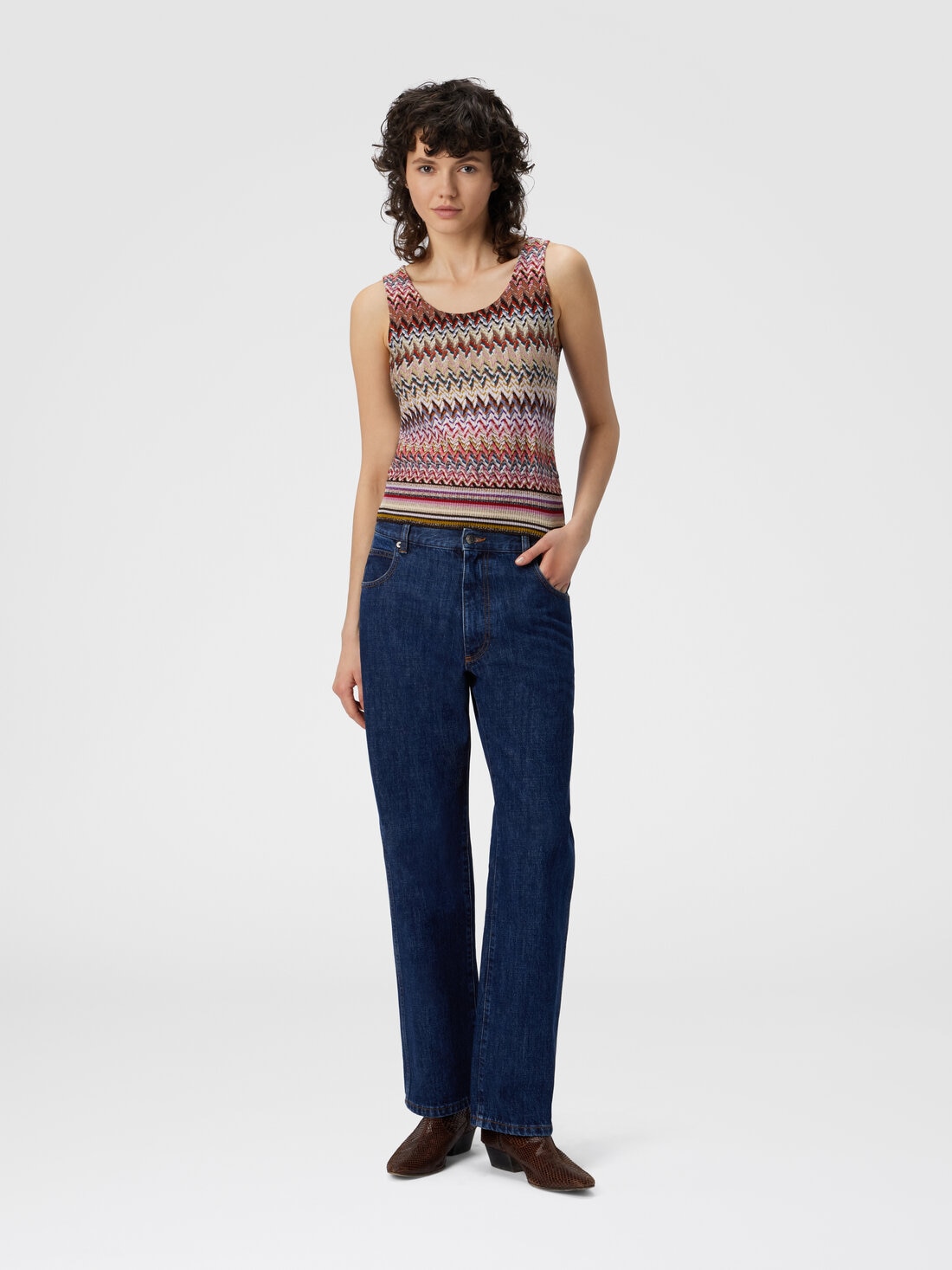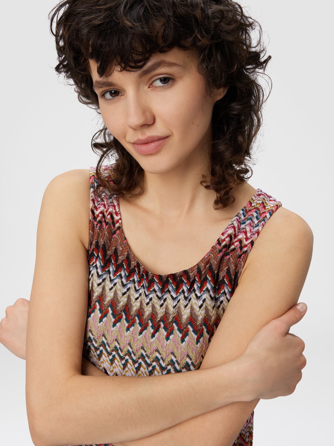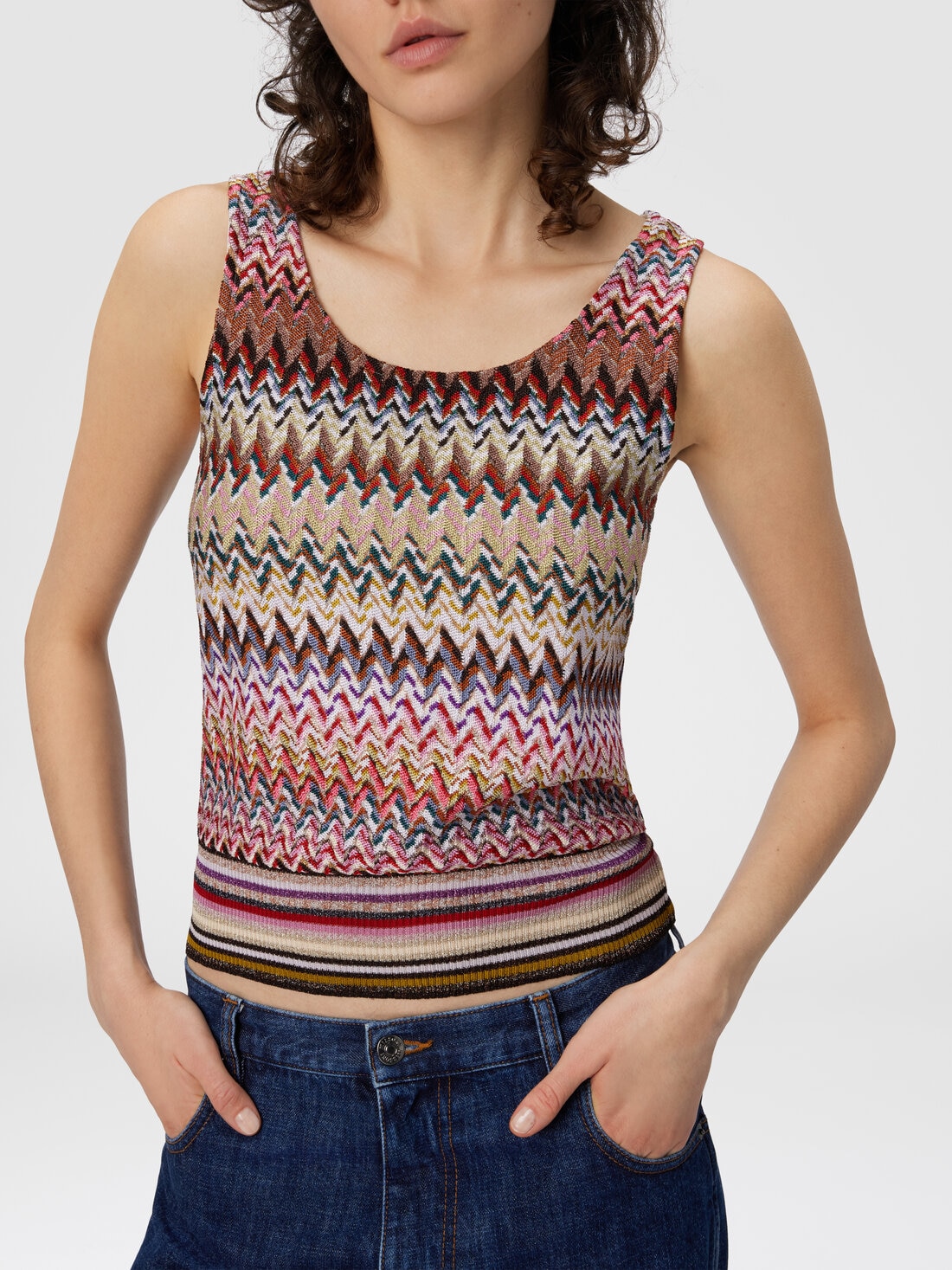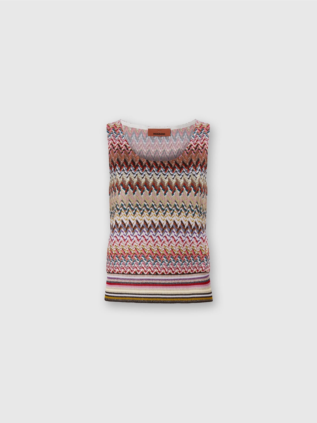 Elegant women’s tank top in viscose blend with lamé threads, enriched by raschel lace that recalls the classic Missoni zigzag pattern. The ribbed detail emphasizes the silhouette, while the metallic reflections add brightness to the piece.