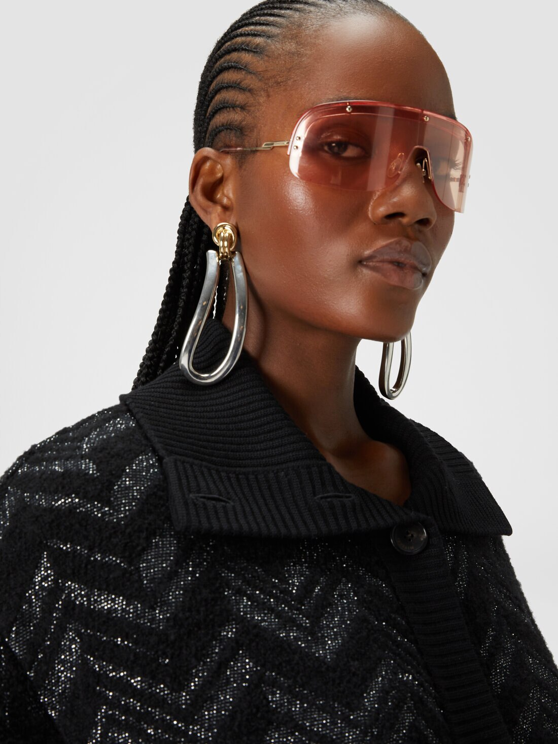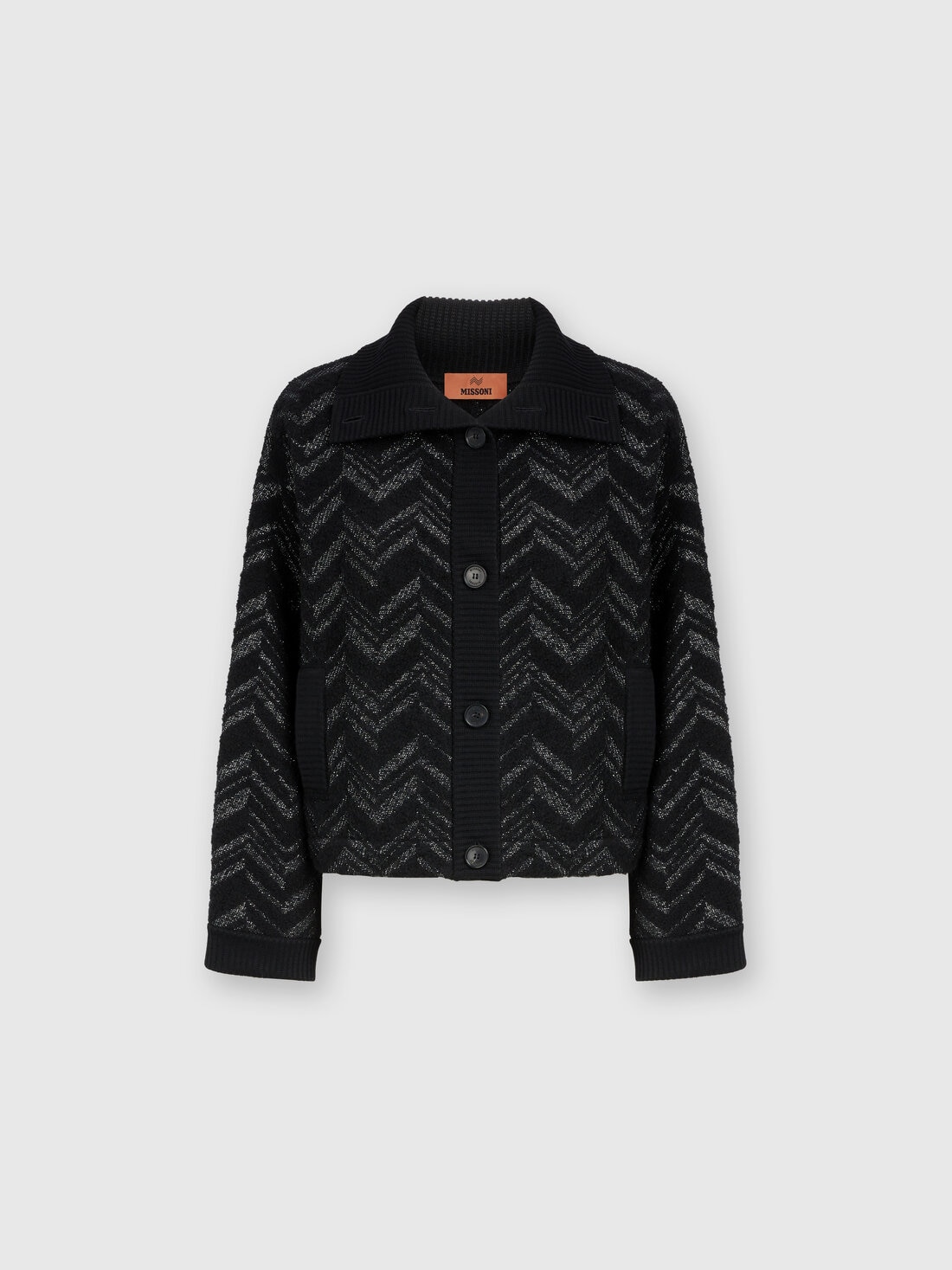 Boxy cut for the bouché jacket with maxi-chevron and lamé reflections. Finished with rib knit piping and a collar, the outerwear features custom buttons.