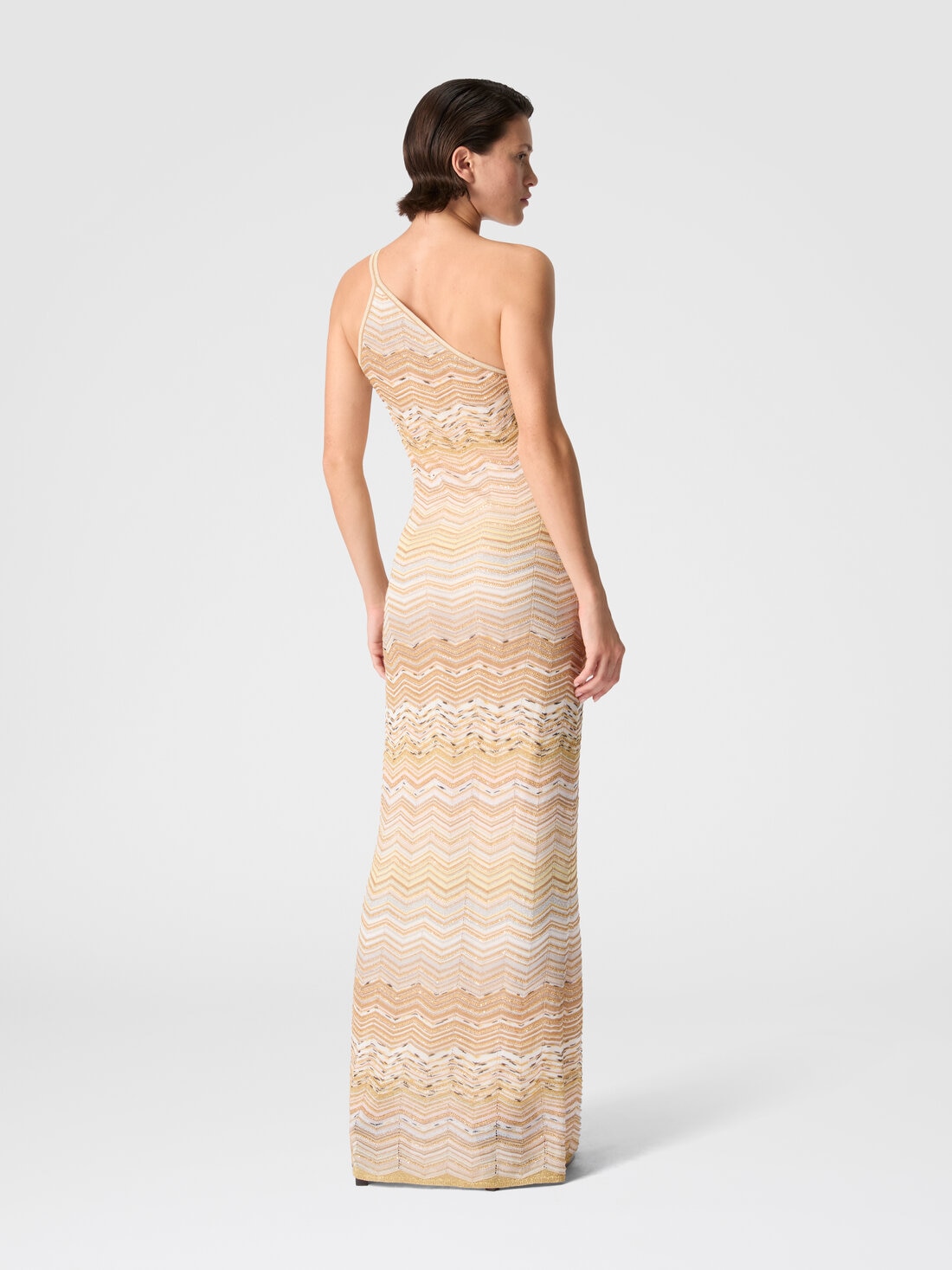 This long one-shoulder women’s dress in viscose lamé captures the light through sequins and the chevron motif that defines Missoni’s unmistakable aesthetic.