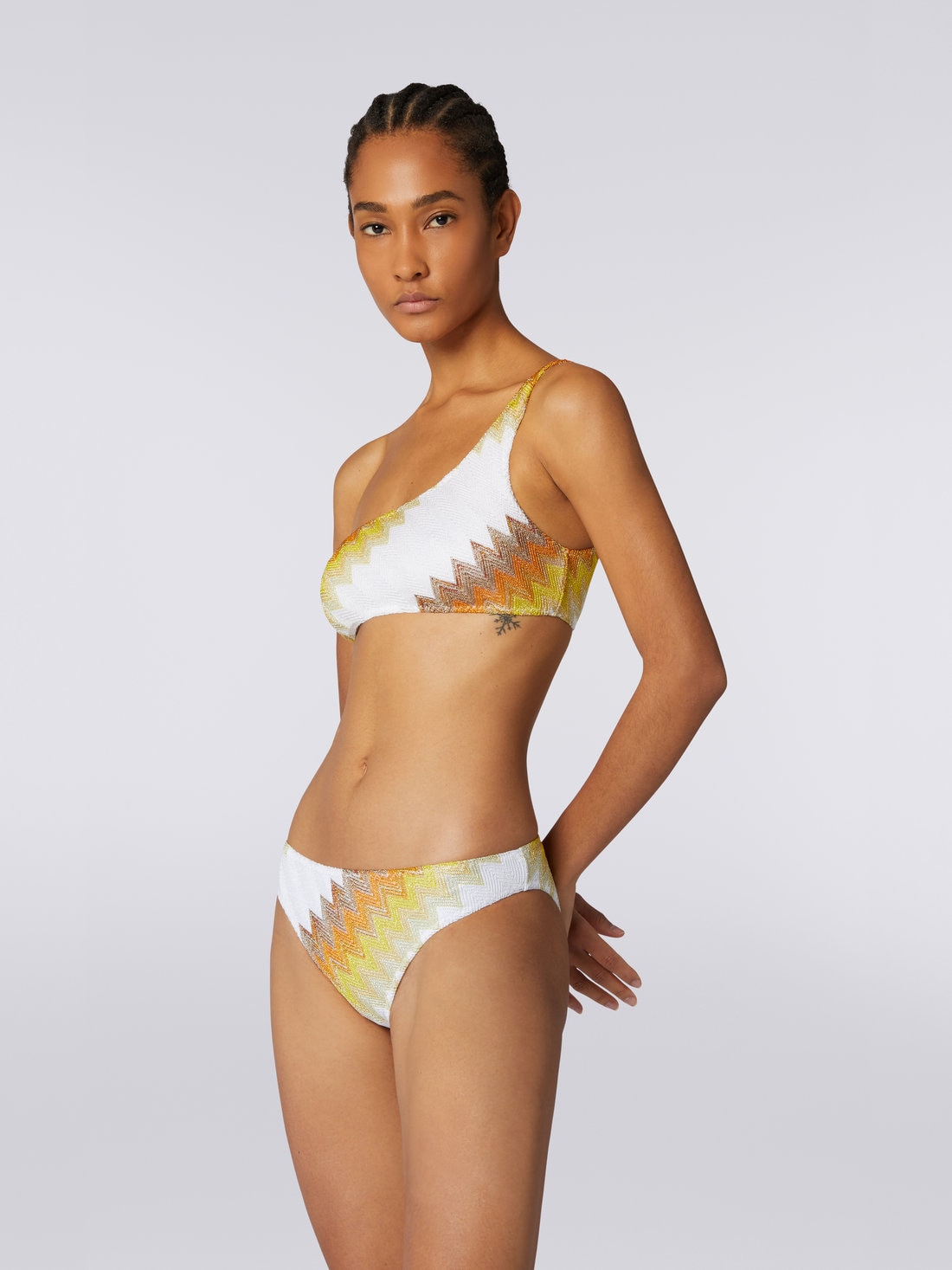 One-shoulder bikini with zigzag and lamé