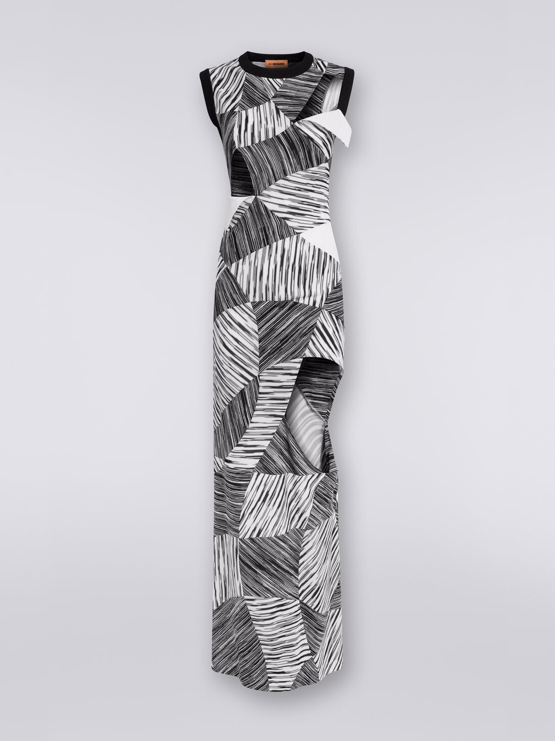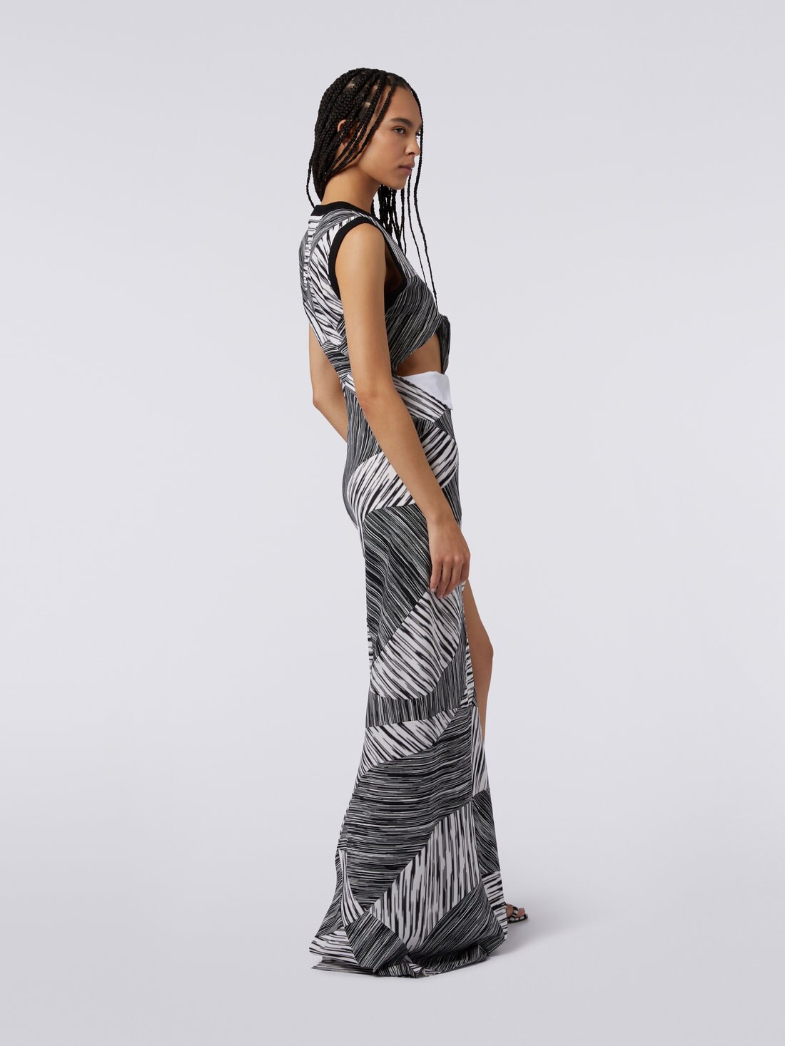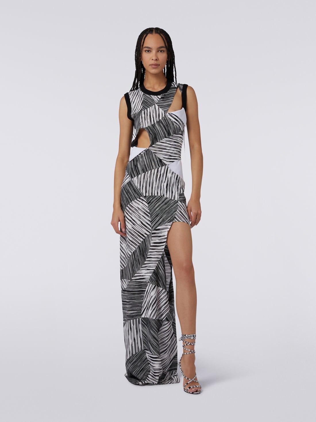 Constructed by assembling jersey and slub raschel inserts and plain stretch fabric, the women’s long dress surprises with its inventive design that leaves cut outs of skin uncovered on the bust and opens into a deep side slit.