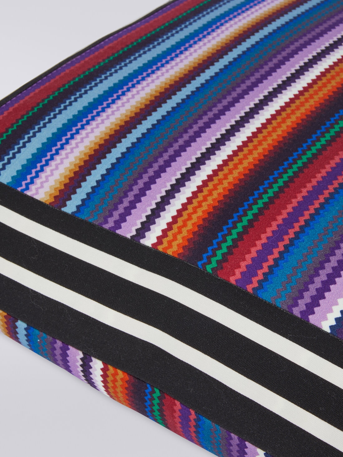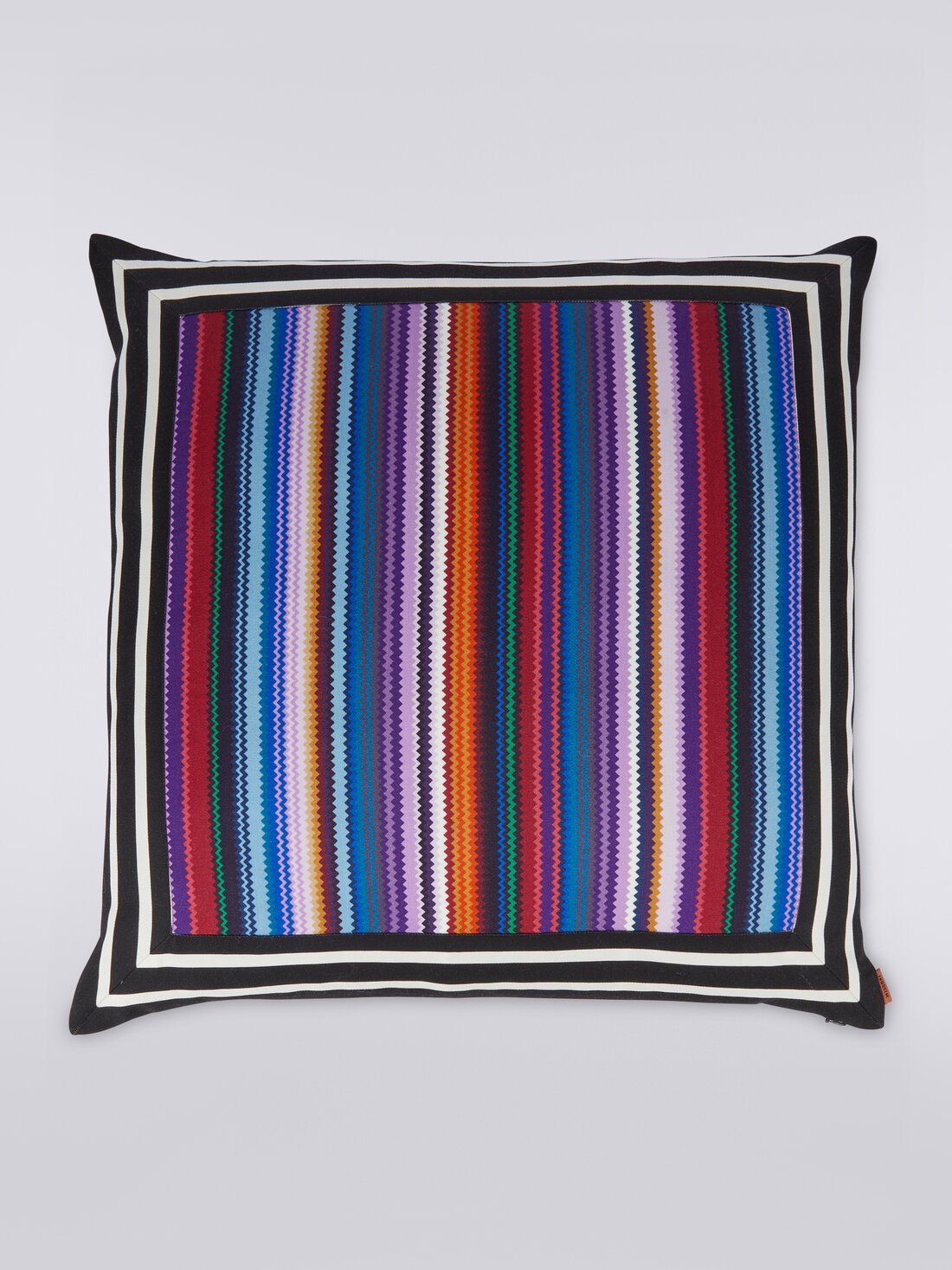 The Shangai 60x60 cm cushion is inspired by a foulard. Made of pure wool and framed by the striped trim that surrounds the zigzag pattern, this home accessory is an iconic addition, enriching any space with personality.