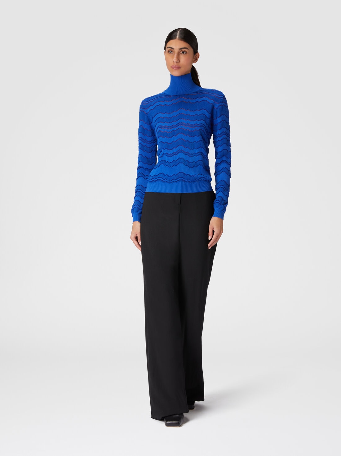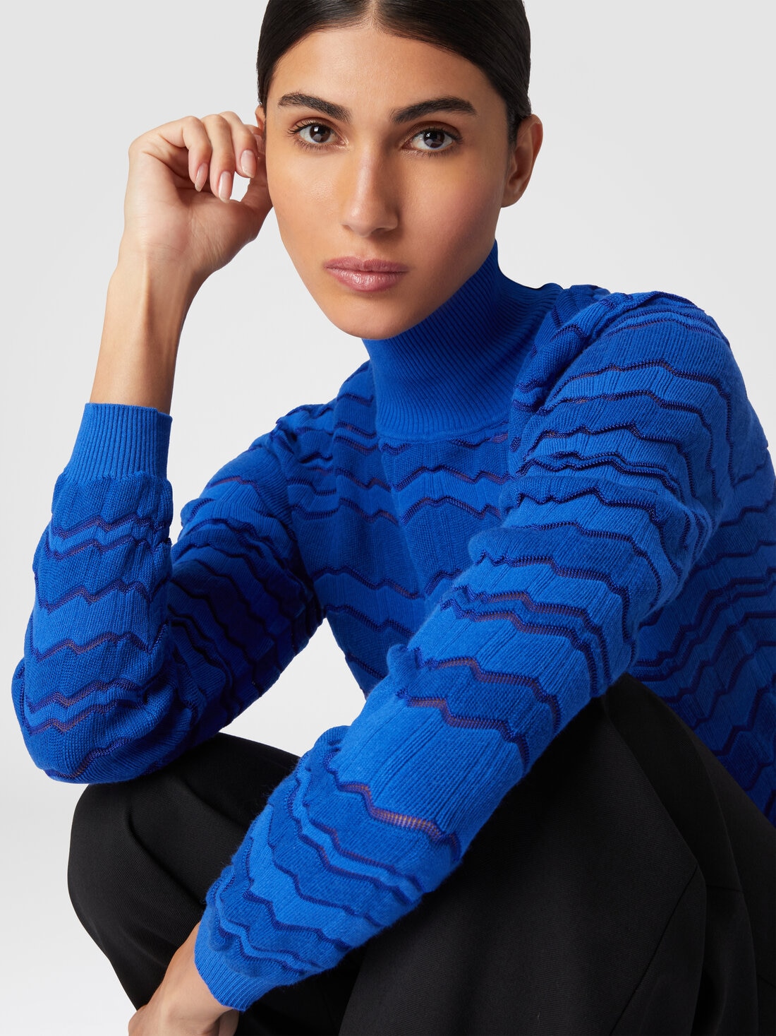 The irregular gait of the tone-on-tone zigzag ruffles the viscose and wool knit of the turtleneck. Smooth profiles complete the model.