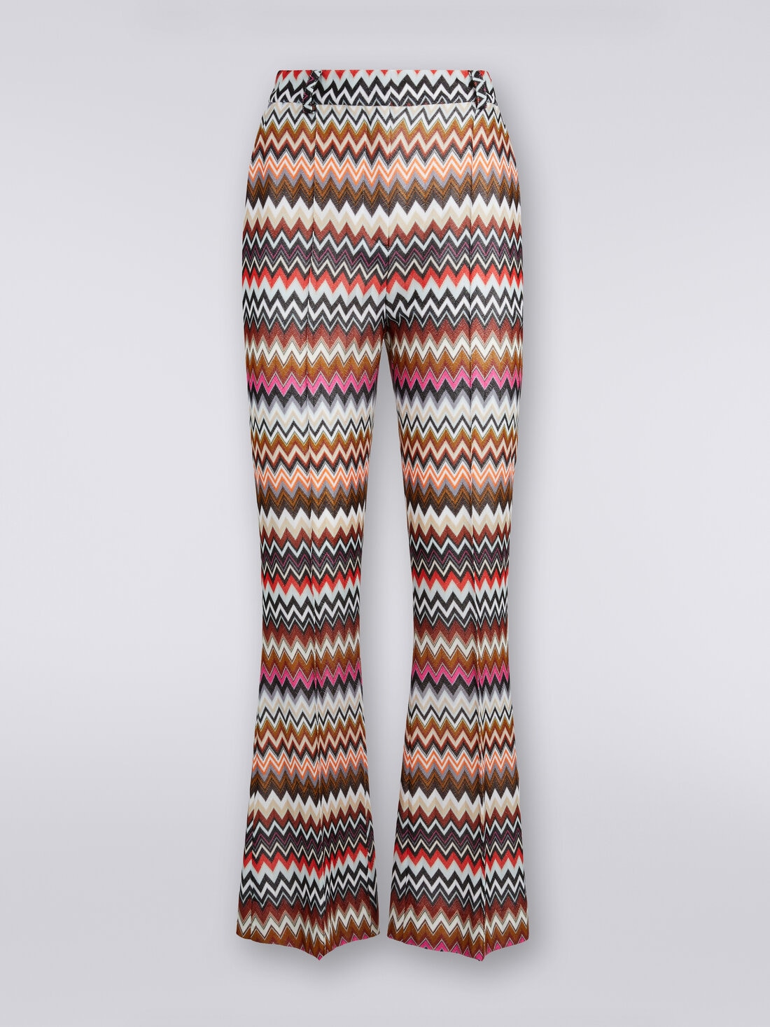 The women’s flare trousers, made by Missoni in viscose, offer an attractive and contemporary design. The piece, equipped with belt loops at the waist and an ironed crease, has a back welt pocket. The iconic multicoloured zigzag pattern gives them a lively and distinctive look, making them a versatile garment that fits perfectly with a casual or more formal look.
