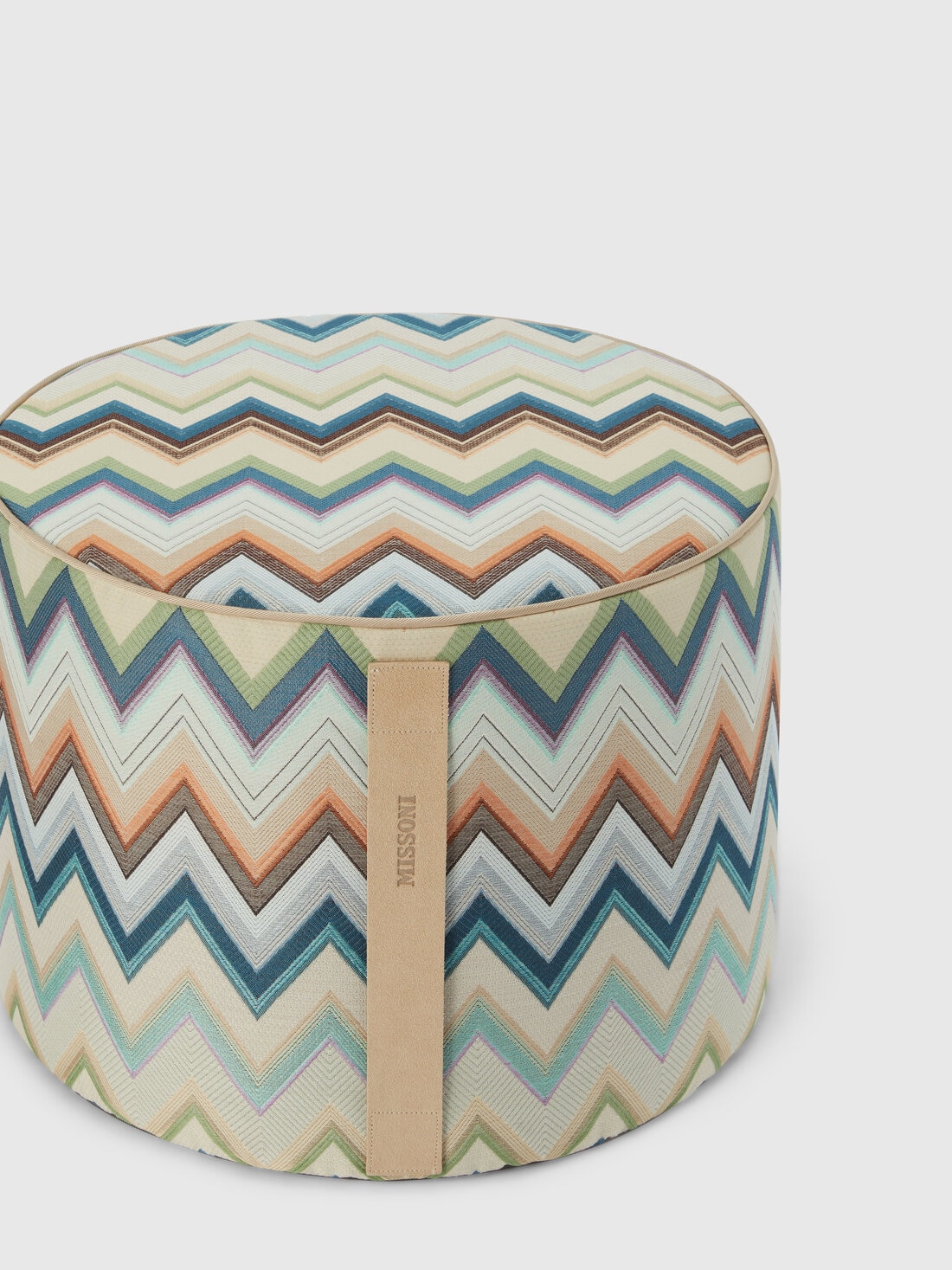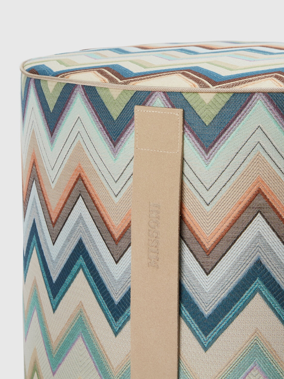 A chevron cotton blend fabric characterises the 40x30 cm Agadir cylindrical pouffe. Finished with tone-on-tone piping and personalised by the logo-printed label, this textile home furnishing accessory is made practical and manageable by the logo-imprinted suede handle.