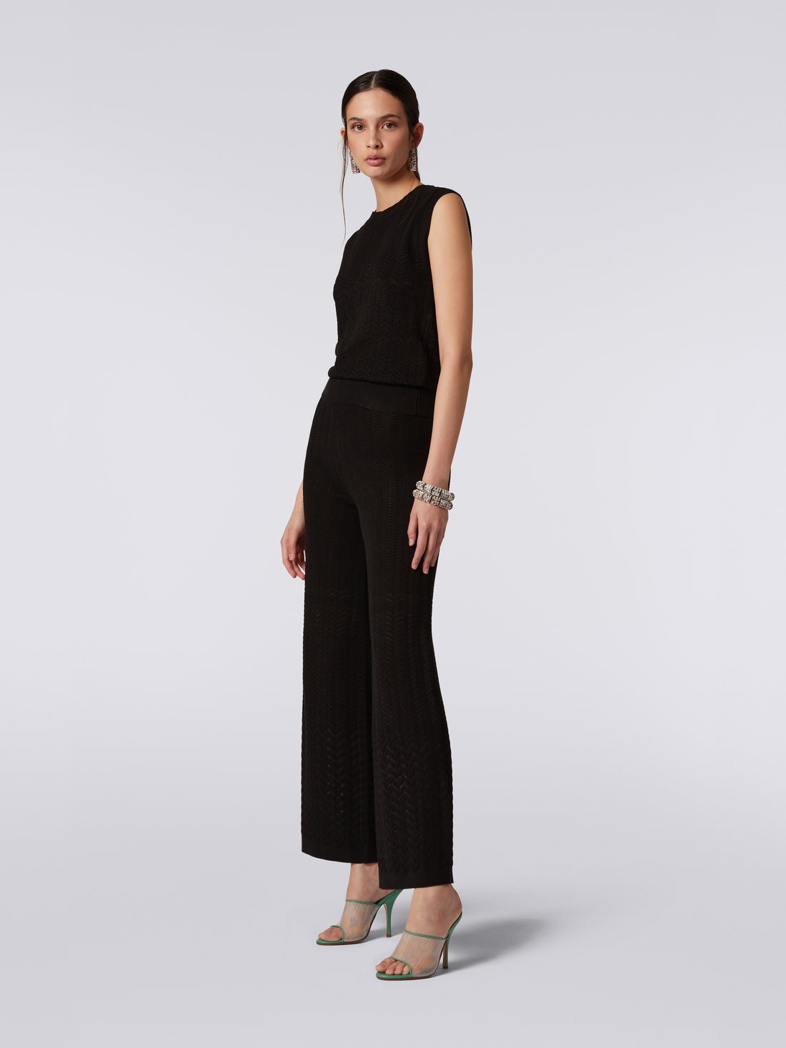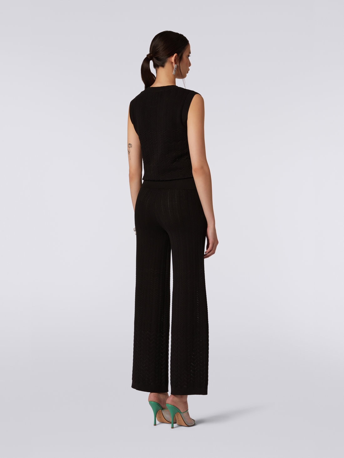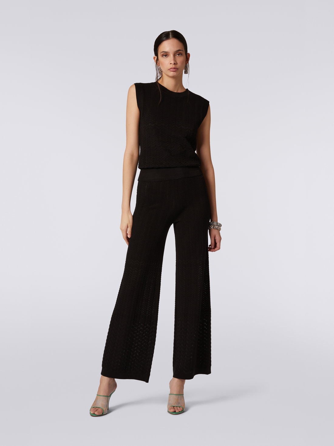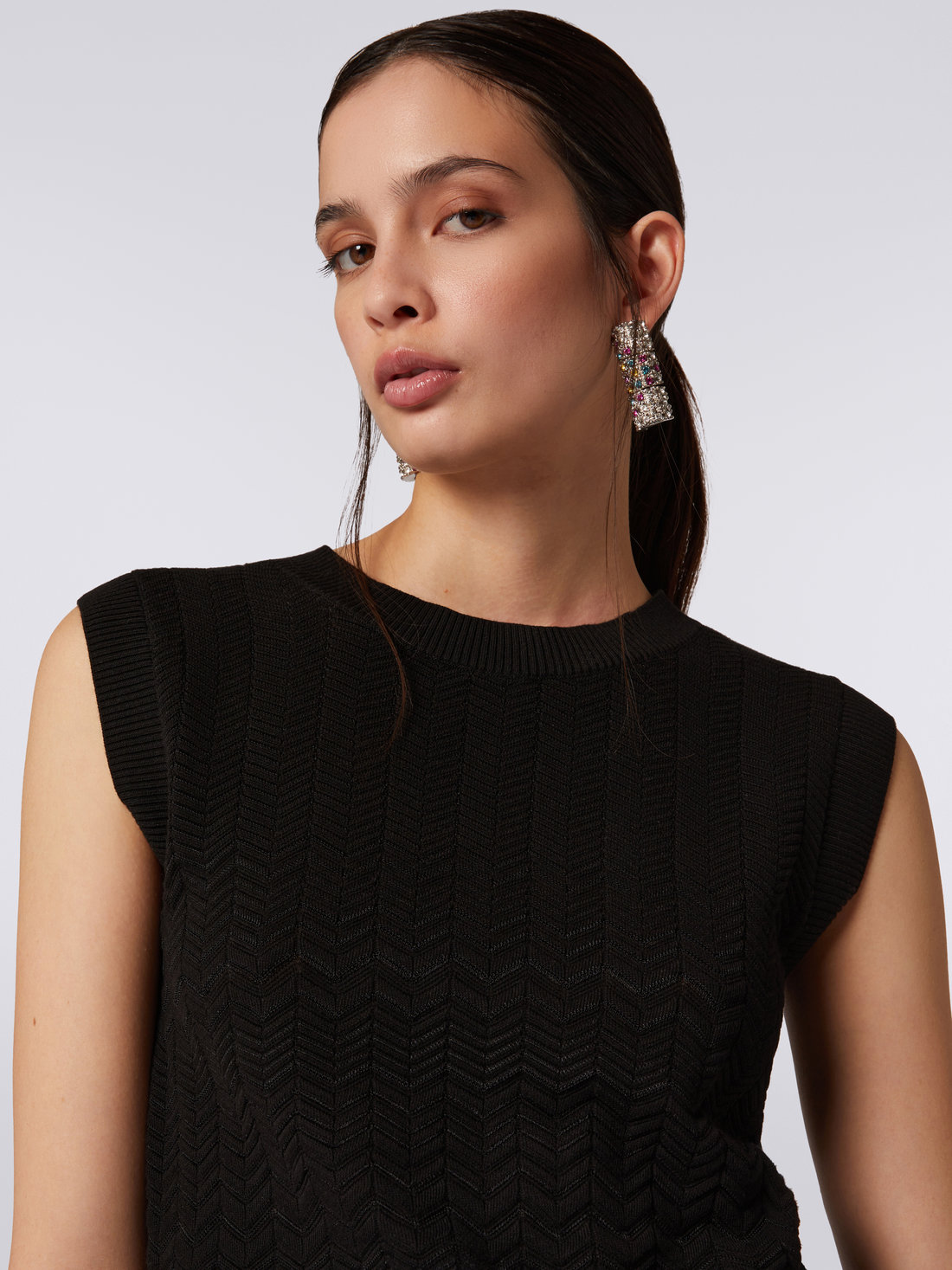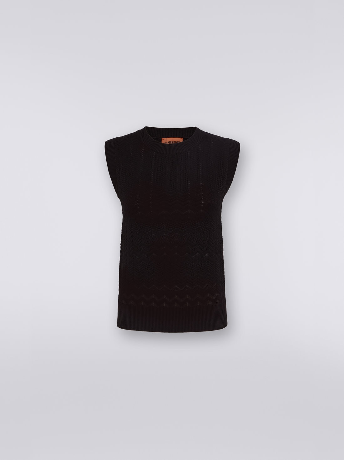 The iconic tone-on-tone zigzag chevron pattern characterises the women’s sleeveless crew-neck top. Made of a soft cotton and viscose blend, the garment features ribbed trim and a regular fit, emphasising its refined and versatile design.