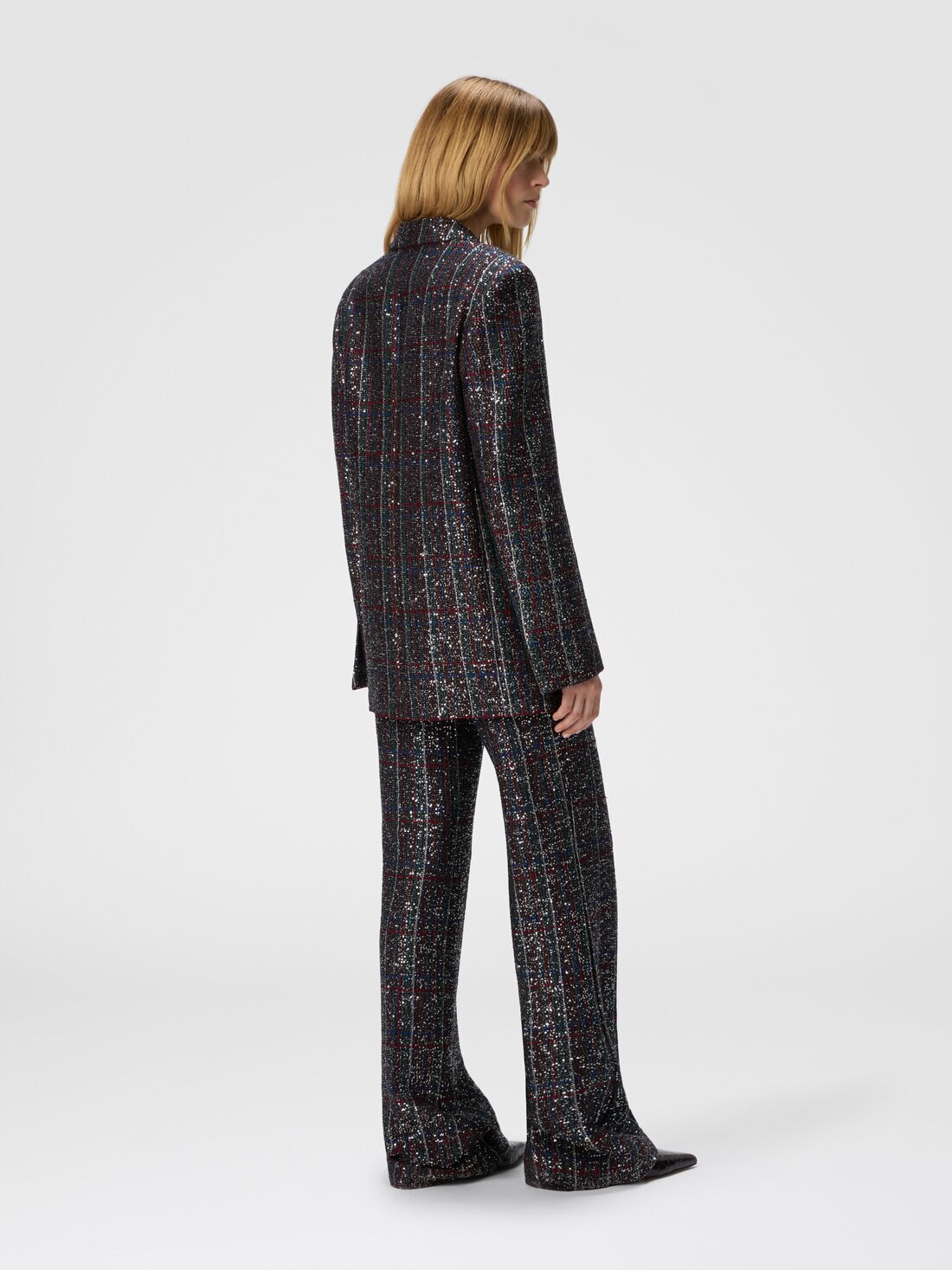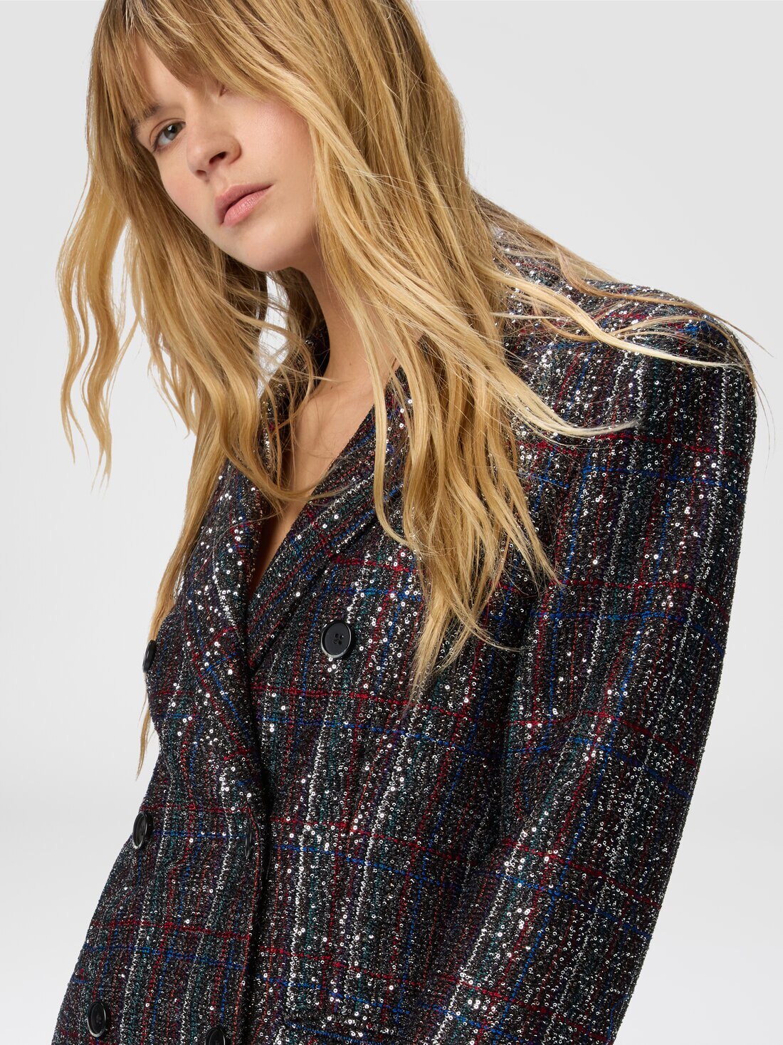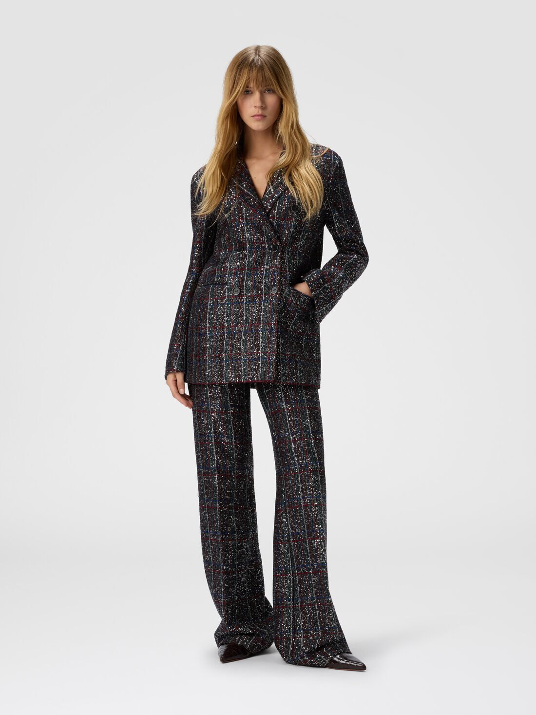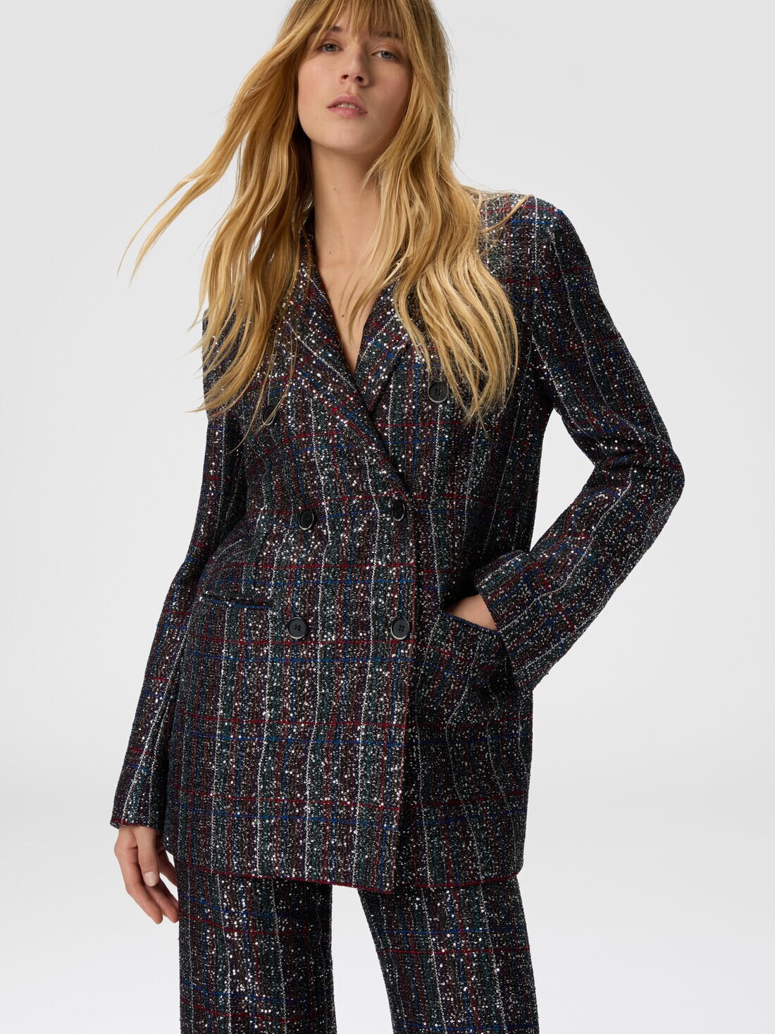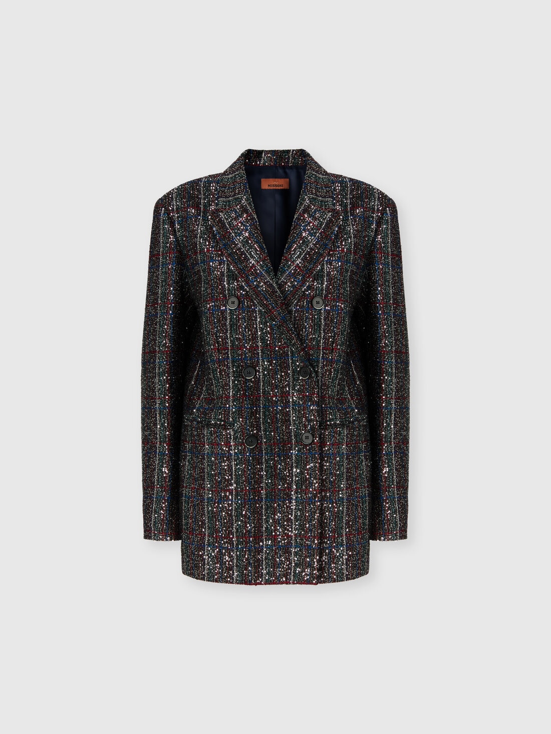 This double-breasted women’s blazer radiates bold elegance and luminosity, thanks to a Caperdoni-woven fabric that features a sophisticated check motif interlaced with lamé threads and sequins. The tailored structure is balanced by the brilliance of the fabric, striking the perfect chord between classicism and modern glamour. An iconic, refined piece for those who seek to stand out with style, character, and a touch of sparkle.