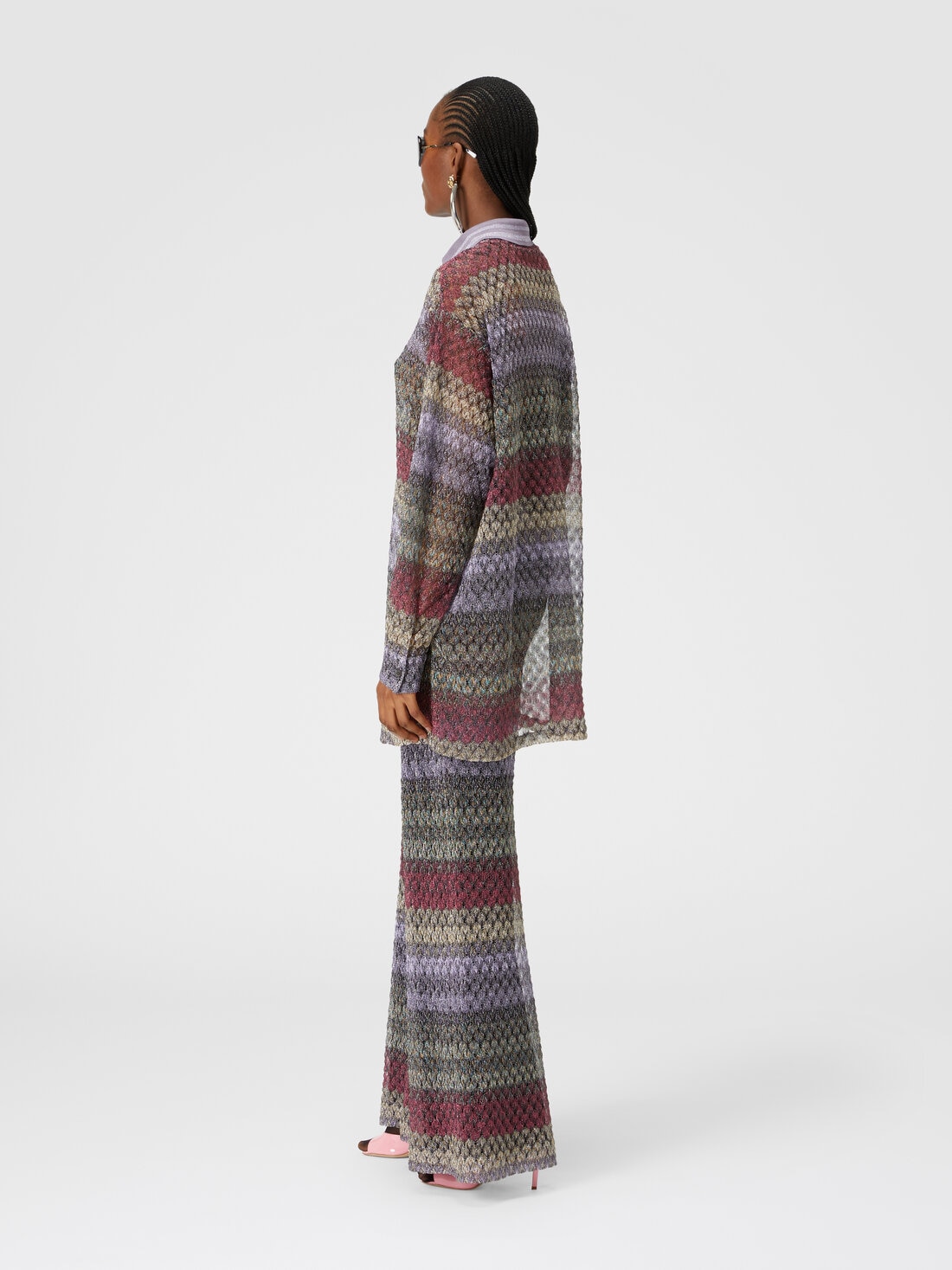 The oversized see-through shirt, with a contrasting knit collar, takes on a sumptuous bearing thanks to the precious lace raschel workmanship, illuminated by the glow of the lamé thread. For a garment that is the quintessence of luxury in a Missoni key.