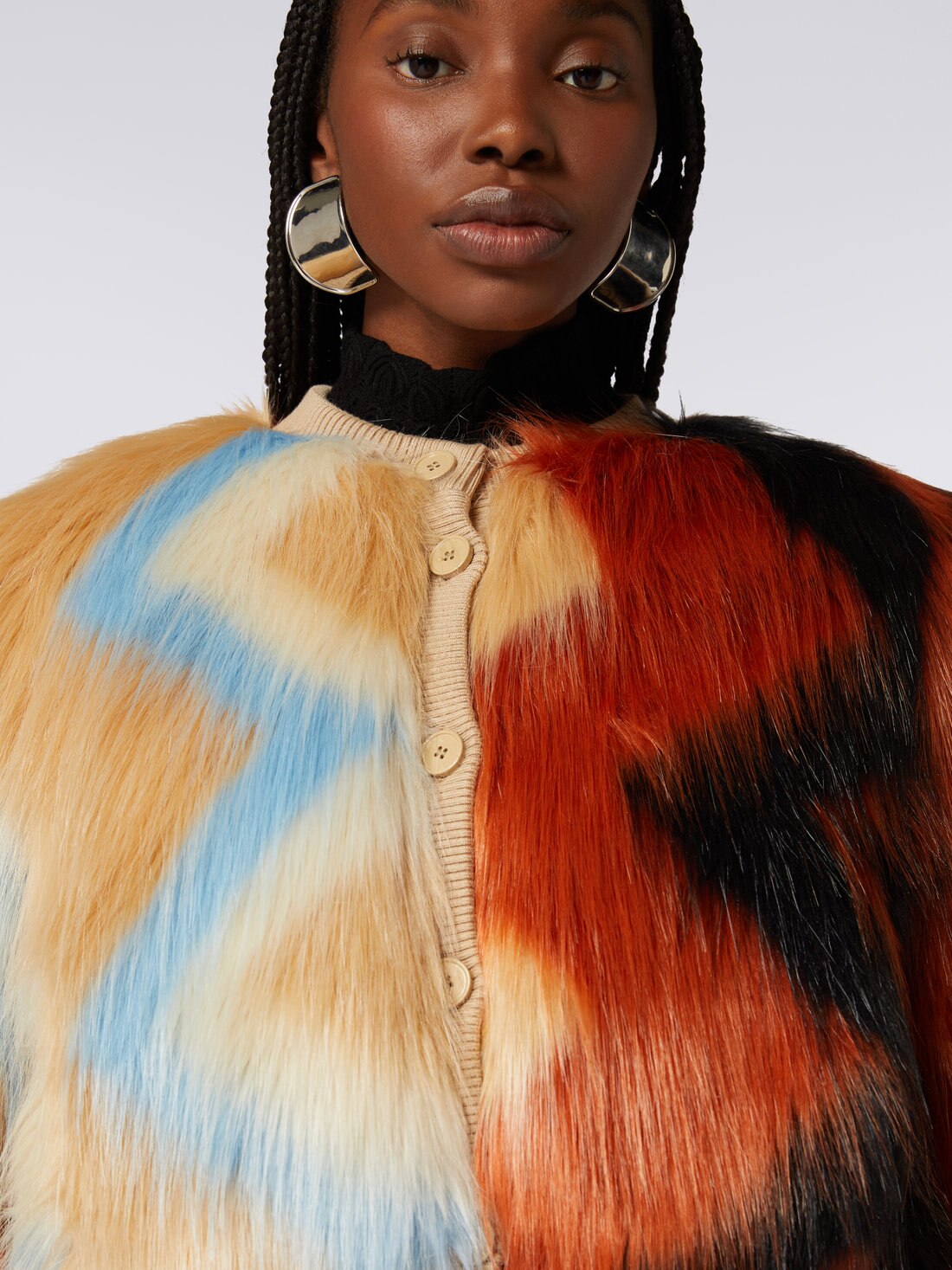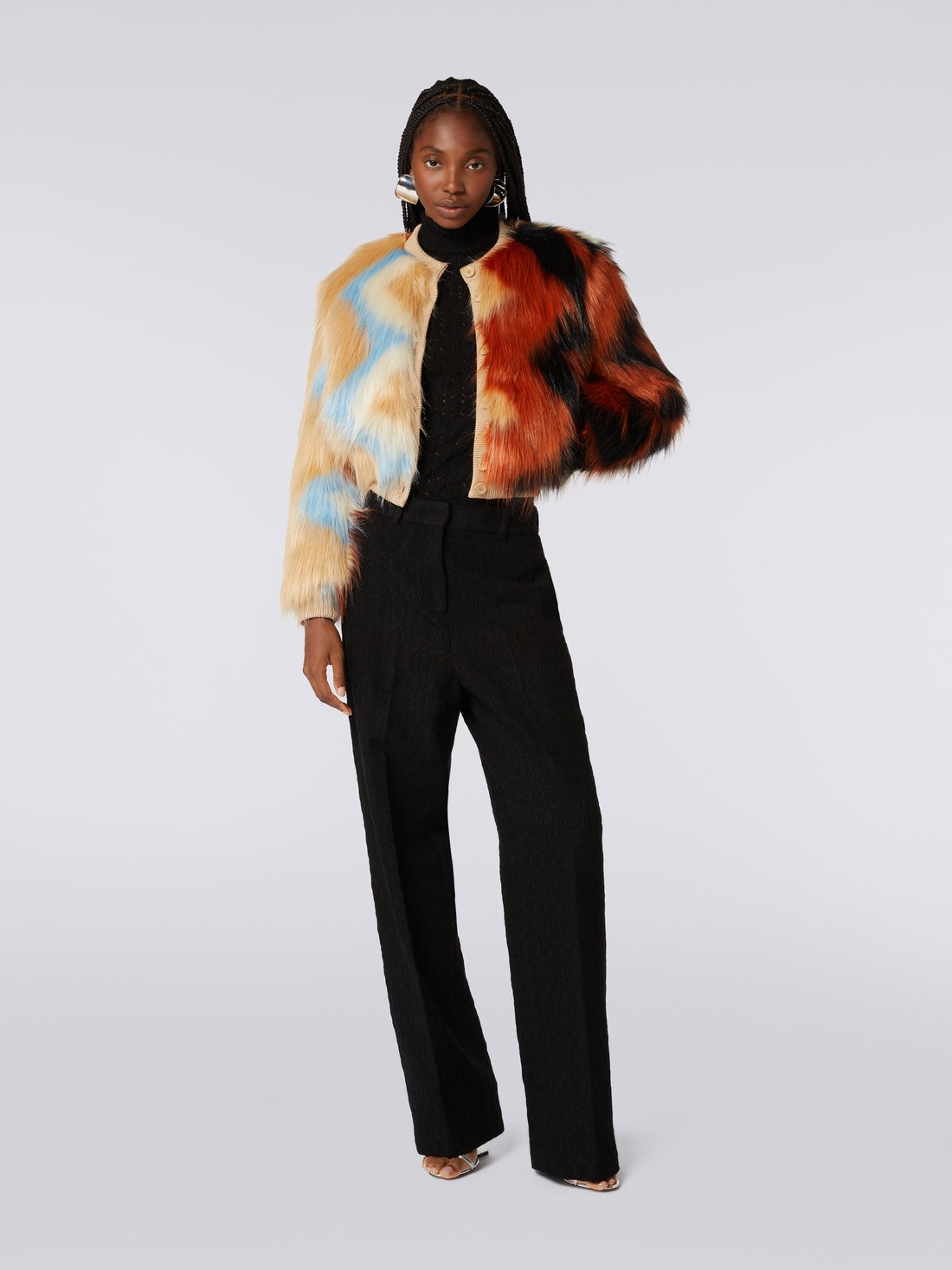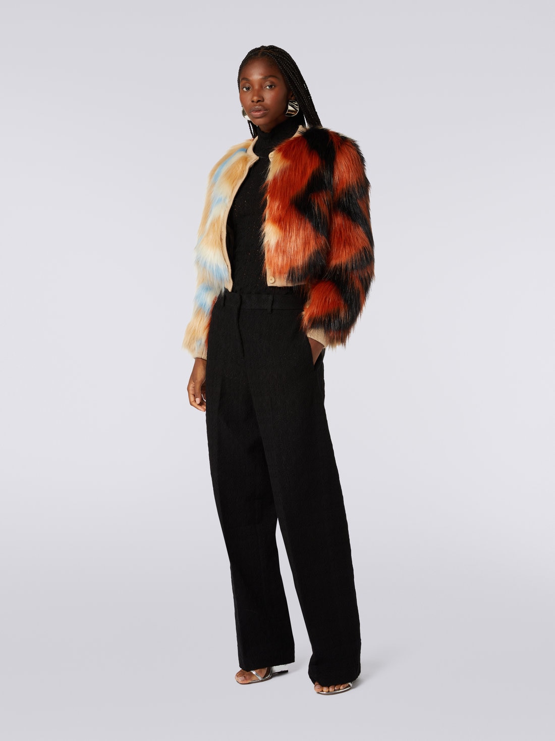 The women’s short faux fur bomber jacket is a refined interpretation of Missoni’s modernity and distinctive style. Characterised by a vertical large zigzag pattern, the garment is made with a jacquard technique that emphasises its unique design. The plain ribbed trim lends a touch of elegance, while the button fastening adds practicality to the outerwear.