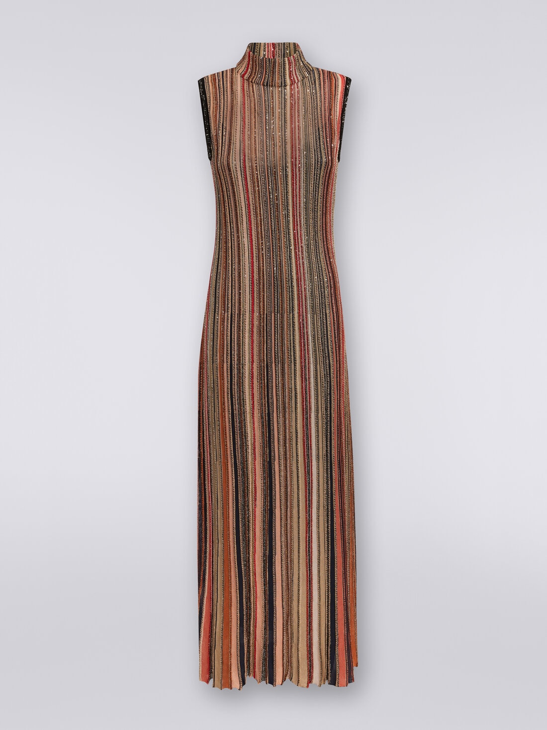 The women’s long sleeveless dress comes down to the ankle. Made of viscose blend knit, the turtleneck piece with cut-out detail on the back is customised by the vertical striped pattern with sequin appliqués.