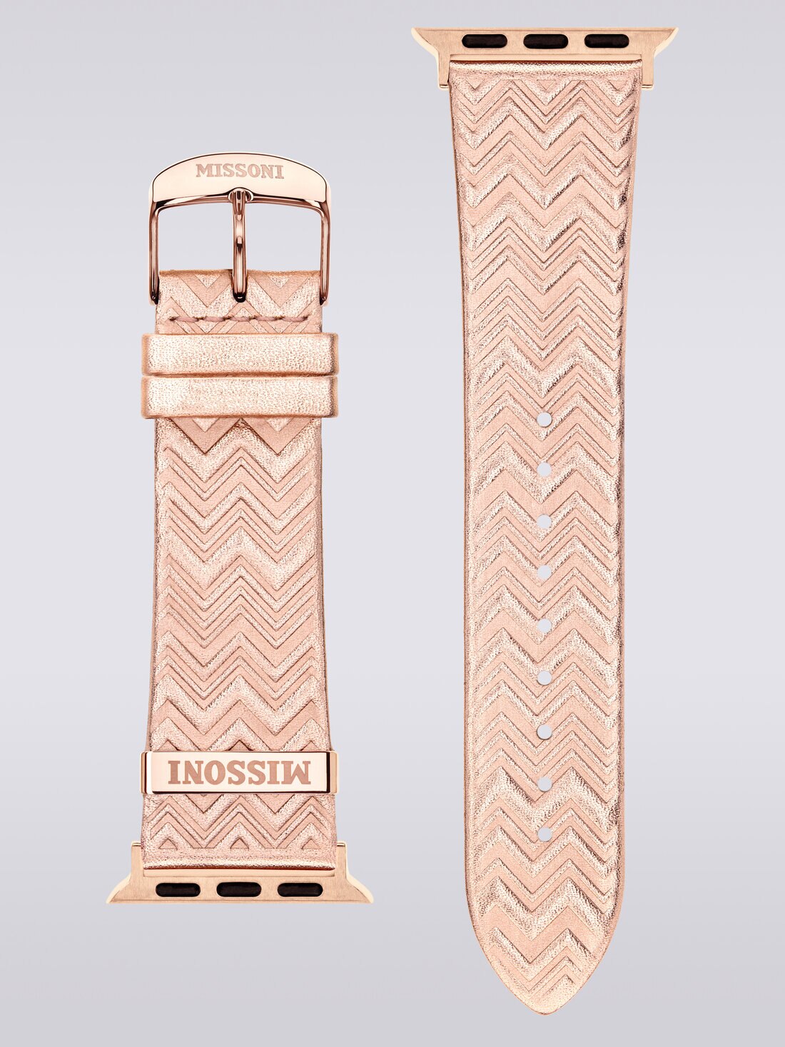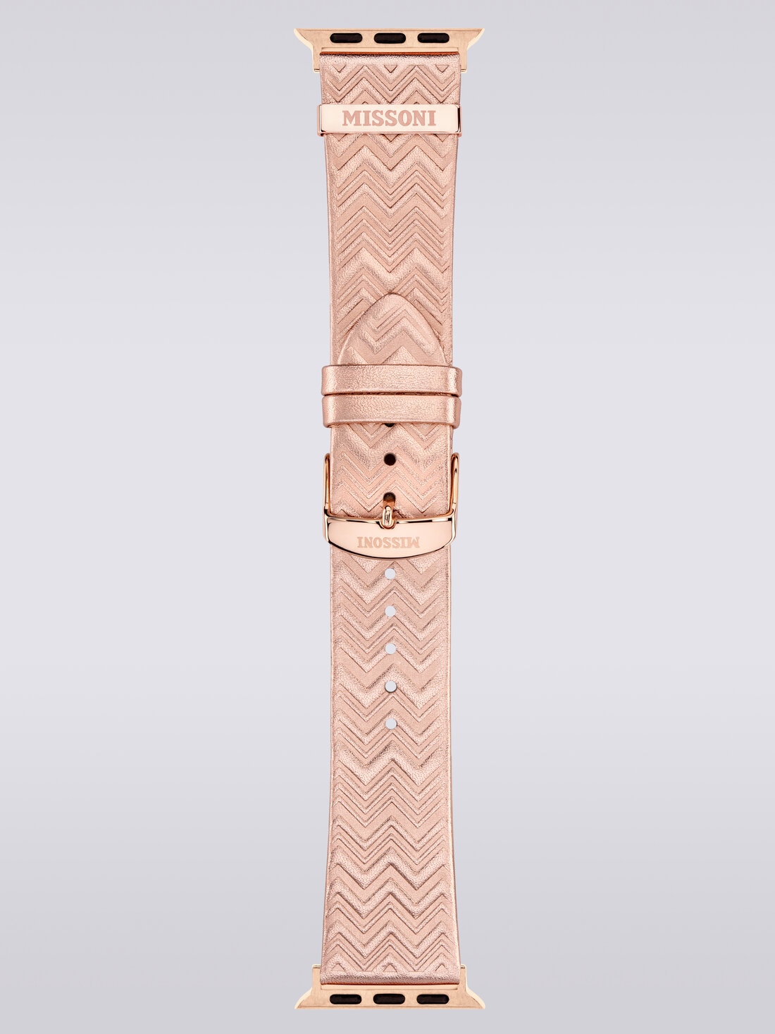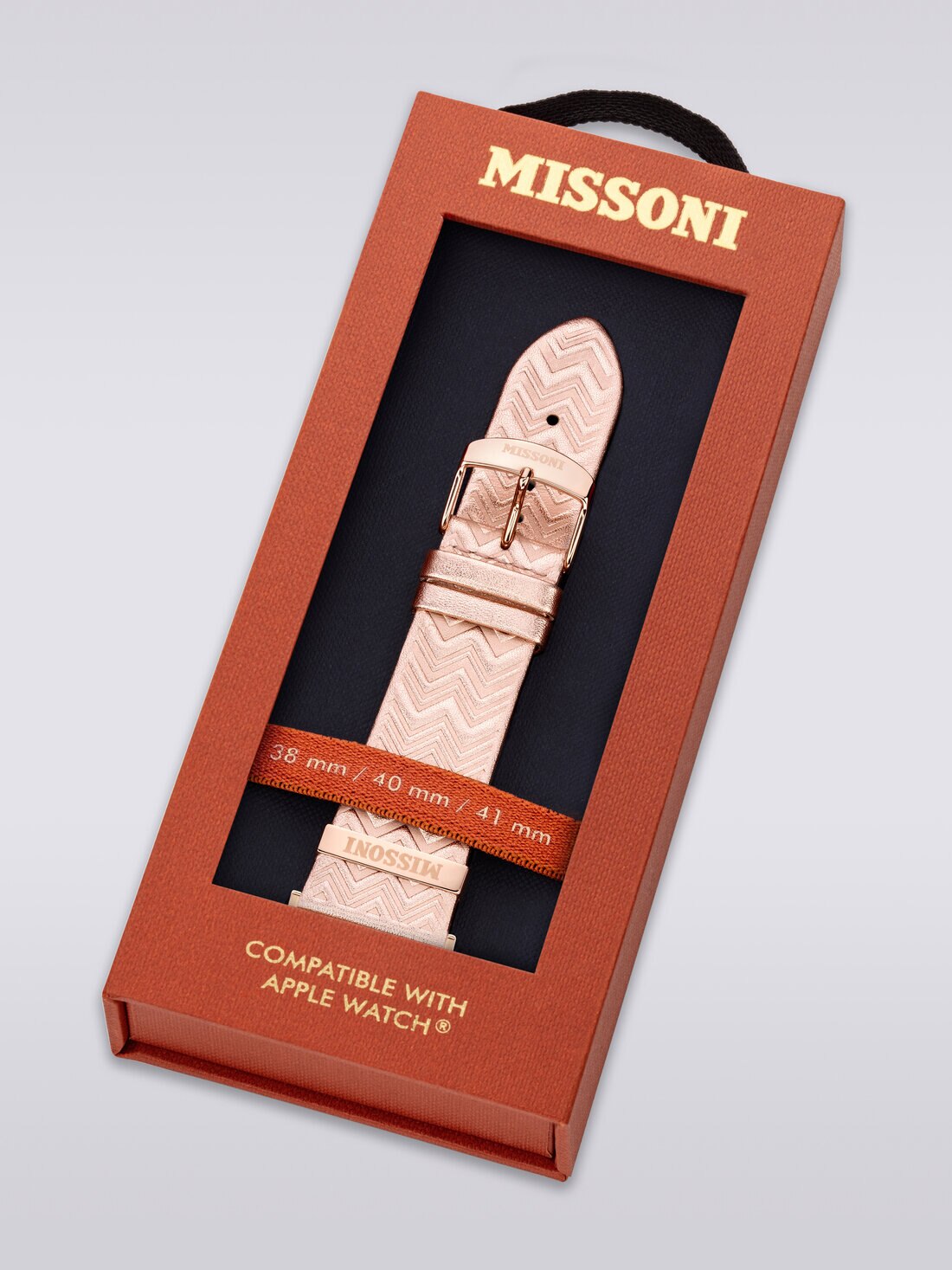 Skillfully combining fashion and technology, the collection of Missoni bands for the Apple Watch© transforms the timepiece into the perfect accessory for any occasion. Featuring the signature embossed chevron motif and the Missoni lettering at 12h, the strap adds a touch of personality and color to any outfit. The band is compatible with Apple Watch© up to Series 8 and it is designed for 38 mm, 40 mm and 41 mm case sizes.