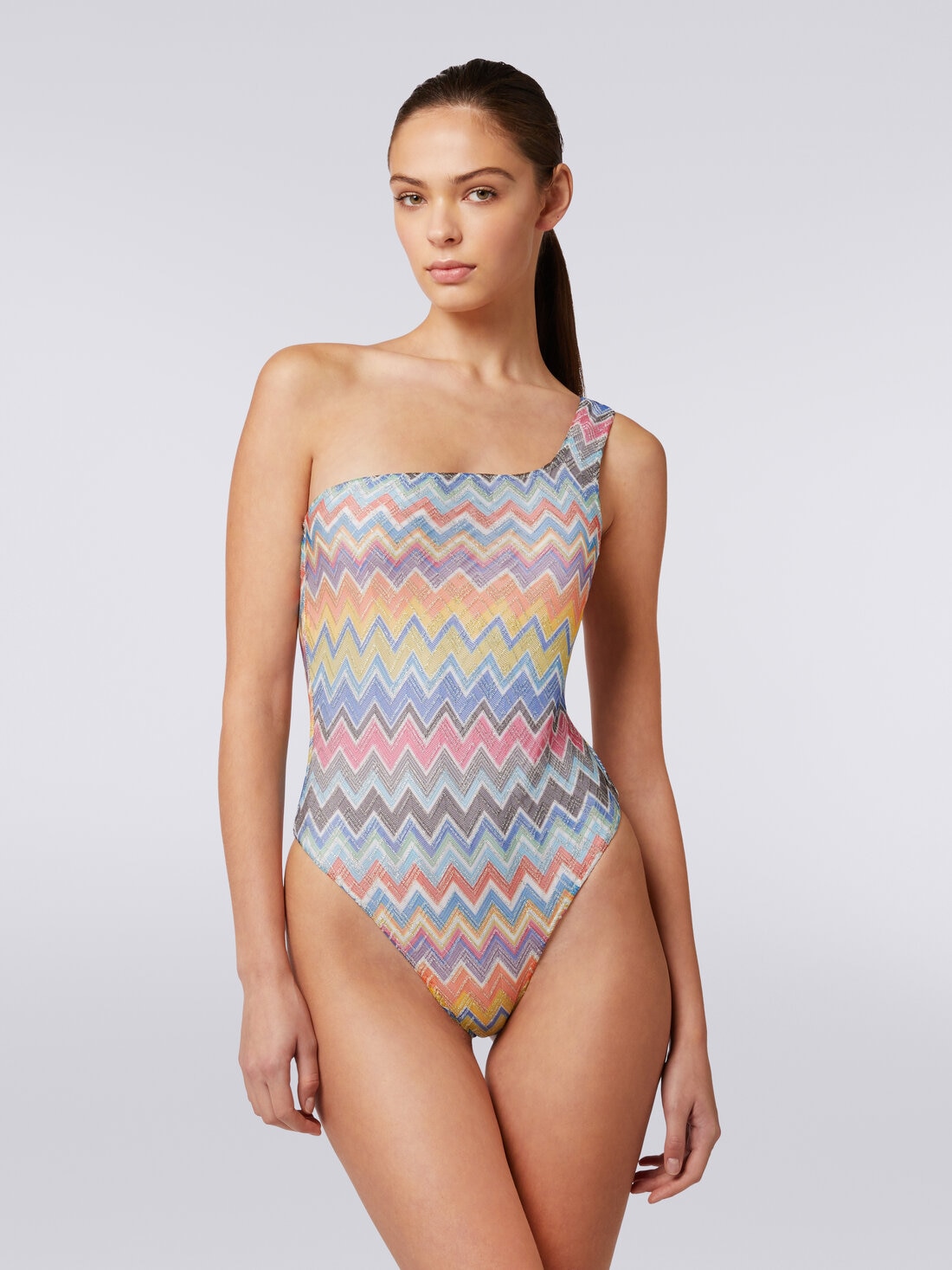 In addition to being a beachwear garment, the one-shoulder women's one-piece swimming costume is Missoni's interpretation of a summer classic. The viscose-blend fabric is enriched with a lively zigzag print with lurex, making it perfect for showing off an elegant style even after sunset.