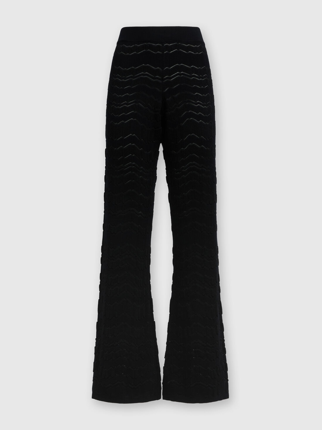 The irregular gait of the tone-on-tone zigzag ruffles the viscose and wool knit of the flared trousers. Elastic waistband and smooth hem complete the design.