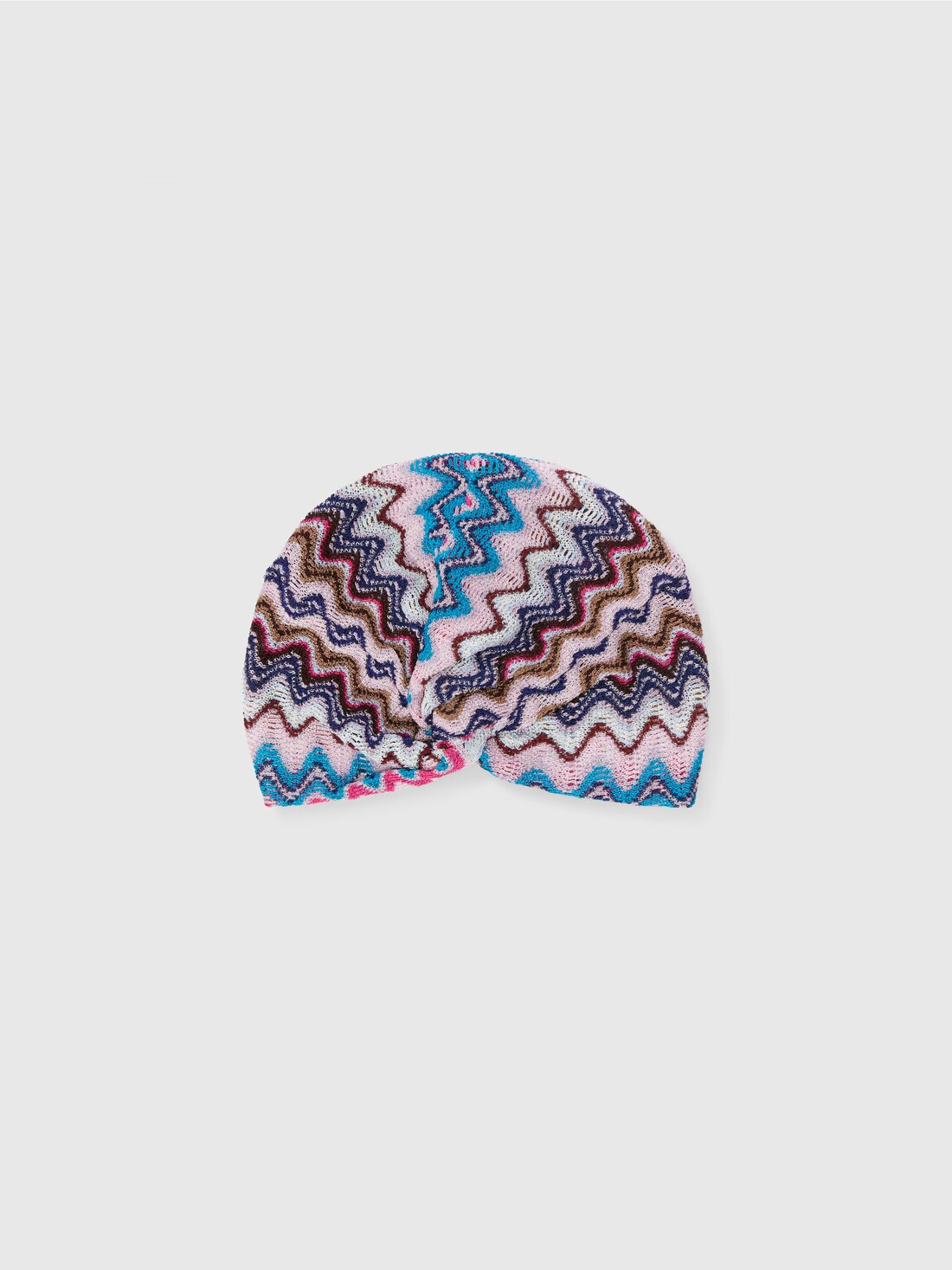 Gathered from the central knot, which constitutes the most visible decorative motif, here is the viscose turban by Missoni. The chevron workmanship makes this accessory immediately recognizable and iconic.