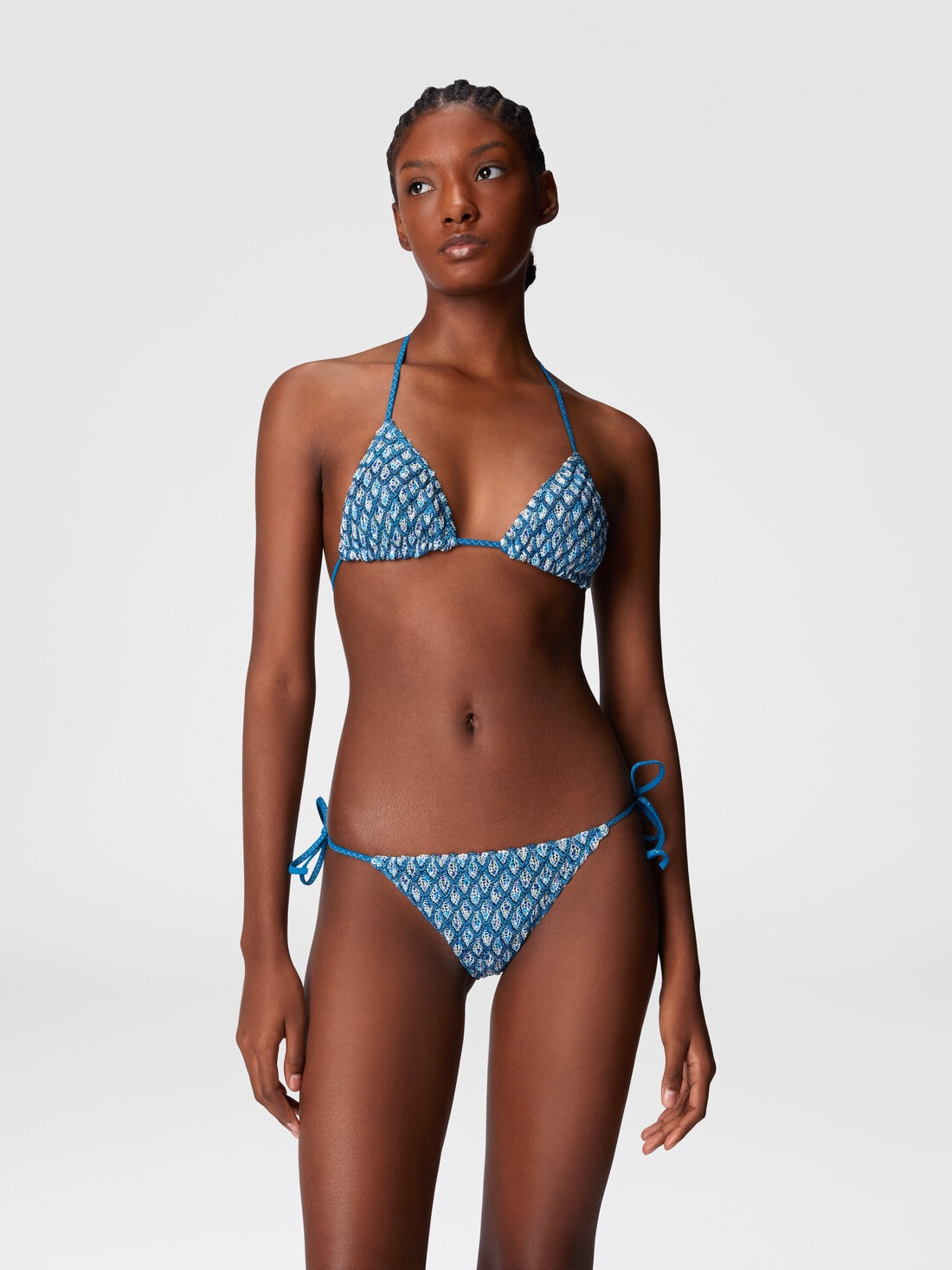 Triangle bikini made of viscose with shell motif and lamé details. The delicate design of the pattern, enriched by metallic reflections, gives the garment a luminous and distinctive elegance, enhancing the silhouette with a sophisticated touch.