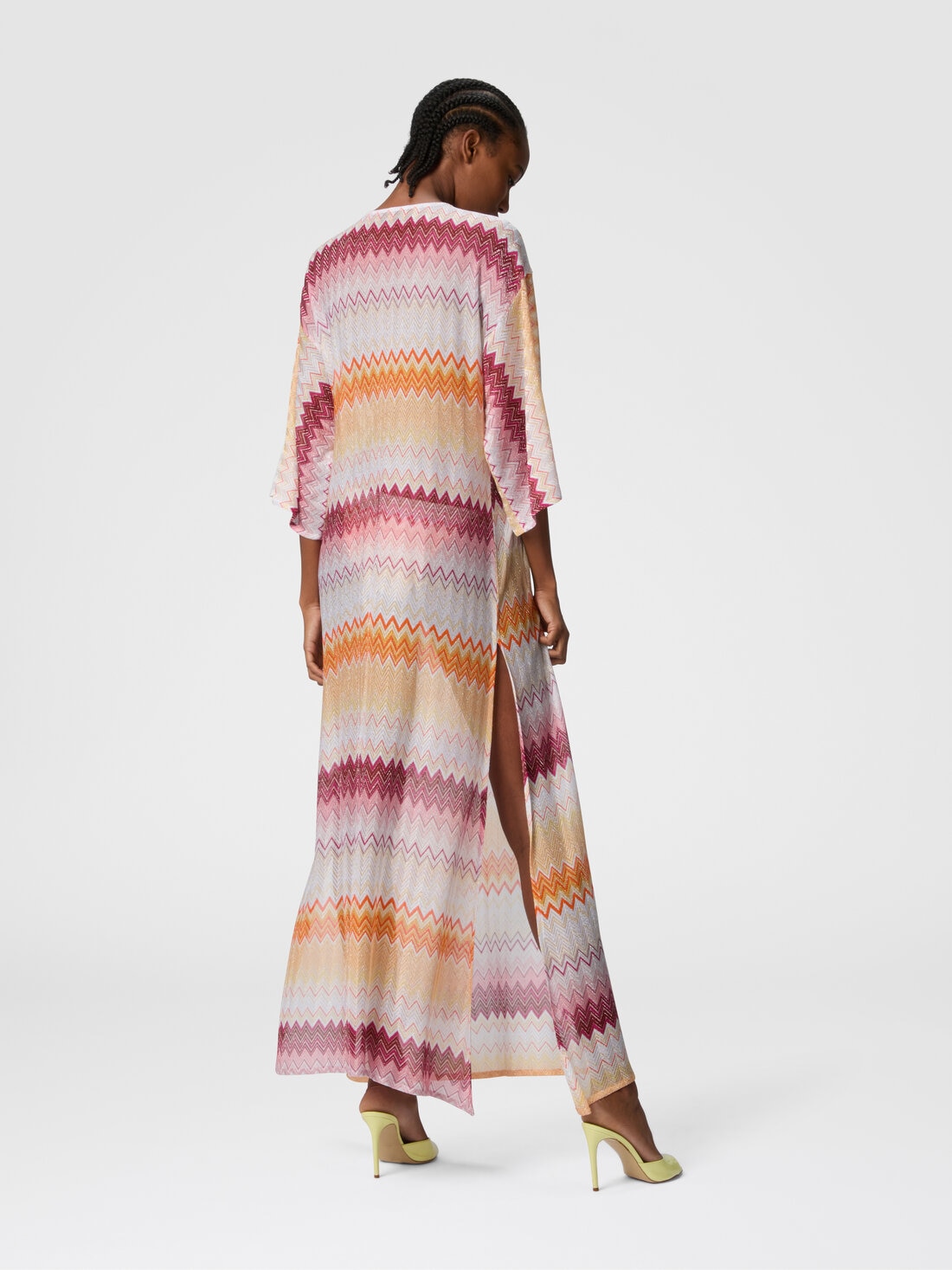 From Missoni's exotic heritage, the long cover-up caftan in viscose blend embodies the timeless elegance of the maison. The zigzag pattern intertwines with the metallic reflections of the lamé, creating a harmony of light and color. The plunging V-neckline, embellished with laces that add movement and dynamism, enhances the silhouette with a touch of sophisticated sensuality.
