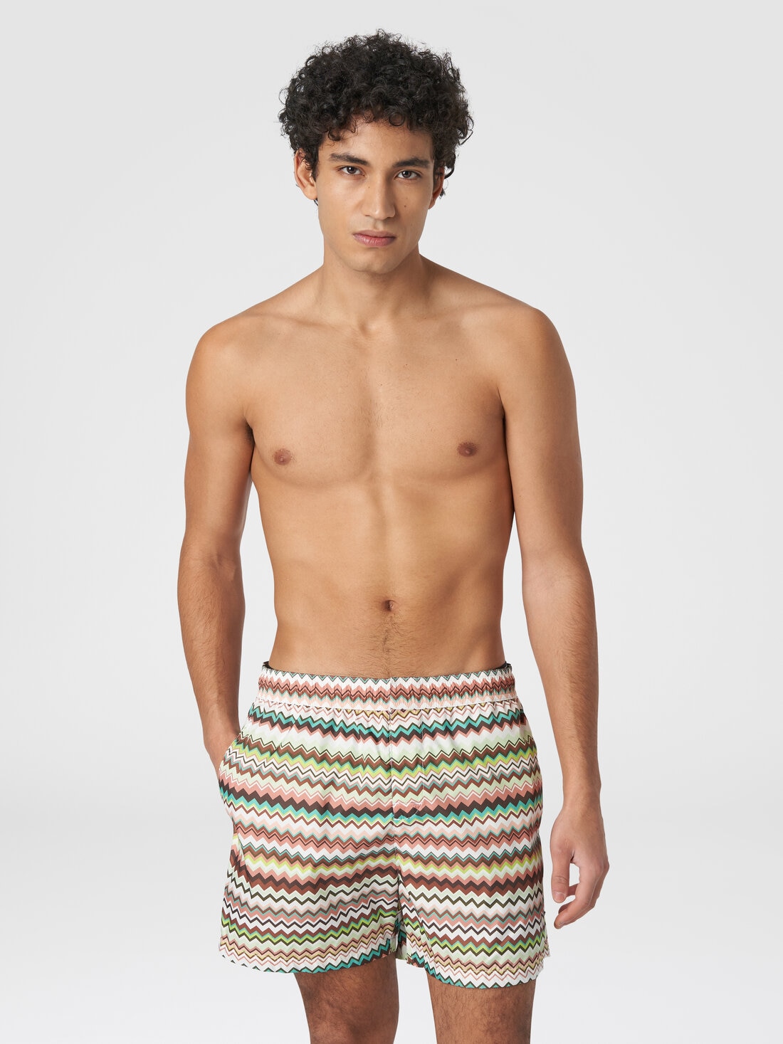 The characteristic optical effect of the zigzag print gives the men’s swim shorts a novel and contemporary touch. Made of a versatile, durable technical nylon, the shorts feature an elasticated waistband, side pockets and a back patch pocket with flap.